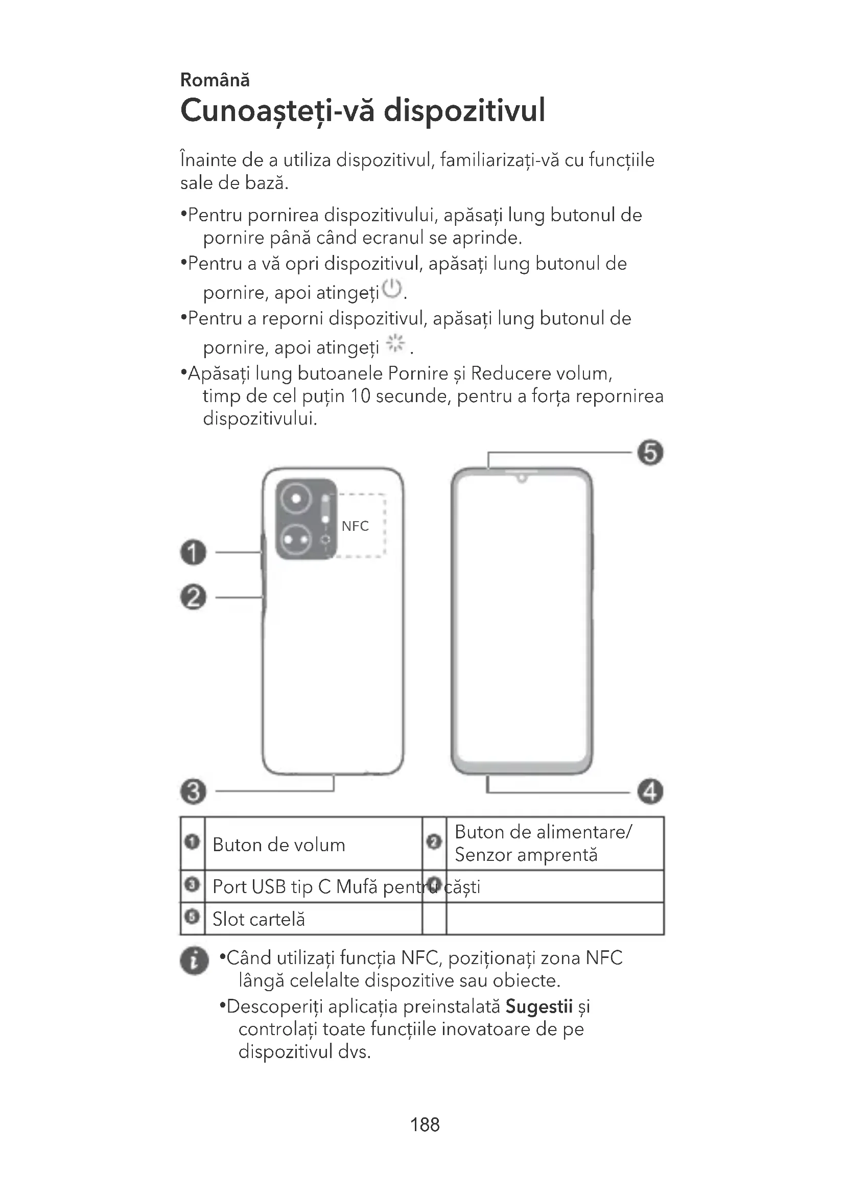 - Descoperiți aplicația preinstalată Sugestii și controlați toate funcțiile inovatoare de pe dispozitivul dvs. 188Introducere