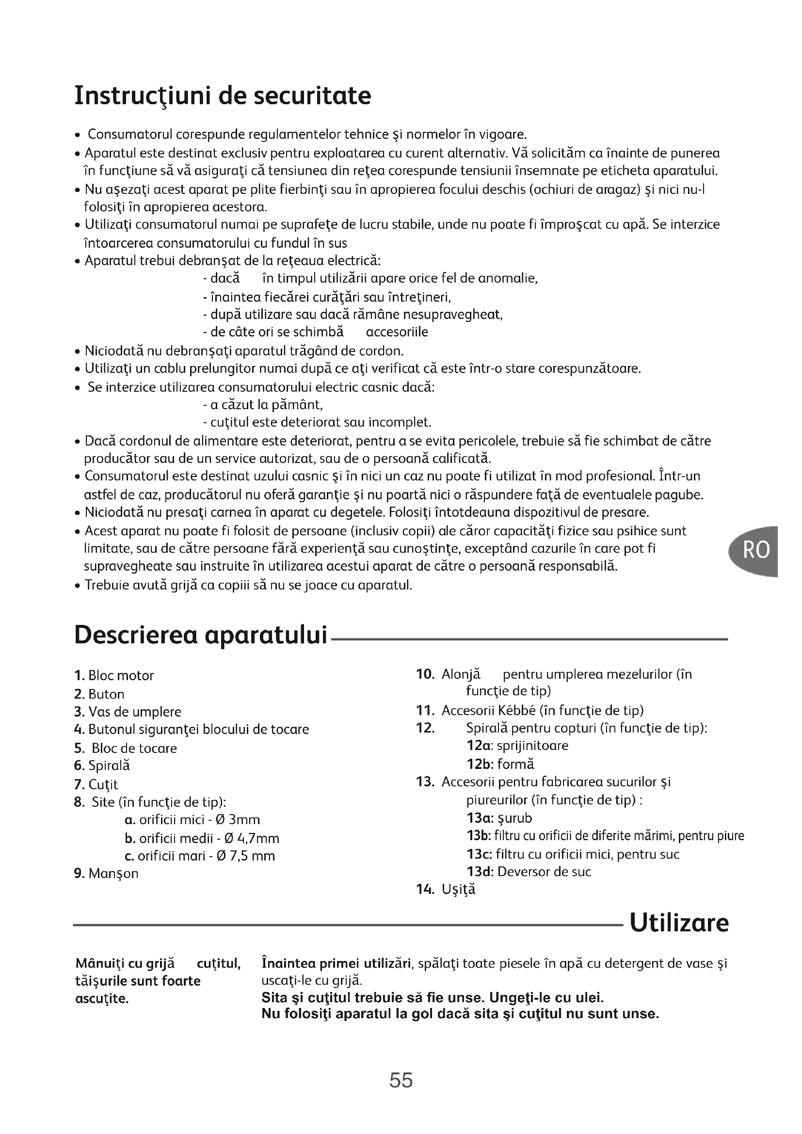 Utilizare Înaintea primei utilizări, spălaţi toate piesele în apă cu detergent de vase şi uscaţi-le cu grijă. Sita şi cuţitul trebuie să fie unse. Ungeţi-le cu ulei. Nu folosiţi aparatul la gol dacă sita şi cuţitul nu sunt unse. Mânuiţi cu grijă cuţitul, tăişurile sunt foarte ascuţite. Notice_TEFAL_2642950/A:19L-2642707 9/12/09 16:23 Page 55RO