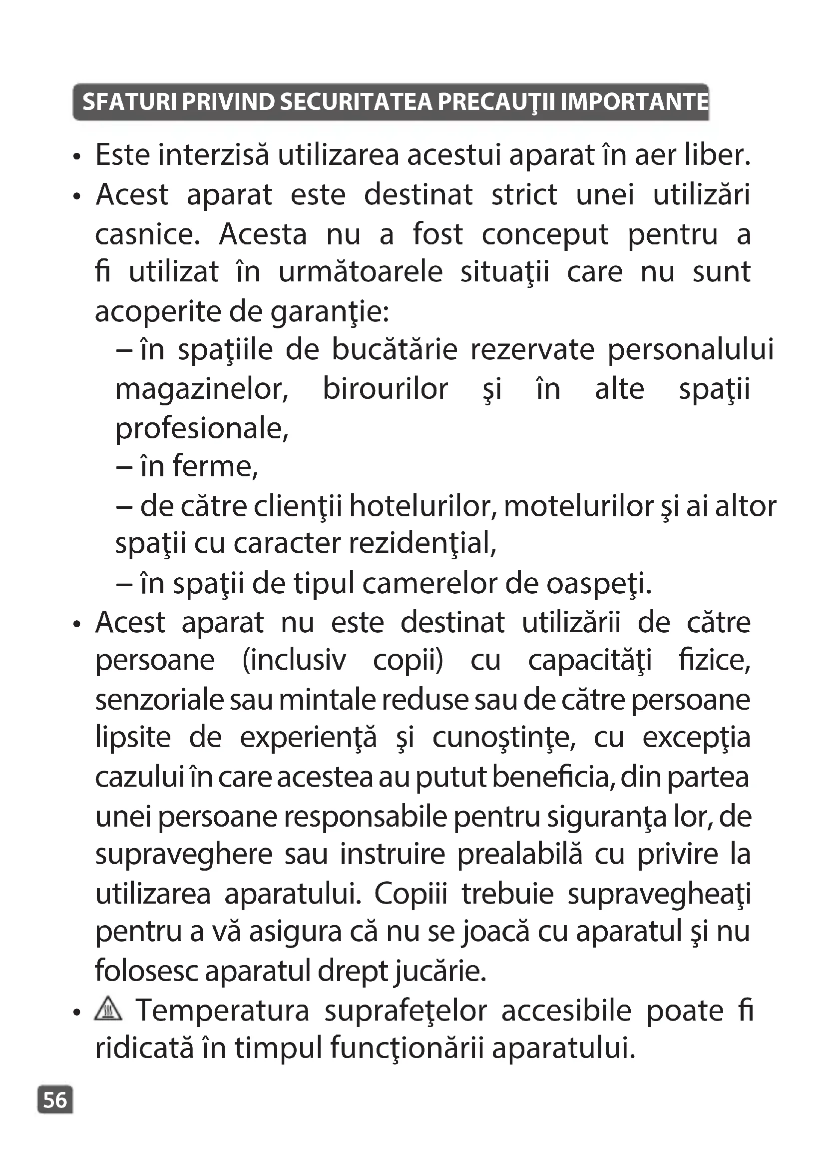 - Acest aparat poate utilizat de către copii cu vârsta de peste 8 ani şi de către persoane cu capacităţi zice, senzoriale sau intelectuale reduse ori lipsite de cunoştinţe sau de experienţă, dacă sunt supravegheate sau au fost instruite cu privire la utilizarea aparatului în deplină siguranţă şi înţeleg pericolele la care se expun. Operaţiunile de curăţare și de întreţinere nu trebuie să e executate de către copii, cu excepţia cazului când aceștia au vârsta peste 8 ani și sunt supravegheaţi. Nu ţineţi aparatul şi cablul acestuia la îndemâna copiilor cu vârsta sub 8 ani.