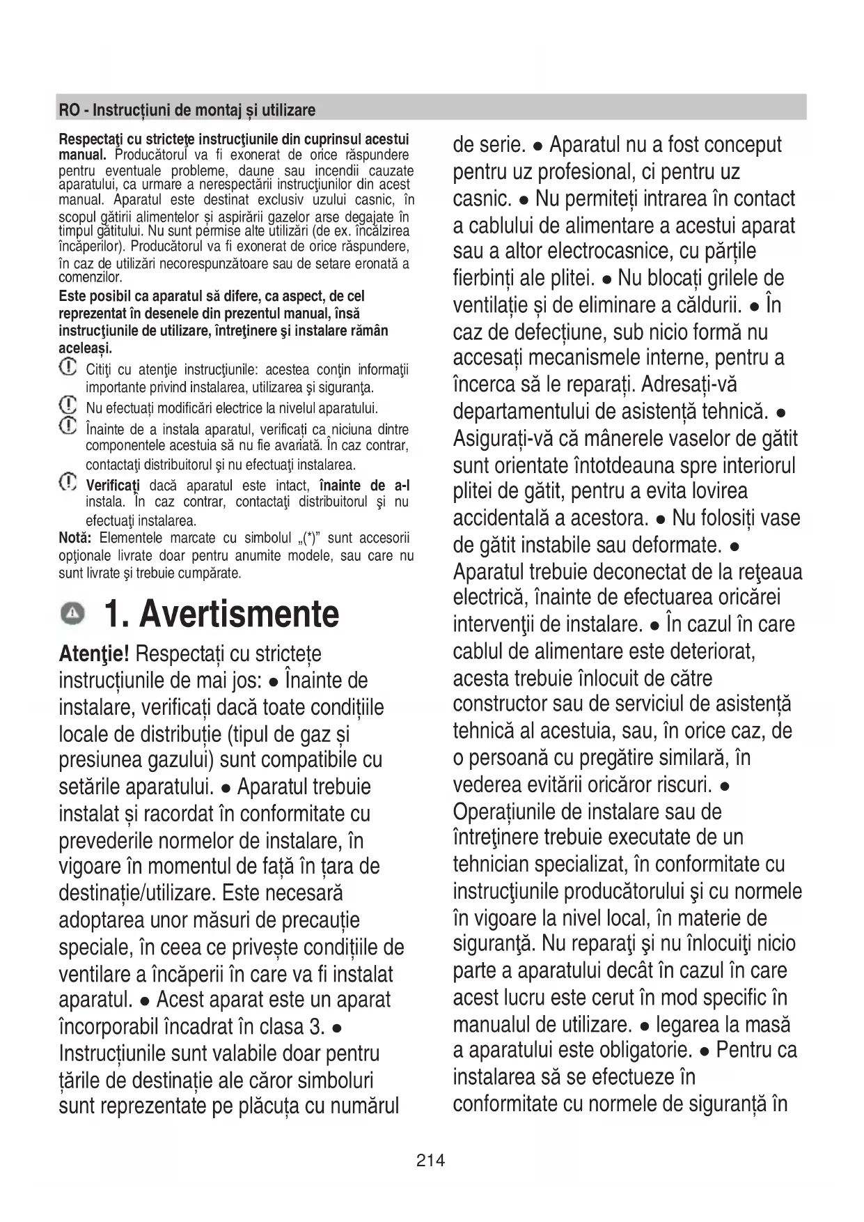 пълномощени и отказвайте инсталирането на резервни части, които не са оригинални.214 RO - Instrucțiuni de montaj și utilizare Respectaţi cu stricteţe instrucţiunile din cuprinsul acestui manual. Producătorul va fi exonerat de orice răspundere pentru eventuale probleme, daune sau incendii cauzate aparatului, ca urmare a nerespectării instrucţiunilor din acest manual. Aparatul este destinat exclusiv uzului casnic, în scopul gătirii alimentelor și aspirării gazelor arse degajate în timpul gătitului. Nu sunt permise alte utilizări (de ex. încălzirea încăperilor). Producătorul va fi exonerat de orice răspundere, în caz de utilizări necorespunzătoare sau de setare eronată a comenzilor. Este posibil ca aparatul să difere, ca aspect, de cel reprezentat în desenele din prezentul manual, însă instrucţiunile de utilizare, întreţinere şi instalare rămân aceleași. Citiţi cu atenţie instrucţiunile: acestea conţin informaţii importante privind instalarea, utilizarea şi siguranţa. Nu efectuați modificări electrice la nivelul aparatului. Înainte de a instala aparatul, verificați ca niciuna dintre componentele acestuia să nu fie avariată. În caz contrar, contactaţi distribuitorul şi nu efectuaţi instalarea. Verificați dacă aparatul este intact, înainte de a-l instala. În caz contrar, contactaţi distribuitorul şi nu efectuaţi instalarea. Notă: Elementele marcate cu simbolul „(*)” sunt accesorii opţionale livrate doar pentru anumite modele, sau care nu sunt livrate şi trebuie cumpărate.