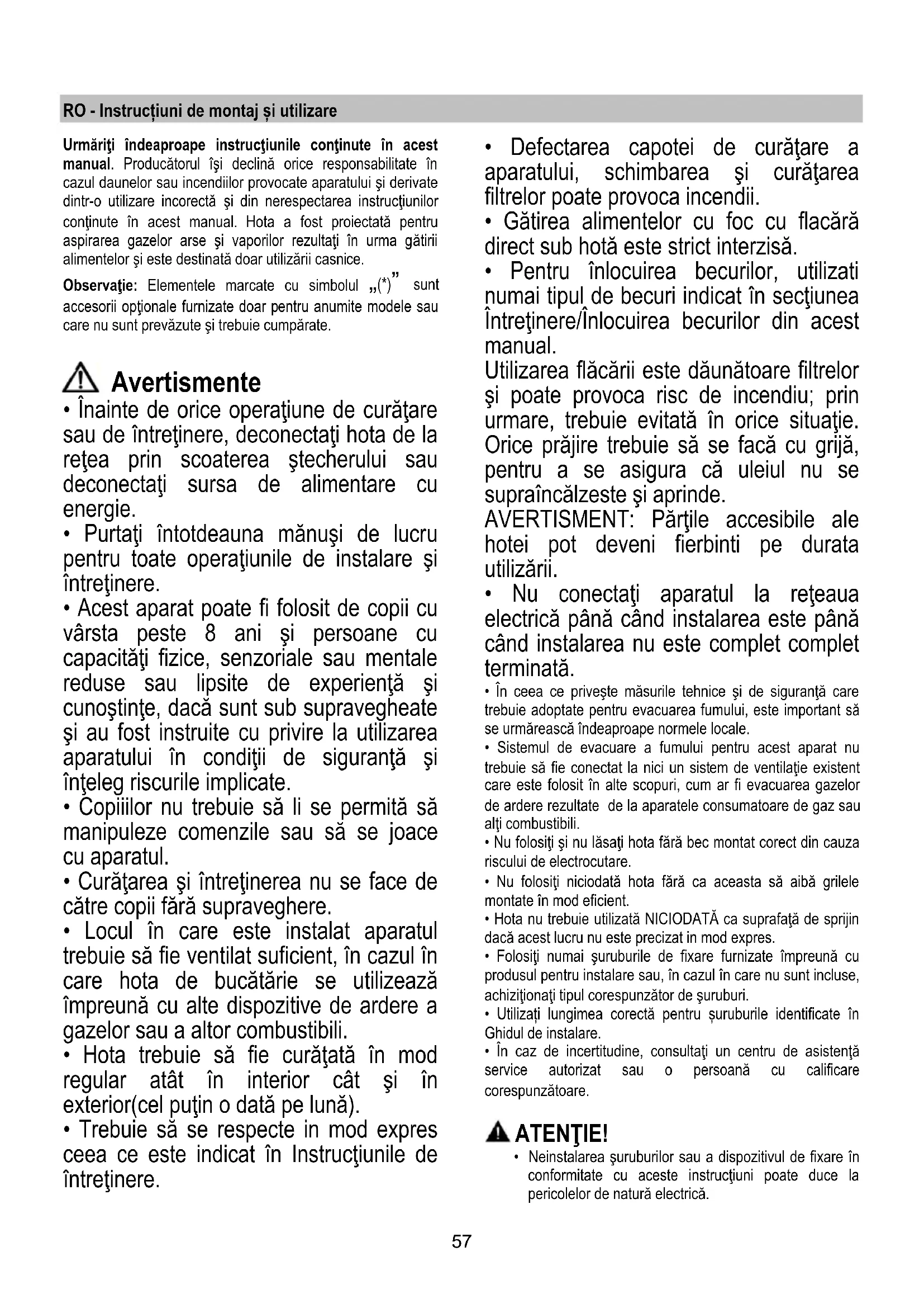 преди да потърсите помощта на специалист. САМО в някои продукти: Като допълнителен аксесоар се доставя с комплекта за инсталиране, един Клапан против Връщане на Дим. Ако условията на монтиране го изискват (напр. липса на защити срещу случайно навлизане на външни въздушни течения), поставете го в специалното седалище в Конектора за извеждане на Въздух, преди да инсталирате тръбата за извеждане на отработени газове.57 RO - Instrucțiuni de montaj și utilizare Urmăriţi îndeaproape instrucţiunile conţinute în acest manual. Producătorul îşi declină orice responsabilitate în cazul daunelor sau incendiilor provocate aparatului şi derivate dintr-o utilizare incorectă şi din nerespectarea instrucţiunilor conţinute în acest manual. Hota a fost proiectată pentru aspirarea gazelor arse şi vaporilor rezultaţi în urma gătirii alimentelor şi este destinată doar utilizării casnice. Observaţie: Elementele marcate cu simbolul „(*)” sunt accesorii opţionale furnizate doar pentru anumite modele sau care nu sunt prevăzute şi trebuie cumpărate.