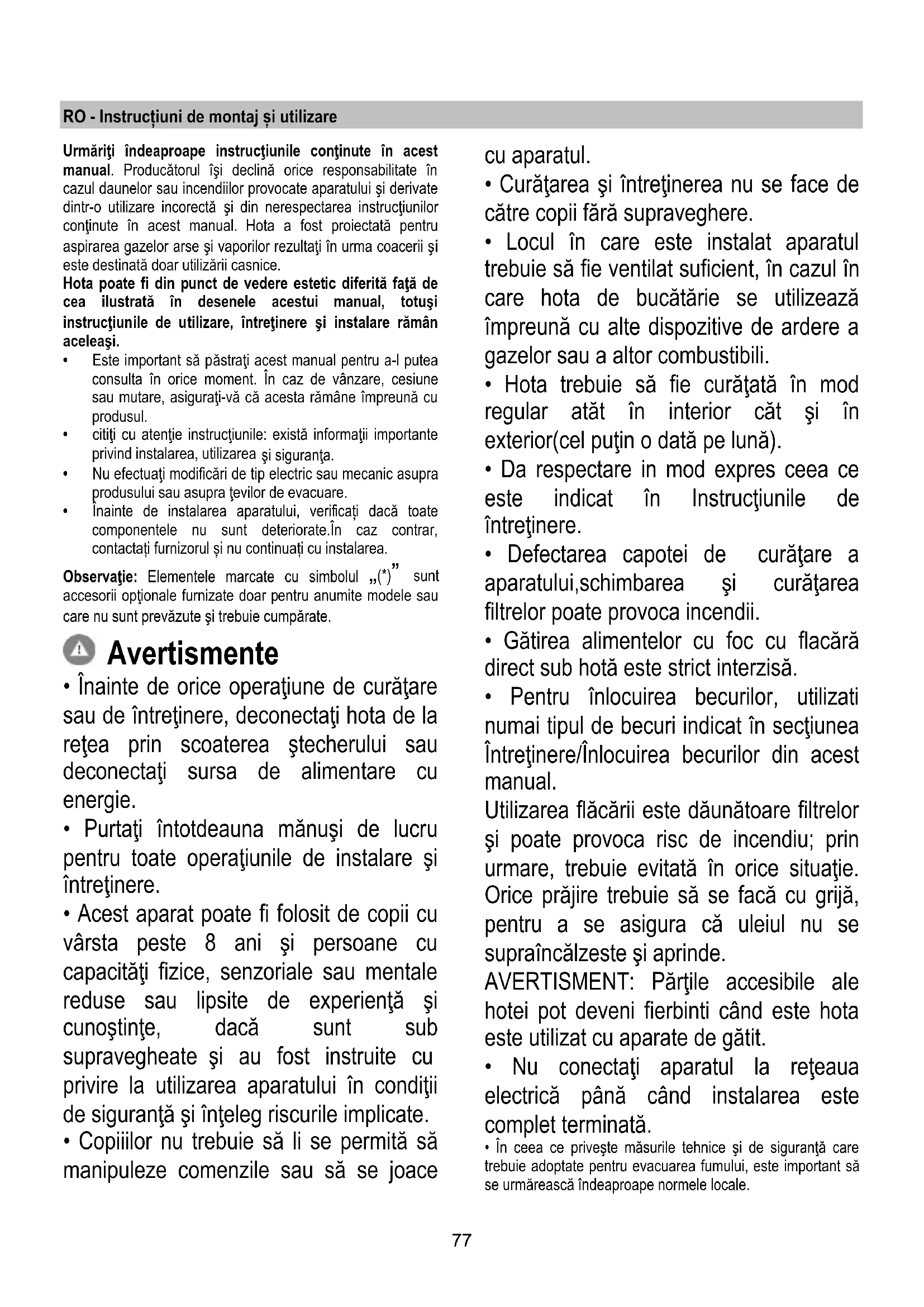 Демонтиране Филтърът с активен въглен се демонтира като се завъртят на 90º кръглите ръкохватки, които го придържат към аспиратора. Подмяна на ел. крушки Аспираторът разполага с осветителна система със СВЕТОДИОДИ. СВЕТОДИОДИТЕ гарантират оптимално осветление, до 10 пъти по-силно от традиционните лампи и позволяват 90% икономия на електроенергия. За подмяна се обърнете към сервиза за техническо обслужване.77 RO - Instrucțiuni de montaj și utilizare Urmăriţi îndeaproape instrucţiunile conţinute în acest manual. Producătorul îşi declină orice responsabilitate în cazul daunelor sau incendiilor provocate aparatului şi derivate dintr-o utilizare incorectă şi din nerespectarea instrucţiunilor conţinute în acest manual. Hota a fost proiectată pentru aspirarea gazelor arse şi vaporilor rezultaţi în urma coacerii şi este destinată doar utilizării casnice. Hota poate fi din punct de vedere estetic diferită faţă de cea ilustrată în desenele acestui manual, totuşi instrucţiunile de utilizare, întreţinere şi instalare rămân aceleaşi.