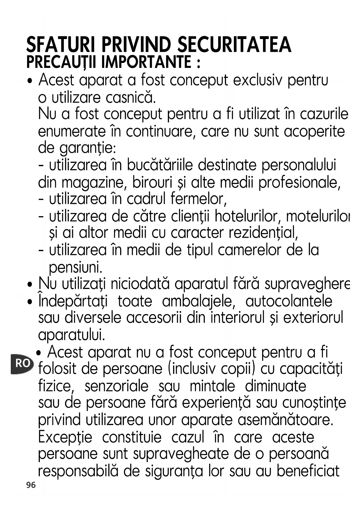 - Acest aparat a fost conceput exclusiv pentru o utilizare casnică. Nu a fost conceput pentru a fi utilizat în cazurile enumerate în continuare, care nu sunt acoperite de garanţie: - utilizarea în bucătăriile destinate personalului din magazine, birouri şi alte medii profesionale, - utilizarea în cadrul fermelor, - utilizarea de către clienţii hotelurilor, motelurilor şi ai altor medii cu caracter rezidenţial, - utilizarea în medii de tipul camerelor de la pensiuni.