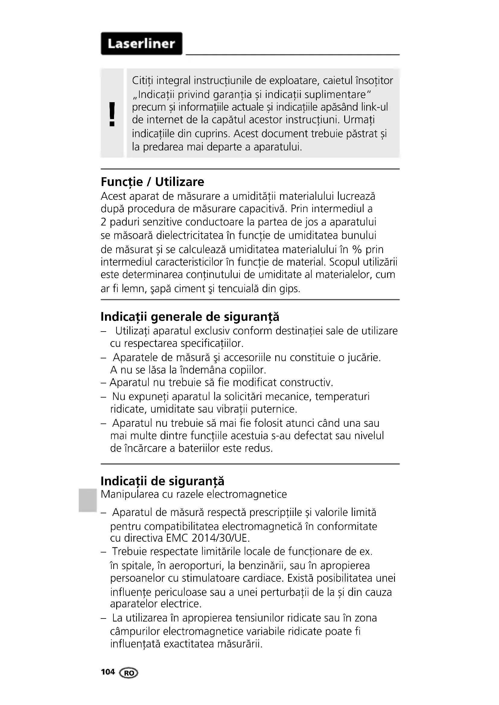 Indicaţii generale de siguranţă – Utilizaţi aparatul exclusiv conform destinaţiei sale de utilizare cu respectarea specicaţiilor. – Aparatele de măsură şi accesoriile nu constituie o jucărie. A nu se lăsa la îndemâna copiilor. – Aparatul nu trebuie să e modicat constructiv. – Nu expuneţi aparatul la solicitări mecanice, temperaturi ridicate, umiditate sau vibraţii puternice. – Aparatul nu trebuie să mai e folosit atunci când una sau mai multe dintre funcțiile acestuia s-au defectat sau nivelul de încărcare a bateriilor este redus. Indicaţii de siguranţă Manipularea cu razele electromagnetice – Aparatul de măsură respectă prescripțiile și valorile limită pentru compatibilitatea electromagnetică în conformitate cu directiva EMC 2014/30/UE. – Trebuie respectate limitările locale de funcționare de ex. în spitale, în aeroporturi, la benzinării, sau în apropierea persoanelor cu stimulatoare cardiace. Există posibilitatea unei inuențe periculoase sau a unei perturbații de la și din cauza aparatelor electrice. – La utilizarea în apropierea tensiunilor ridicate sau în zona câmpurilor electromagnetice variabile ridicate poate inuențată exactitatea măsurării.MoistureFinder Compact