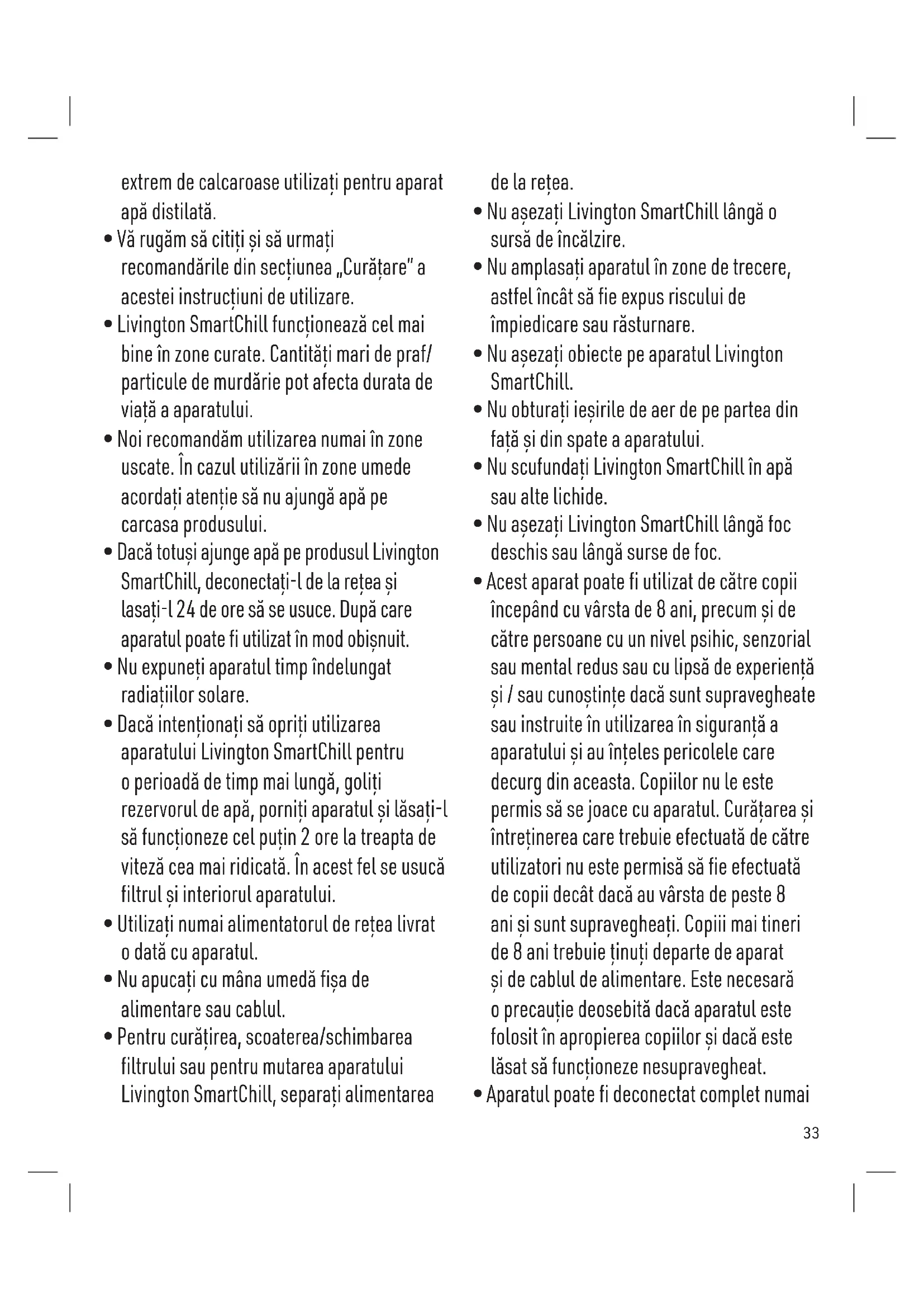 - Nu așezați obiecte pe aparatul Livington SmartChill.