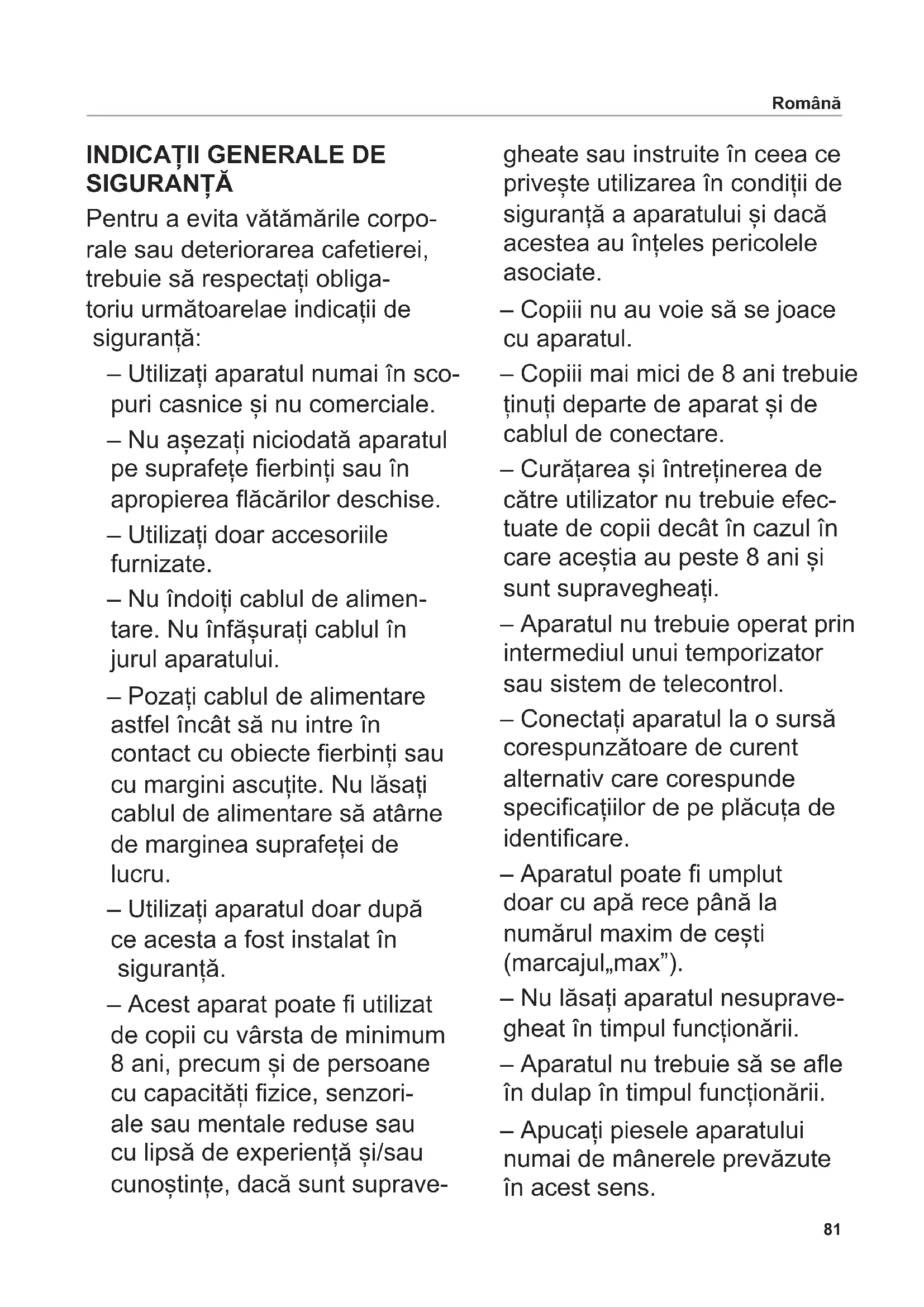 SIGURANȚĂ Pentru a evita vătămările corpo- rale sau deteriorarea cafetierei, trebuie să respectați obliga- toriu următoarelae indicații de siguranță: – Utilizați aparatul numai în sco- puri casnice și nu comerciale. – Nu așezați niciodată aparatul pe suprafețe erbinți sau în apropierea ăcărilor deschise. – Utilizați doar accesoriile furnizate. – Nu îndoiți cablul de alimen- tare. Nu înfășurați cablul în jurul aparatului. – Pozați cablul de alimentare astfel încât să nu intre în contact cu obiecte erbinți sau cu margini ascuțite. Nu lăsați cablul de alimentare să atârne de marginea suprafeței de lucru. – Utilizați aparatul doar după ce acesta a fost instalat în siguranță. – Acest aparat poate utilizat de copii cu vârsta de minimum 8 ani, precum și de persoane cu capacități zice, senzori- ale sau mentale reduse sau cu lipsă de experiență și/sau cunoștințe, dacă sunt suprave- gheate sau instruite în ceea ce privește utilizarea în condiții de siguranță a aparatului și dacă acestea au înțeles pericolele asociate. – Copiii nu au voie să se joace cu aparatul. – Copiii mai mici de 8 ani trebuie ținuți departe de aparat și de cablul de conectare. – Curățarea și întreținerea de către utilizator nu trebuie efec- tuate de copii decât în cazul în care aceștia au peste 8 ani și sunt supravegheați. – Aparatul nu trebuie operat prin intermediul unui temporizator sau sistem de telecontrol. – Conectați aparatul la o sursă corespunzătoare de curent alternativ care corespunde specicațiilor de pe plăcuța de identicare. – Aparatul poate umplut doar cu apă rece până la numărul maxim de cești (marcajul „max”). – Nu lăsați aparatul nesuprave- gheat în timpul funcționării. – Aparatul nu trebuie să se ae în dulap în timpul funcționării. – Apucați piesele aparatului numai de mânerele prevăzute în acest sens. Română82 – Există pericolul de opărire din cauza evacuării aburului prin oriciul de evacuare a aburu- lui. Acesta nu trebuie acoperit. Nu scoateți niciodată ltrul și nu deschideți capacul rezervorului de apă în timpul funcționării. – Nu turnați apă în aparat atunci când este pornit sau încă este cald. – Nu încălziți recipientul termoi- zolant cu o acără de gaz, pe o plită electrică, în cuptorul cu microunde sau altele asemenea. Pericol de electrocutare – În caz de defecțiuni, înainte de ecare curățare, atunci când aparatul nu este utilizat și în absența supravegherii scoateți întotdeauna ștecărul din priză. În acest scop, trageți de ștecăr și nu de cablu. – Nu scufundați niciodată apara- tul în apă sau alte lichide. Nu expuneți niciodată aparatul la ploaie sau umiditate. În cazul în care aparatul a căzut o dată în apă, mai întâi scoateți ștecărul din priză și apoi scoateți aparatul din apă. Dispuneți vericarea aparatului de către un centru de service autorizat, înainte de a-l pune din nou în funcțiune. – Nu utilizați aparatul cu mâi- nile ude. Nu utilizați aparatul atunci când este ud sau umed sau atunci când vă aați pe o suprafață umedă. Nu utilizați aparatul în aer liber. – În caz de deteriorare a pie- selor aparatului, întrerupeți imediat utilizarea și contactați serviciul clienți ritter. – În cazul în care cablul de alimentare este deteriorat, acesta trebuie înlocuit de producător, de serviciul clienți sau de persoane cu o cali- care similară, pentru a evita pericolele. Română83 Desfaceți gracele de la începutul și sfârșitul acestui manual. Citiți cu atenție instrucțiunile înainte de punerea în funcțiune a aparatului. Păstrați instrucțiunile de utilizare și transmiteți-le mai departe eventualilor proprietari. Alternativ, instrucțiunile actuale de utilizare sunt disponibile la adresa www.ritterwerk.de. UTILIZARE CONFORM DESTINAȚIEI Cafetiera servește la prepararea cafelei la ltru. Utilizați aparatul numai în scopuri casnice și nu comerciale. Cafetiera este adecvată pentru contactul cu alimentele. Utilizarea necorespunzătoare sau operarea incorectă poate duce la vătămări corporale grave sau la deteriorarea aparatului. În acest caz, toate pretențiile care decurg din garanție și răspundere devin nule.