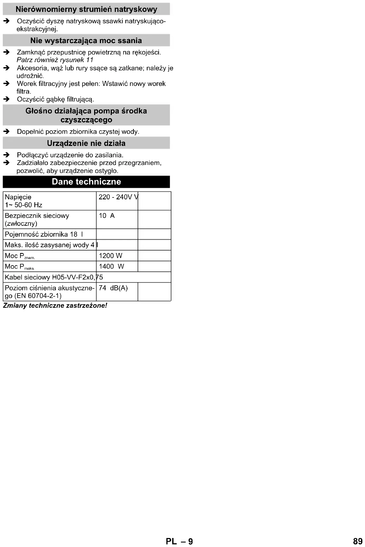 Curăţarea umedă a covoarelor / suprafeţelor dure Curăţarea umedă a covoarelor Curăţarea umedă a suprafeţelor dure Umpleţi rezervorul de apă proaspătă Începerea lucrului Golirea rezervorului în timpul funcţionării Sfaturi pentru curăţare / mod de lucru 92 RO– 8 – Covoarele cu firul lung trebuie periate ude după cu- răţare, în direcţia firelor, pentru a le ridica (de ex. cu o mătură pentru covoare cu fir lung sau cu o perie). – Impregnarea cu Care Tex RM 762 după curăţarea umedă împiedică o remurdărire rapidă a materialu- lui textil. – Nu călcaţi pe suprafaţa curăţată şi nu plasaţi mobi- lă pe aceasta până la uscare pentru a evita lăsarea de urme sau petele de rugină. Porniţi aspirarea şi pulverizarea (poziţia l). Pulverizaţi şi aspiraţi în acelaşi timp soluţia de cu- răţat, într-o singură etapă de lucru. Opriţi apoi comutatorul pentru pulverizare şi aspi- raţi restul de soluţie de curăţat. După curăţare, curăţaţi covoarele încă odată cu apă curată şi caldă şi impregnaţi dacă doriţi. Porniţi pulverizarea (poziţia I). Aplicaţi soluţia de curăţare şi lăsaţi să acţioneze min. 5 minute (opriţi aspirarea). Curăţaţi suprafaţa ca şi în cazul murdăririi normale. După curăţare, curăţaţi covoarele încă odată cu apă curată şi caldă şi impregnaţi dacă doriţi. Spălaţi conductele de pulverizare din aparat, pen- tru acesta: umpleţi rezervorul de soluţie de curăţat cu cca. 1 l apă curată. Ţineţi duza deasupra gurii de scurgere şi porniţi pompa de pulverizare până când este consumată toată apa. Indicaţie Pentru a utiliza aparatul ca aspirator umed şi uscat pu- teţi desprinde mânerul de pulverizare şi furtun de pulve- rizare. Figură Îndepărtaţi furtunurile de pulverizare şi clemele de fixare de la furtunul şi ţevile de aspirare. Apăsaţi cele două elemente de fixare şi tregeţi mâ- nerul de pulverizare de pe mâner. ATENŢIE La aspirarea uscată lucraţi întotdeauna cu sacul de filtru montat. O filtrare mai bună poate fi asigurată cu ajutorului unui cartuş de filtru (accesoriu special). Rezervorul şi accesoriul terebuie să fie uscate, în caz contrar murdărie se lipeşte de acestea. Alegeţi accesoriul dorit şi fixaţi-l direct pe ţevile de aspirare sau direct pe mâner. Figură Introduceţi sacul de filtrare. Alegeţi accesoriul dorit şi fixaţi-l direct pe ţevile de aspirare sau direct pe mâner. Porniţi aspirarea (poziţia I). Introduceţi inserţia pentru suprafeţe dure în duza pentru podea. Perii trebuie să fie îndreptaţi înainte. Lucraţi fără accesoriul pentru suprafeţe dure. Figură Acţionaţi clapeta de aer pentru ajustarea puterii de aspirare. Observaţie: După utilizare închideţi din nou clapeta de aer! ATENŢIE Nu folosiţi sac de filtrare! Indicaţie: Dacă rezervorul este plin, un plutitor închide orificiul de aspiraţie, iar aparatul funcţionează cu turaţie mărită. Opriţi imediat aparatul şi goliţi rezervorul. Pentru aspirarea murdăriei umede şi a lichidelor montaţi accesoriul dorit pe ţeava de aspirare sau direct pe mâner. Porniţi aspirarea (poziţia I). Figură Deschideţi clapeta de aer, dacă aspiraţi cantităţi mari de apă. Închideţi-o la loc după utilizare. Goliţi rezervorul plin (consultaţi capitolul „Golirea rezervorului”). Opriţi aparatul. Goliţi rezervorul plin (consultaţi capitolul „Golirea rezervorului”). Spălaţi rezervorul temeinic cu apă curată. După fiecare utilizare îndepărtaţi accesoriile de pe aparat şi detaşaţi furtunurile, duzele şi ţevile de prelungire. Indicaţie: Restul de apă, care rămâne eventual în aparat poate să scurgă, depozitaţi-l de aceea în vana de baie sau de duş. Spălaţi accesoriile individuale sub apă curentă şi lăsaţi-le apoi să se usuce. Curăţaţi filtrul de spumă sub apă curentă şi lăsaţi-l să se usuce înainte să îl puneţi la loc. Pentru uscare lăsaţi aparatul deschis. Păstrarea aparatului. Depozitaţi accesoriile îm- preună cu aparatul şi păstraţi aparatul într-o încă- pere uscată. În cazul unui jet de pulverizare neuniform. Figură Desprindeţi şi scoteţi duza de pulverizare, curăţaţi- o sau schimbaţi-o. O dată pe an sau când este necesar. Figură Rotiţi şi îndepărtaţi zăvorul. Scoateţi sita în sus şi curăţaţi-o sub apă curentă curată. Metode de curăţare Murdărire uşoară/normală Suprafeţe foarte murdare sau pete Încheierea curăţării umede Utilizare ca aspirator umed şi uscat Aspirarea suprafeţelor dure Aspirarea covoarelor Aspirarea apei Scoaterea din funcţiune Îngrijire şi întreţinere Curăţarea aparatului Curăţaţi sita din rezervorul de apă proaspătă. 93RO– 9 Umpleţi rezervorul de apă proaspătă. Verificaţi poziţia corectă a rezervorului de apă proaspătă. Pompa pentru detergent este defectă, solicitaţi asistenţa servciului clienţi. Curăţaţi duza de pulverizare de la duza de pulveri- zare şi aspirare. Închideţi clapeta de aer de pe mâner. A se vedea şi figura 11 Accesoriile, furtunul sau ţevile de aspiraţie sunt în- fundate, în acest caz vă rugăm să le desfundaţi. Sacul de filtrare este plin: Introduceţi un sac de fil- trare nou. Curăţaţi filtrul de spumă. Completaţi apă în rezervorul pentru apă proaspătă. Introduceţi ştecherul în priză. S-a declanşat protecţia la supraîncălzire, lăsaţi aparatul să se răcească. Ne rezervăm dreptul de a efectua modificări tehnice! Defecţiuni Din duză nu iese apă Jet de pulverizare neuniform Putere de aspirare insuficientă Pompa pentru detergent este zgomotoasă Aparatul nu funcţionează Date tehnice Tensiune 1~ 50-60 Hz