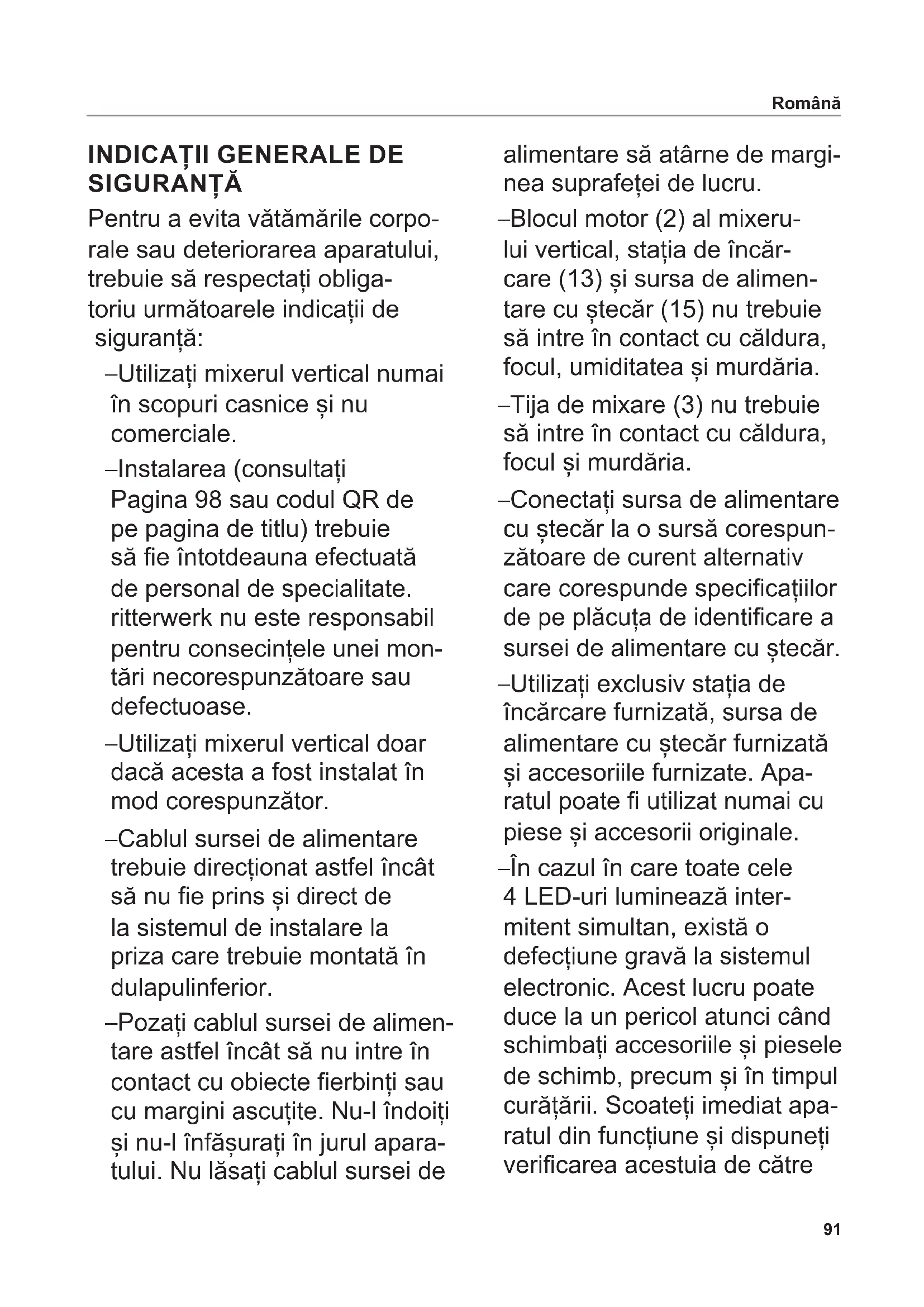 SIGURANȚĂ Pentru a evita vătămările corpo- rale sau deteriorarea aparatului, trebuie să respectați obliga- toriu următoarele indicații de siguranță: – Utilizați mixerul vertical numai în scopuri casnice și nu comerciale. – Instalarea (consultați Pagina 98 sau codul QR de pe pagina de titlu) trebuie să e întotdeauna efectuată de personal de specialitate. ritterwerk nu este responsabil pentru consecințele unei mon- tări necorespunzătoare sau defectuoase. – Utilizați mixerul vertical doar dacă acesta a fost instalat în mod corespunzător. – Cablul sursei de alimentare trebuie direcționat astfel încât să nu e prins și direct de la sistemul de instalare la priza care trebuie montată în dulapul inferior. – Pozați cablul sursei de alimen- tare astfel încât să nu intre în contact cu obiecte erbinți sau cu margini ascuțite. Nu-l îndoiți și nu-l înfășurați în jurul apara- tului. Nu lăsați cablul sursei de alimentare să atârne de margi- nea suprafeței de lucru. – Blocul motor (2) al mixeru- lui vertical, stația de încăr- care (13) și sursa de alimen- tare cu ștecăr (15) nu trebuie să intre în contact cu căldura, focul, umiditatea și murdăria. – Tija de mixare (3) nu trebuie să intre în contact cu căldura, focul și murdăria. – Conectați sursa de alimentare cu ștecăr la o sursă corespun- zătoare de curent alternativ care corespunde specicațiilor de pe plăcuța de identicare a sursei de alimentare cu ștecăr. – Utilizați exclusiv stația de încărcare furnizată, sursa de alimentare cu ștecăr furnizată și accesoriile furnizate. Apa- ratul poate utilizat numai cu piese și accesorii originale. – În cazul în care toate cele 4 LED-uri luminează inter- mitent simultan, există o defecțiune gravă la sistemul electronic. Acest lucru poate duce la un pericol atunci când schimbați accesoriile și piesele de schimb, precum și în timpul curățării. Scoateți imediat apa- ratul din funcțiune și dispuneți vericarea acestuia de către Română92 un centru de service autorizat. Nu atingeți accesoriul în niciun caz. În acest caz, încărcarea acumulatorului nu mai este posibilă. – Utilizarea acestui aparat de către copii este interzisă. Apa- ratul și cablul de conectare al acestuia nu trebuie lăsate la îndemâna copiilor. – Aparatul poate utilizat de persoane cu capacități zice, senzoriale sau mentale reduse sau cu lipsă de experiență și/sau cunoștințe, dacă sunt supravegheate sau instruite în ceea ce privește utilizarea în condiții de siguranță și dacă acestea au înțeles pericolele asociate. – Copiii nu au voie să se joace cu aparatul. – Utilizați mixerul vertical doar atunci când acesta se aă într-un vas cu fund plat. – Mixerul vertical nu trebuie scu- fundat în amestec deasupra punctului de conectare al tijei de mixare și blocului motor. – Nu lăsați aparatul nesuprave- gheat în timpul funcționării. – Nu scufundați niciodată în întregime mixerul vertical, stația de încărcare și sursa de alimentare cu ștecăr în apă sau alte lichide. Nu expuneți niciodată aparatul la ploaie sau umiditate. În cazul în care aparatul a căzut o dată în apă, mai întâi scoateți sursa de alimentare cu ștecăr a stației de încărcare din priză și apoi scoateți piesele aparatului din apă. După aceea, dispuneți vericarea întregului aparat de către un centru de service autorizat, înainte de a-l pune din nou în funcțiune. – Nu utilizați aparatul cu mâi- nile ude. Nu utilizați aparatul atunci când este ud sau umed sau atunci când vă aați pe o suprafață umedă. Nu utilizați aparatul în aer liber. – Mixerul vertical și stația de încărcare nu trebuie curățate în mașina de spălat vase. – În timpul utilizării mixerului vertical, nu atingeți niciodată accesoriile și nu introduceți obiecte în mixerul vertical atunci când funcționează. Română93 Pericol de rănire – În caz de defecțiuni la stația de încărcare, scoateți întot- deauna sursa de alimentare cu ștecăr din priză. În acest scop, trageți de ștecăr și nu de cablu. – În caz de deteriorări ale pie- selor aparatului, întrerupeți imediat funcționarea pentru a evita pericolele. După aceea, dispuneți vericarea întregului aparat de către un centru de service autorizat, înainte de a-l pune din nou în funcțiune. – Dacă sursa de alimentare cu ștecăr sau cablul sursei de alimentare este deteriorat, acesta trebuie înlocuit cu o sursă de alimentare cu ștecăr originală de la producător sau de la serviciul clienți de la nivel național. – Nu porniți niciodată mixerul vertical atunci când îl cură- țați, când scoateți, respectiv montați accesoriile sau când schimbați accesoriile și piesele de schimb. Prin urmare, țineți degetele departe de taste. Nu atingeți lamele accesoriilor, deoarece acestea sunt foarte ascuțite. Română – Alimentele pot stropi în tim- pul procesării. Prin urmare, lăsați alimentele calde să se răcească înainte de proce- sare, pentru a evita opărirea. – Dacă utilizați mixerul vertical într-o oală, țineți oala departe de suprafața de gătit. – Asigurați-vă că locașul pentru accesoriu este amplasat în întregime pe știftul arborelui de antrenare. Accesoriile slăbite, care nu sunt xe, nu trebuie utilizate și trebuie înlocuite. Pericol de explozie – Protejați acumulatorii de căldură și foc.94 Desfaceți gracele de la începutul și sfârșitul acestui manual. Citiți cu atenție instrucțiunile înainte de punerea în funcțiune a aparatului. Păstrați instrucțiunile de utilizare și transmiteți-le mai departe eventualilor proprietari. Alternativ, instrucțiunile actuale de utilizare sunt disponibile la adresa www.ritterwerk.de. UTILIZARE CONFORM DESTINAȚIEI Mixerul vertical servește la pasa- rea, tocarea sau amestecarea alimentelor adecvate pentru uz casn