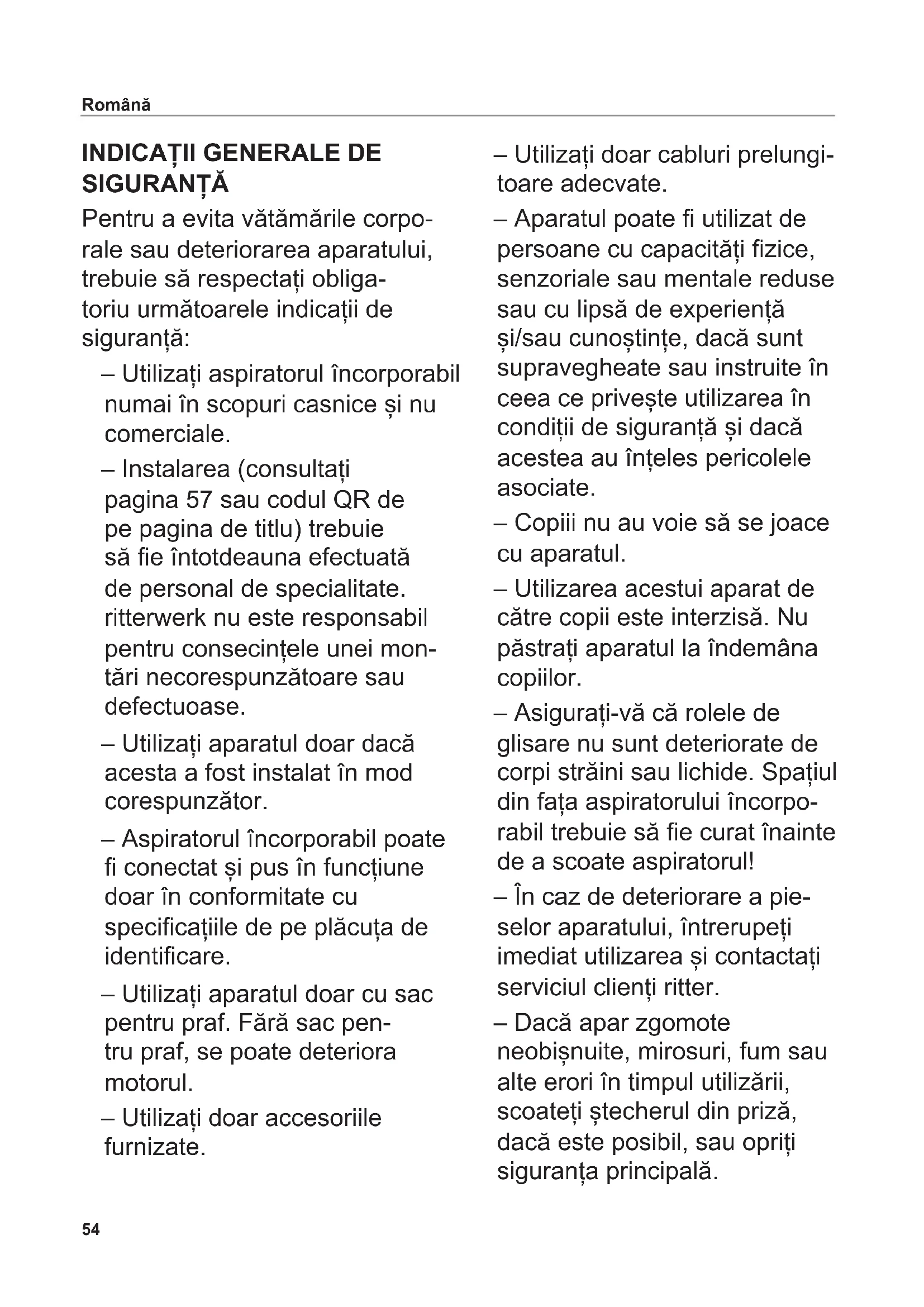 SIGURANȚĂ Pentru a evita vătămările corpo- rale sau deteriorarea aparatului, trebuie să respectați obliga- toriu următoarele indicații de siguranță: – Utilizați aspiratorul încorporabil numai în scopuri casnice și nu comerciale. – Instalarea (consultați pagina 57 sau codul QR de pe pagina de titlu) trebuie să e întotdeauna efectuată de personal de specialitate. ritterwerk nu este responsabil pentru consecințele unei mon- tări necorespunzătoare sau defectuoase. – Utilizați aparatul doar dacă acesta a fost instalat în mod corespunzător. – Aspiratorul încorporabil poate conectat și pus în funcțiune doar în conformitate cu specicațiile de pe plăcuța de identicare. – Utilizați aparatul doar cu sac pentru praf. Fără sac pen- tru praf, se poate deteriora motorul. – Utilizați doar accesoriile furnizate. – Utilizați doar cabluri prelungi- toare adecvate. – Aparatul poate utilizat de persoane cu capacități zice, senzoriale sau mentale reduse sau cu lipsă de experiență și/sau cunoștințe, dacă sunt supravegheate sau instruite în ceea ce privește utilizarea în condiții de siguranță și dacă acestea au înțeles pericolele asociate. – Copiii nu au voie să se joace cu aparatul. – Utilizarea acestui aparat de către copii este interzisă. Nu păstrați aparatul la îndemâna copiilor. – Asigurați-vă că rolele de glisare nu sunt deteriorate de corpi străini sau lichide. Spațiul din fața aspiratorului încorpo- rabil trebuie să e curat înainte de a scoate aspiratorul! – În caz de deteriorare a pie- selor aparatului, întrerupeți imediat utilizarea și contactați serviciul clienți ritter. – Dacă apar zgomote neobișnuite, mirosuri, fum sau alte erori în timpul utilizării, scoateți ștecherul din priză, dacă este posibil, sau opriți siguranța principală.55 Română – Nu reparați niciodată singur/ă aparatul. Dacă se rupe sigi- liul de pe carcasa motoru- lui, garanția este anulată irevocabil! Pericol de rănire – Nu vă urcați niciodată pe apa- ratul tras în afară. – Pericol de împiedicare atunci când aparatul este tras în afară! – Nu deschideți niciodată incinta motorului, atunci când motorul este în funcțiune.56 Română Citiți cu atenție instrucțiunile înainte de punerea în funcțiune a aparatului. Păstrați instrucțiunile de utilizare și transmiteți-le mai departe eventualilor proprietari. Alternativ, instrucțiunile actuale de utilizare sunt disponibile la adresa www.ritterwerk.de. UTILIZARE CONFORM DESTINAȚIEI Aspiratorul încorporabil servește la eliminarea rapidă a rimiturilor și prafului din bucătărie. Utilizarea necorespunzătoare sau operarea incorectă poate duce la vătămări corporale grave sau la deteriorarea aparatului. În acest caz, toate pretențiile care decurg din garanție și răspundere devin nule. ASPIRARE