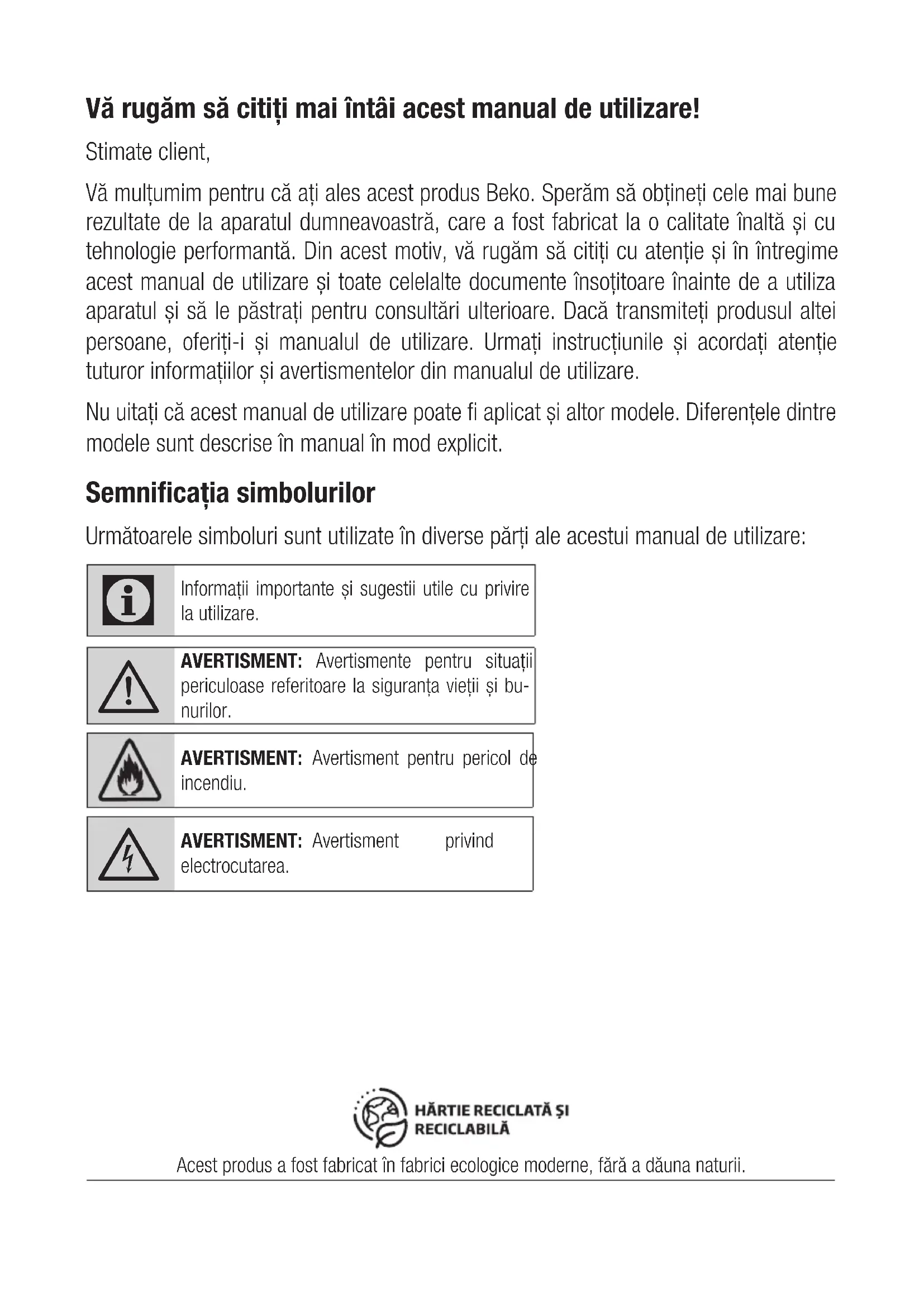 Vă rugăm să citiți mai întâi acest manual de utilizare! Stimate client, Vă mulțumim pentru că ați ales acest produs Beko. Sperăm să obțineți cele mai bune rezultate de la aparatul dumneavoastră, care a fost fabricat la o calitate înaltă și cu tehnologie performantă. Din acest motiv, vă rugăm să citiți cu atenție și în întregime acest manual de utilizare și toate celelalte documente însoțitoare înainte de a utiliza aparatul și să le păstrați pentru consultări ulterioare. Dacă transmiteți produsul altei persoane, oferiți-i și manualul de utilizare. Urmați instrucțiunile și acordați atenție tuturor informațiilor și avertismentelor din manualul de utilizare. Nu uitați că acest manual de utilizare poate fi aplicat și altor modele. Diferențele dintre modele sunt descrise în manual în mod explicit. Semnificația simbolurilor Următoarele simboluri sunt utilizate în diverse părți ale acestui manual de utilizare: