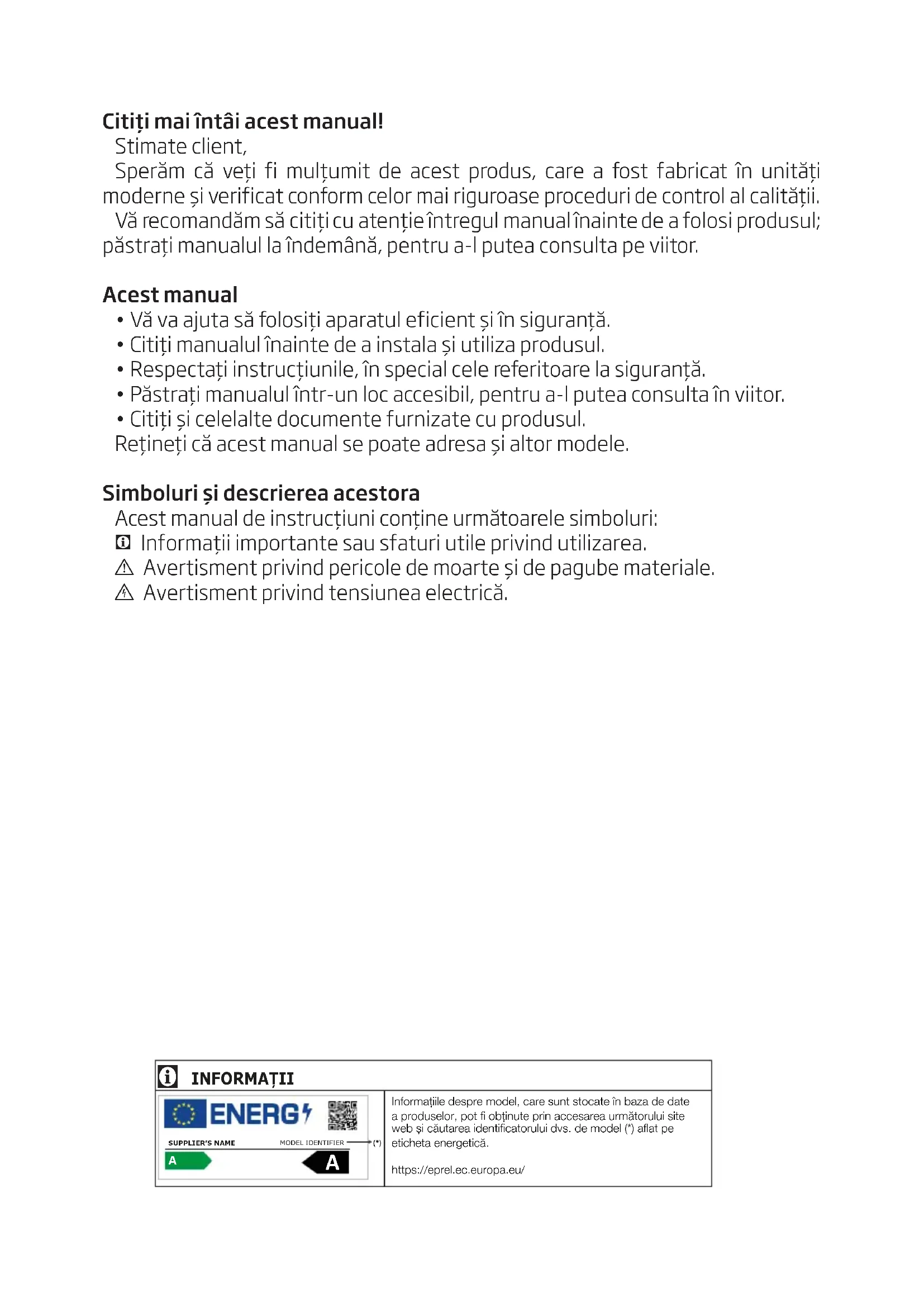 Informațiile despre model, care sunt stocate în baza de date a produselor, pot fi obținute prin accesarea următorului site web și căutarea identificatorului dvs. de model (*) aflat pe eticheta energetică.https://eprel.ec.europa.eu/