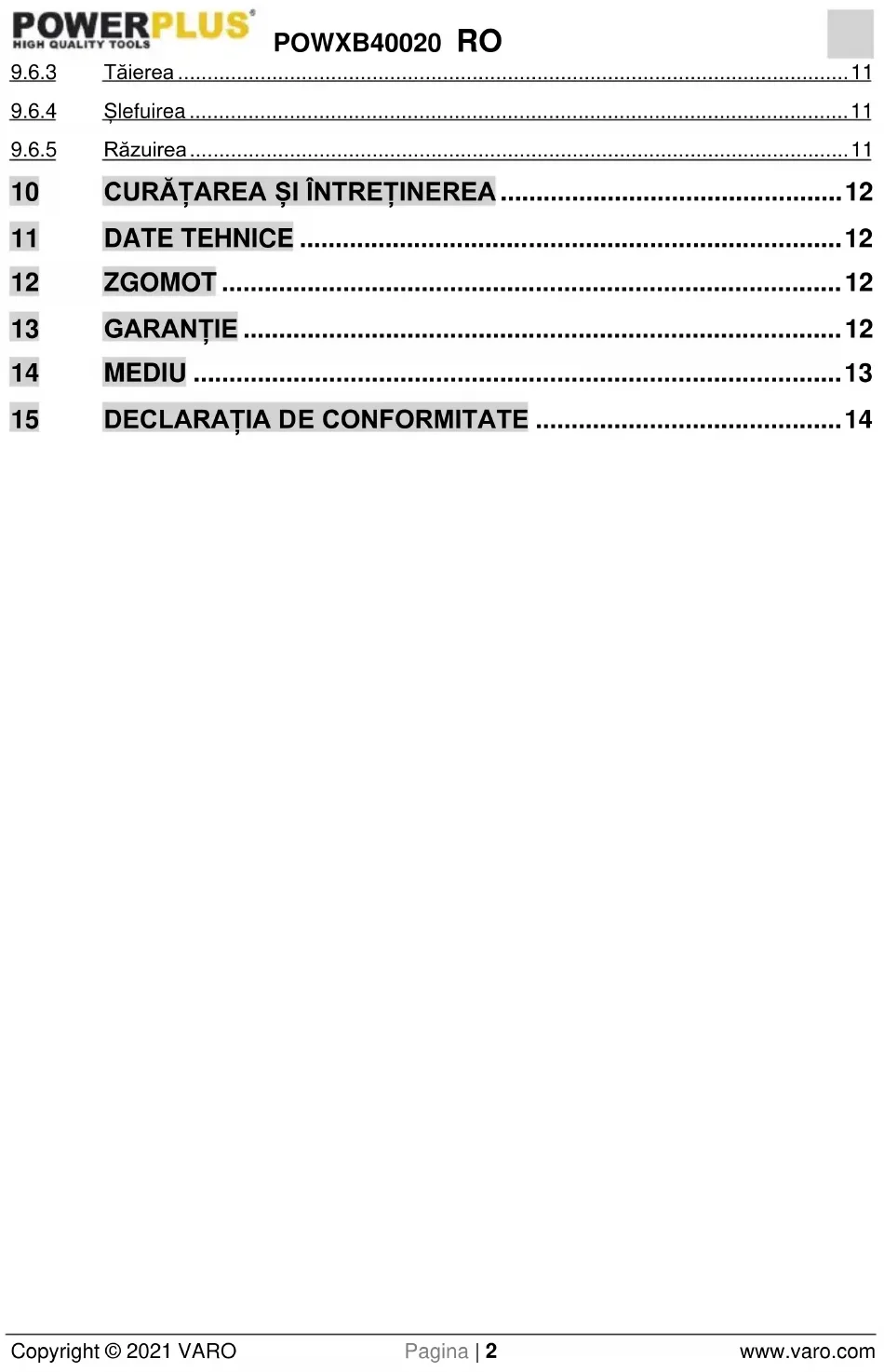 VARO – Vic. Van Rompuy N.V. - Joseph Van Instraat 9 - BE2500 Lier - BELGIA, declară că produsul: Aparat multifuncțional – Cu acumulator marcă de comerț: PowerPlus model: POWXB40020 este în conformitate cu specificațiile esențiale și alte prevederi relevante ale Directivelor Europene aplicabile, pe baza aplicării standardelor europene armonizate. Orice modificare neautorizată a aparatelor atrage după sine anularea acestei declarații. Directivele europene (inclusiv, dacă este cazul, amendamentele lor, până la data semnăturii): 2011/65/EU 2014/30/EU 2006/42/EC Standardele europene armonizate (inclusiv, dacă este cazul, amendamentele lor, până la data semnăturii): EN62841-1: 2015 EN62841-2-4 : 2014 EN55014-1 : 2017 EN55014-2 : 2015 Persoana care păstrează documentația tehnică: Philippe Vankerkhove, VARO – Vic. Van Rompuy N.V. Subsemnatul acționează în numele Directorului general executiv al societății, Philippe Vankerkhove Divizia de reglementare – Director de conformitate 21/01/2021, Lier - BelgiumPOWXB40020 PL Copyright © 2021 VARO Strona | 1 www.varo.com 1 ZASTOSOWANIE ........................................................................... 3