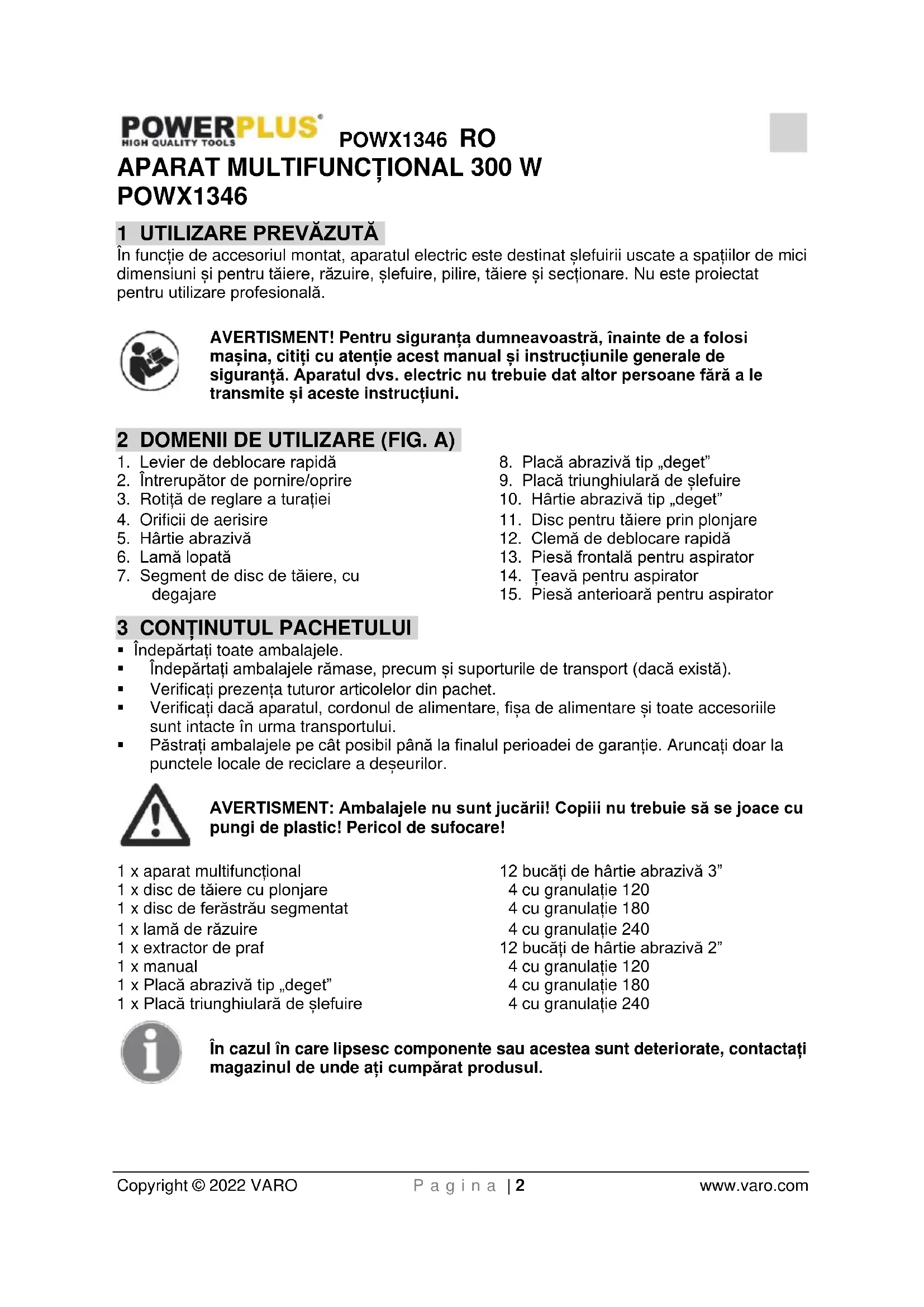 AVERTISMENT: Înainte de montare și de reglare, scoateți întotdeauna ștecărul din priză.POWX1346 RO Copyright © 2022 VARO P a g i n a | 6 www.varo.com Aveți grijă cu uneltele ascuțite, cum ar fi șpaclurile, discurile de ferăstrău sau lamele tăietoare.