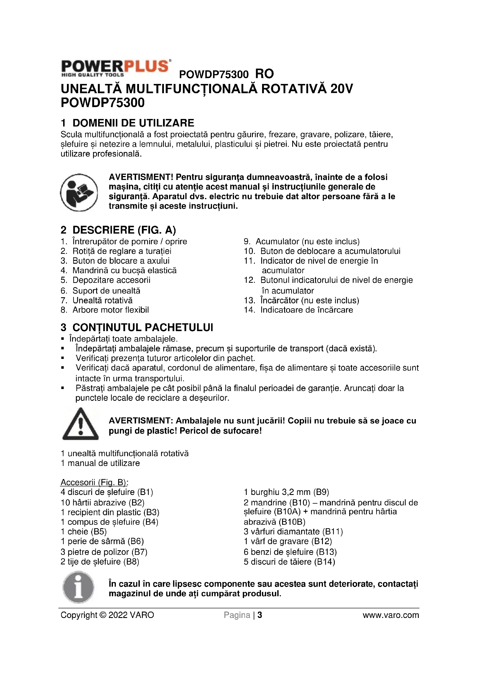 - POWDP75300 RO Copyright © 2022 VARO Pagina | 2 www.varo.com 10.4 Accesorii (Fig. B) p. 10