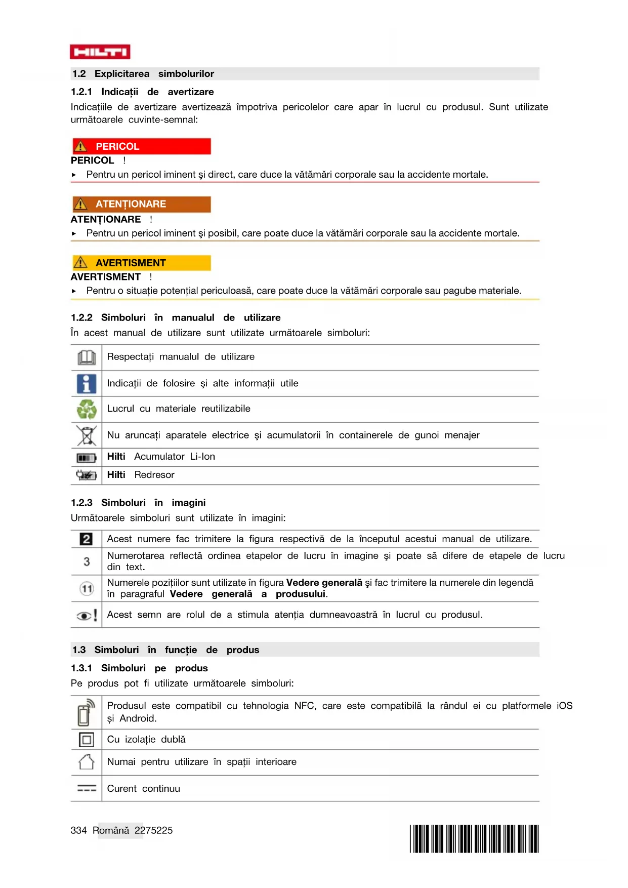 În acest manual de utilizare sunt utilizate următoarele simboluri: Respectaţi manualul de utilizare Indicaţii de folosire şi alte informaţii utile Lucrul cu materiale reutilizabile Nu aruncaţi aparatele electrice şi acumulatorii în containerele de gunoi menajer Hilti Acumulator LiIon Hilti Redresor