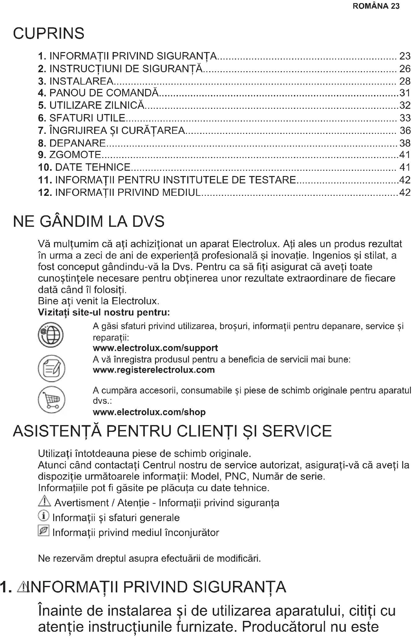 Vă mulțumim că ați achiziționat un aparat Electrolux. Aţi ales un produs rezultat în urma a zeci de ani de experienţă profesională şi inovaţie. Ingenios şi stilat, a fost conceput gândindu-vă la Dvs. Pentru ca să fiți asigurat că aveți toate cunoștințele necesare pentru obținerea unor rezultate extraordinare de fiecare dată când îl folosiți. Bine ați venit la Electrolux. Vizitați site-ul nostru pentru: A găsi sfaturi privind utilizarea, broșuri, informații pentru depanare, service și reparații: www.electrolux.com/support A vă înregistra produsul pentru a beneficia de servicii mai bune: www.registerelectrolux.com A cumpăra accesorii, consumabile și piese de schimb originale pentru aparatul dvs.: www.electrolux.com/shop