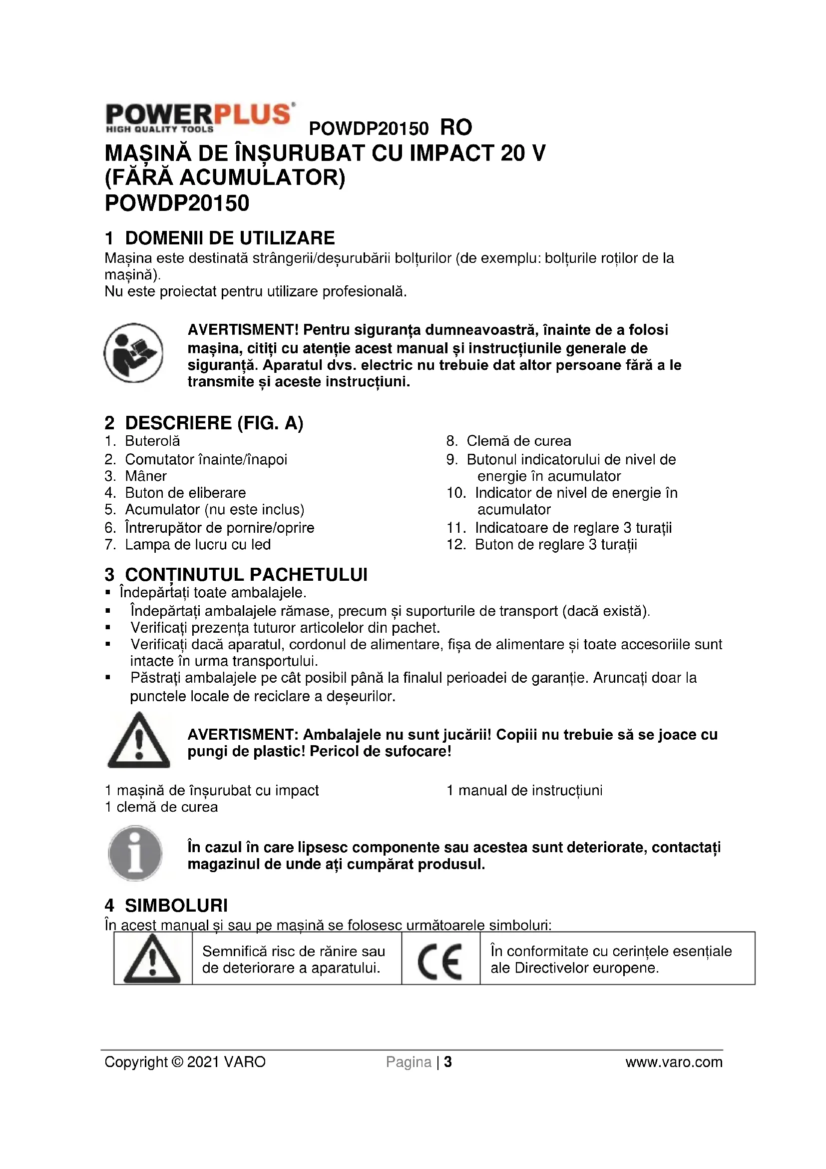 9.4 Clema de curea (Fig. 3) ........................................................................................ 10POWDP20150 RO Copyright © 2021 VARO Pagina | 2 www.varo.com