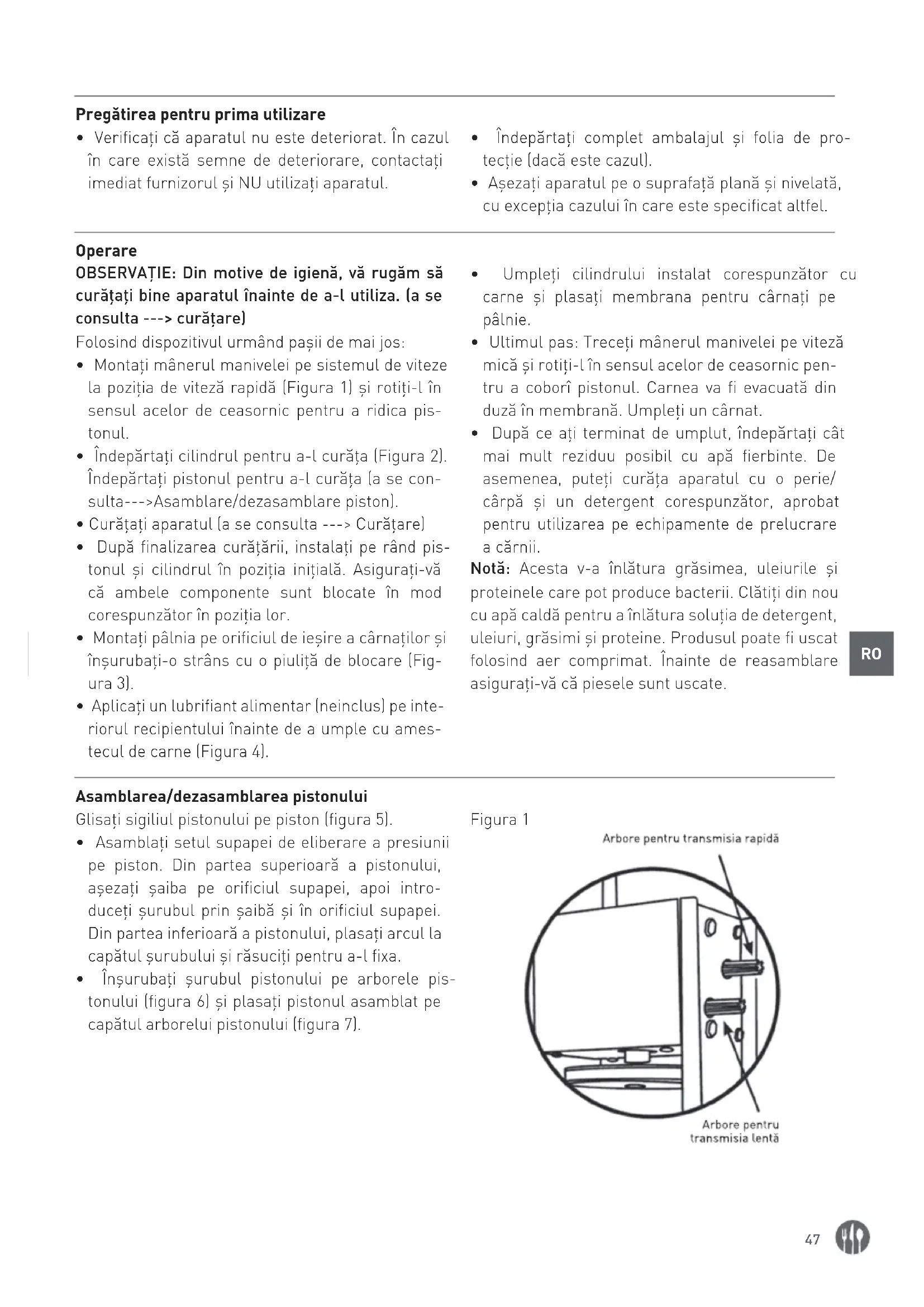 - Ultimul pas: Treceți mânerul manivelei pe viteză mică și rotiți-l în sensul acelor de ceasornic pen- tru a coborî pistonul. Carnea va fi evacuată din duză în membrană. Umpleți un cârnat.