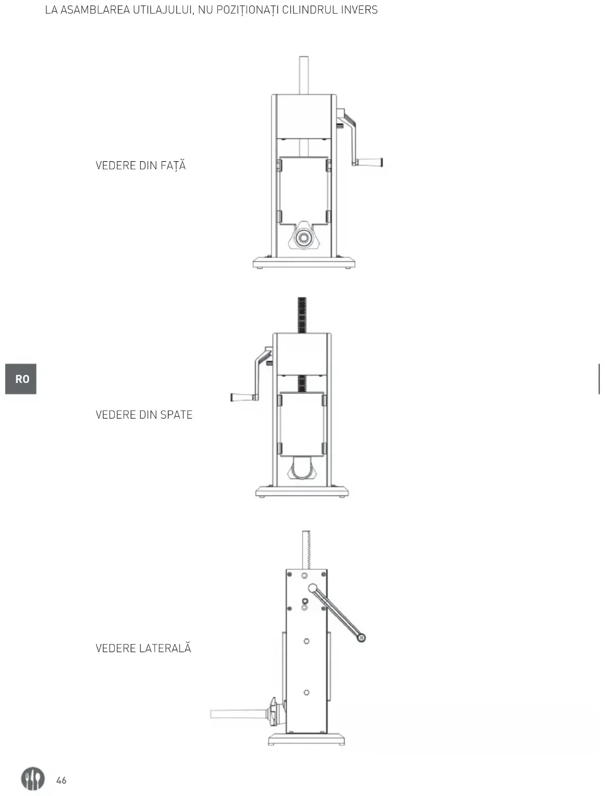 - Utilizarea aparatului în orice alt scop reprezintă o utilizare incorectă. Utilizatorul este singurul răspunzător de orice utilizare incorectă a aparat- ului. Descrierea procesului de producere Maşina noastră de umplut vă va ajuta să obţineţi cârnaţi delicioşi. Utilajul, dotat cu grilaje verticale şi orizontale, are un nou sistem de viteze. Are un drive de reducere a schimbătorului cu două viteze care eliberează bara de presiune pentru umplere rapidă şi uşoară. Utilajul este ideal pentru pro- ducătorii de cârnaţi sau restaurante care doresc să producă cârnaţi delicioşi. Specificaţii utilaj