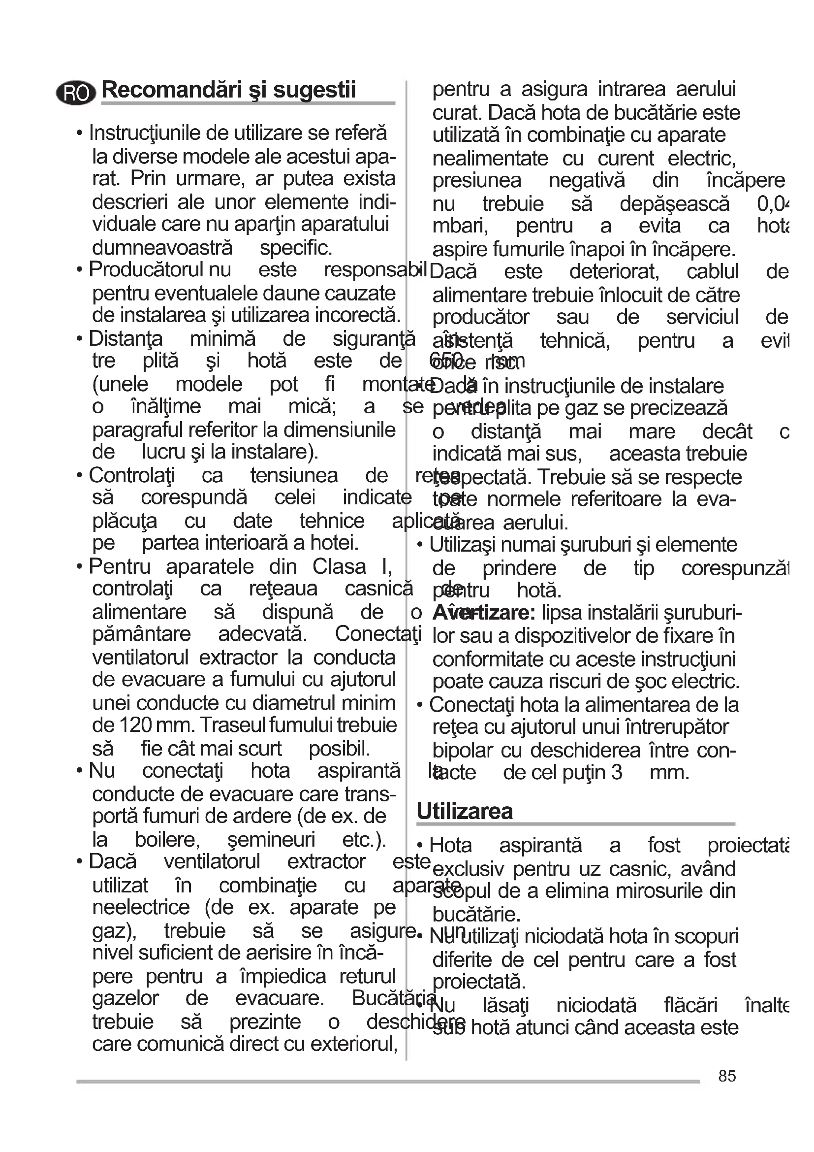 - Dacă ventilatorul extractor este utilizat în combinaţie cu aparate neelectrice (de ex. aparate pe gaz), trebuie să se asigure un nivelsucientdeaerisireînîncă- pere pentru a împiedica returul gazelor de evacuare. Bucătăria trebuie să prezinte o deschidere carecomunicădirectcuexteriorul, pentru a asigura intrarea aerului curat.Dacăhotadebucătărieeste utilizatăîncombinaţiecuaparate nealimentate cu curent electric, presiunea negativă din încăpere nu trebuie să depăşească 0,04 mbari, pentru a evita ca hota să aspirefumurileînapoiînîncăpere.