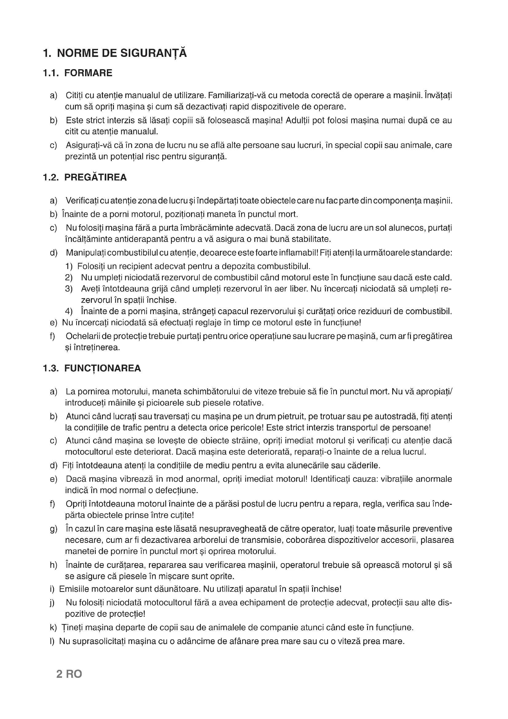 1.1. FORMARE a) Citiți cu atenție manualul de utilizare. Familiarizați-vă cu metoda corectă de operare a mașinii. Învățați cum să opriți mașina și cum să dezactivați rapid dispozitivele de operare. b) Este strict interzis să lăsați copiii să folosească mașina! Adulții pot folosi mașina numai după ce au citit cu atenție manualul. c) Asigurați-vă că în zona de lucru nu se aă alte persoane sau lucruri, în special copii sau animale, care prezintă un potențial risc pentru siguranță. 1.2. PREGĂTIREA a) Vericați cu atenție zona de lucru și îndepărtați toate obiectele care nu fac parte din componența mașinii. b) Înainte de a porni motorul, poziționați maneta în punctul mort. c) Nu folosiți mașina fără a purta îmbrăcăminte adecvată. Dacă zona de lucru are un sol alunecos, purtați încălțăminte antiderapantă pentru a vă asigura o mai bună stabilitate. d) Manipulați combustibilul cu atenție, deoarece este foarte inamabil! Fiți atenți la următoarele standarde: