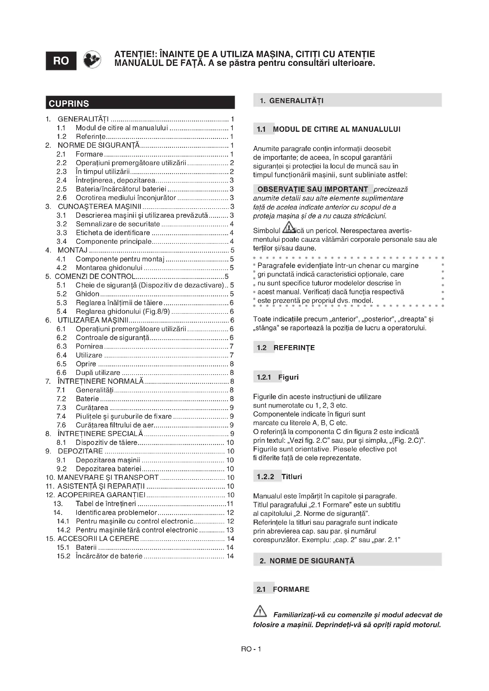 IMPORTANT Următoarele norme de siguranţă cuprind indicaţiile de siguranţă din manualul specic al bateriei şi al încărcătorului de baterie, anexat maşinii.