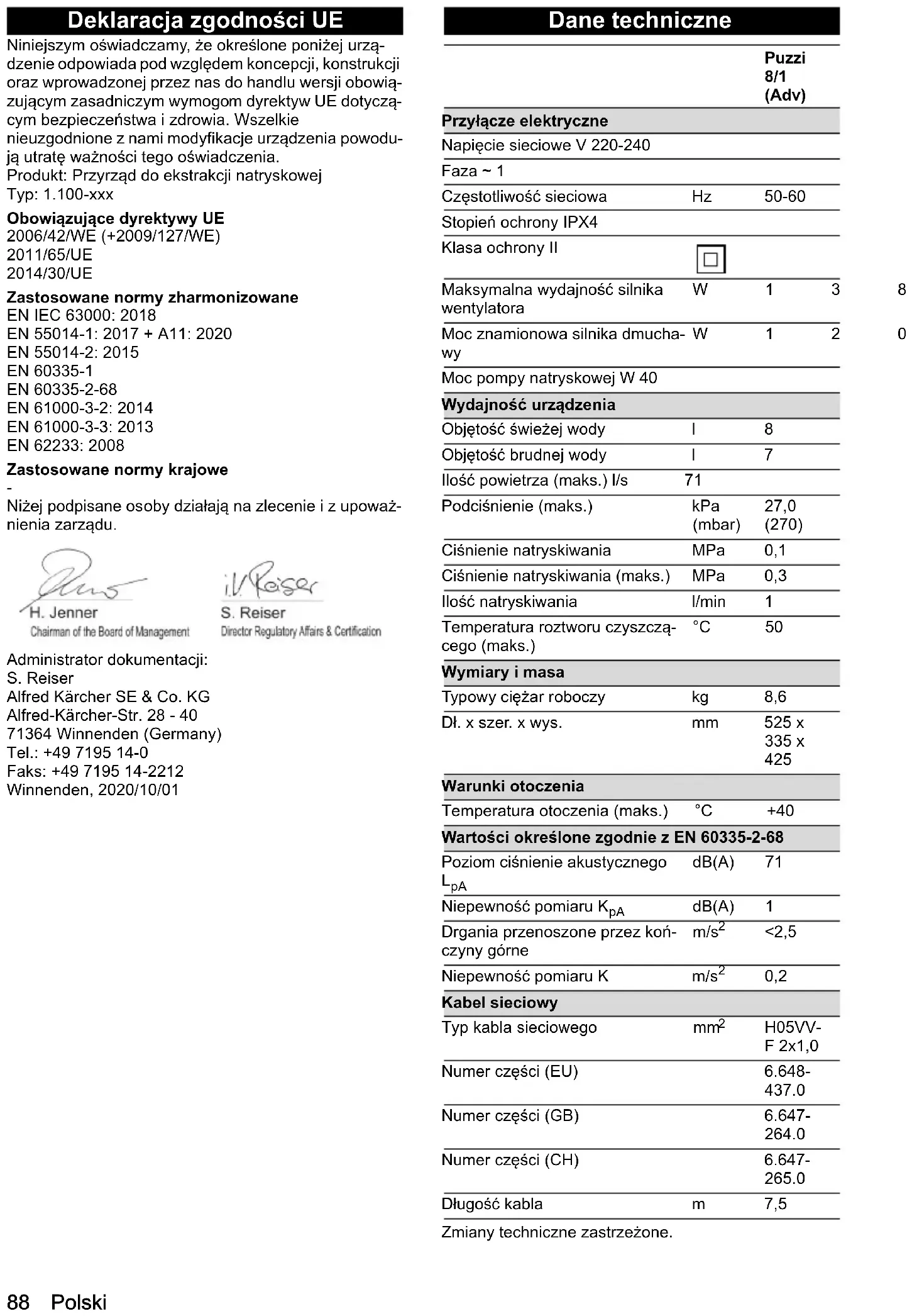 riu special) în recipientul de apă reziduală. Departamentul de asistenţă clienţi Dacă defecţiunea nu poate fi remediată, aparatul trebu- ie verificat de departamentul de asistenţă clienţi. Garanţie În fiecare ţară sunt valabile condiţiile de garanţie publi- cate de distribuitorul nostru din ţara respectivă. Eventu- ale defecţiuni ale acestui aparat, care survin în perioada de garanţie şi care sunt rezultatul unor defecte de fabri- caţie sau de material, vor fi remediate gratuit. Pentru a putea beneficia de garanţie, prezentaţi-vă cu chitanţa de cumpărare la magazin sau la cea mai apropiată uni- tate de service autorizată. (Pentru adresă, consultaţi pagina din spate) Accesorii şi piese de schimb Utilizaţi numai accesorii originale şi piese de schimb ori- ginale; ele asigură funcţionarea în siguranţă şi fără ava- rii a aparatului. Informaţii despre accesorii şi piesele de schimb se gă- sesc la adresa www.kaercher.com. Declaraţie de conformitate UE Prin prezenta, declarăm că aparatul indicat mai jos co- respunde cerinţelor fundamentale privind siguranţa şi sănătatea prevăzute în directivele UE relevante, prin proiectarea și construcția sa, precum și în versiunea co- mercializată de noi. În cazul efectuării unei modificări a aparatului care nu a fost convenită cu noi, această de- claraţie îşi pierde valabilitatea. Produs: Aparat de pulverizare-extracţie Tip: 1.100-xxx Directive UE relevante 2006/42/UE (+2009/127/UE) 2011/65/UE 2014/30/UE Norme armonizate aplicate EN IEC 63000: 2018 EN 55014-1: 2017 + A11: 2020 EN 55014-2: 2015 EN 60335-1 EN 60335-2-68 EN 61000-3-2: 2014 EN 61000-3-3: 2013 EN 62233: 2008 Standarde naţionale aplicate