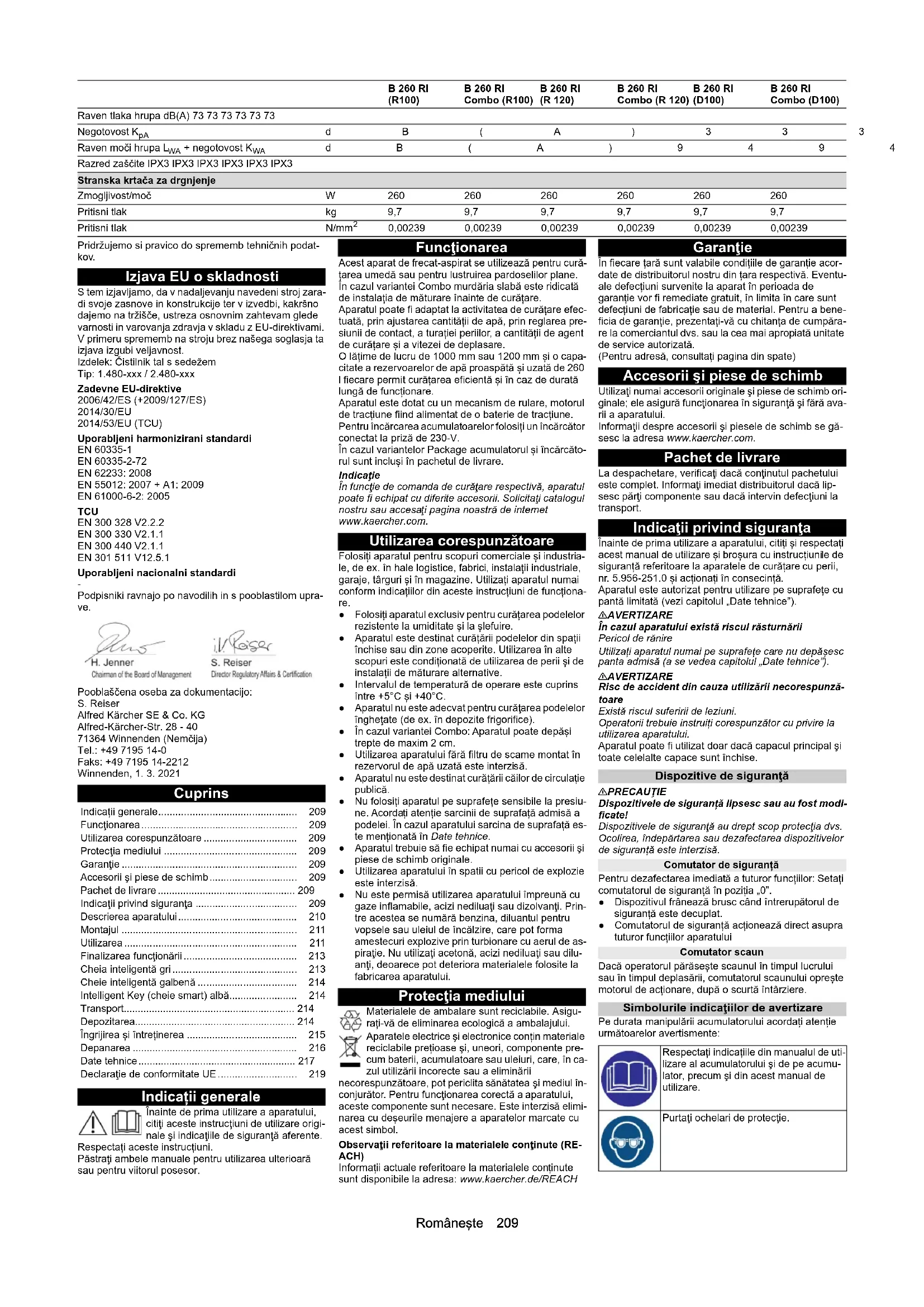 Încărcătorul offboard din fabrică Lungime cablu mm 3000 3000 3000 3000 3000 3000 Tensiune V 230 230 230 230 230 230 Domeniul de frecvențe Hz 50/60 50/60 50/60 50/60 50/60 50/60 Dimensiuni mm 420 x 260 x 115 420 x 260 x 115 420 x 260 x 115 420 x 260 x 115 420 x 260 x 115 420 x 260 x 115 Greutate kg101010101010 Clasă de protecţie IP 21 IP 21 IP 21 IP 21 IP 21 IP 21 Tipul de fișă Schuko Schuko Schuko Schuko Schuko Schuko Curent de încărcare A 65 65 65 65 65 65 Condiții de mediu Temperatura ambientală maximă °C 40 40 40 40 40 40 Temperatura ambientală minimă °C555555 Temperatură maximă a apei °C606060606060 B 260 RI ( R100) B 260 RI Combo (R100) B 260 RI (R 120) B 260 RI Combo (R 120) B 260 RI (D100) B 260 RI Combo (D100)Hrvatski 219 Sub rezerva modificărilor tehnice. Declaraţie de conformitate UE Prin prezenta, declarăm că aparatul indicat mai jos co- respunde cerinţelor fundamentale privind siguranţa şi sănătatea prevăzute în directivele UE relevante, prin proiectarea și construcția sa, precum și în versiunea co- mercializată de noi. În cazul efectuării unei modificări a aparatului care nu a fost convenită cu noi, această de- claraţie îşi pierde valabilitatea. Produs: Dispozitiv de curăţare a pardoselilor maşină cu post de conducere Tip: 1.480-xxx / 2.480-xxx Directive UE relevante 2006/42/UE (+2009/127/UE) 2014/30/UE 2014/53/UE (TCU) Norme armonizate aplicate EN 60335-1 EN 60335-2-72 EN 62233: 2008 EN 55012: 2007 + A1: 2009 EN 61000-6-2: 2005 TCU EN 300 328 V2.2.2 EN 300 330 V2.1.1 EN 300 440 V2.1.1 EN 301 511 V12.5.1 Standarde naţionale aplicate