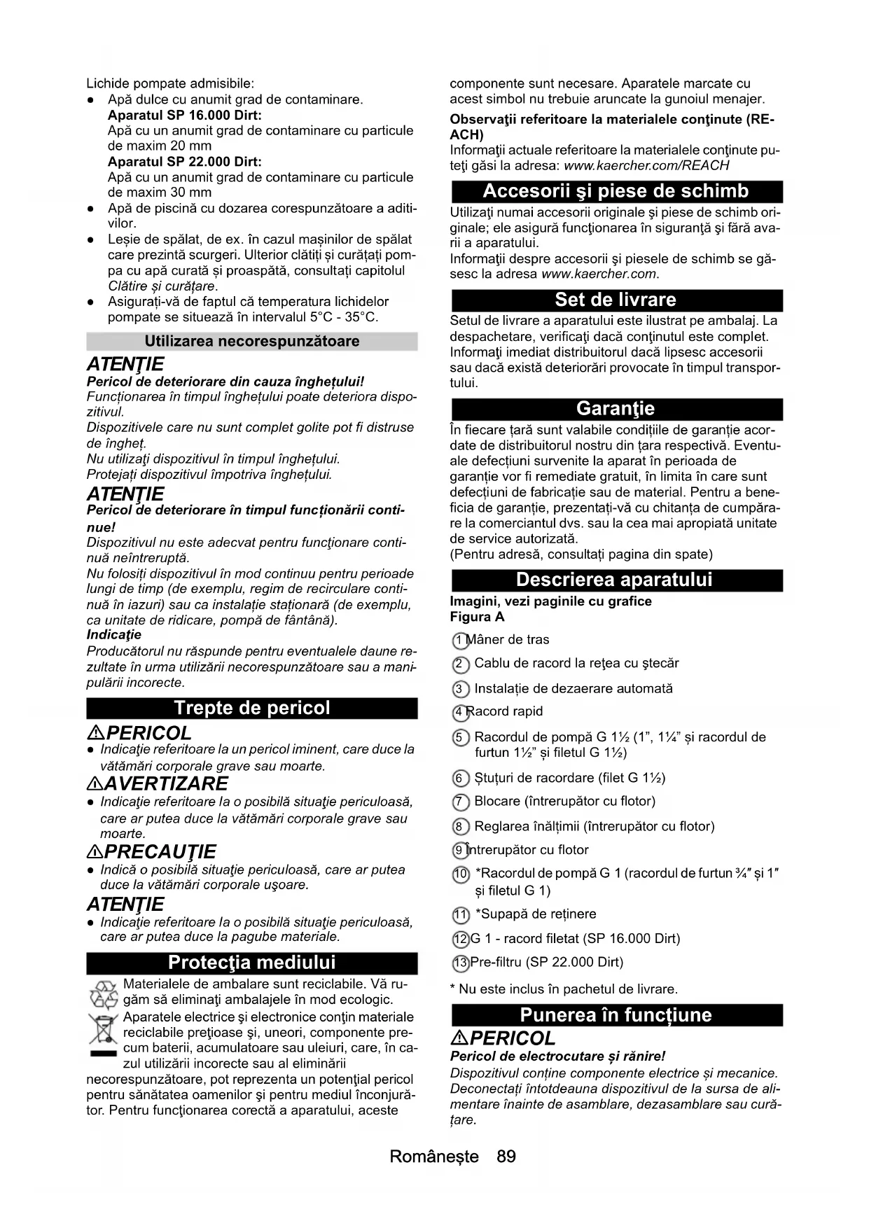 - Declaraţie de conformitate UE Româneşte 89 Lichide pompate admisibile: ● Apă dulce cu anumit grad de contaminare. Aparatul SP 16.000 Dirt: Apă cu un anumit grad de contaminare cu particule de maxim 20 mm Aparatul SP 22.000 Dirt: Apă cu un anumit grad de contaminare cu particule de maxim 30 mm ● Apă de piscină cu dozarea corespunzătoare a aditi- vilor. ● Leșie de spălat, de ex. în cazul mașinilor de spălat care prezintă scurgeri. Ulterior clătiți și curățați pom- pa cu apă curată și proaspătă, consultați capitolul Clătire și curățare. ● Asigurați-vă de faptul că temperatura lichidelor pompate se situează în intervalul 5°C - 35°C. Utilizarea necorespunzătoare ATENŢIE Pericol de deteriorare din cauza înghețului! Funcționarea în timpul înghețului poate deteriora dispo- zitivul. Dispozitivele care nu sunt complet golite pot fi distruse de îngheț. Nu utilizaţi dispozitivul în timpul înghețului. Protejați dispozitivul împotriva înghețului. ATENŢIE Pericol de deteriorare în timpul funcționării conti- nue! Dispozitivul nu este adecvat pentru funcţionare conti- nuă neîntreruptă. Nu folosiți dispozitivul în mod continuu pentru perioade lungi de timp (de exemplu, regim de recirculare conti- nuă în iazuri) sau ca instalație staționară (de exemplu, ca unitate de ridicare, pompă de fântână). Indicaţie Producătorul nu răspunde pentru eventualele daune re- zultate în urma utilizării necorespunzătoare sau a mani- pulării incorecte. Trepte de pericol PERICOL ● Indicaţie referitoare la un pericol iminent, care duce la vătămări corporale grave sau moarte. 몇 AVERTIZARE ● Indicaţie referitoare la o posibilă situaţie periculoasă, care ar putea duce la vătămări corporale grave sau moarte. 몇 PRECAUŢIE ● Indică o posibilă situaţie periculoasă, care ar putea duce la vătămări corporale uşoare. ATENŢIE ● Indicaţie referitoare la o posibilă situaţie periculoasă, care ar putea duce la pagube materiale. Protecţia mediului Materialele de ambalare sunt reciclabile. Vă ru- găm să eliminaţi ambalajele în mod ecologic. Aparatele electrice şi electronice conţin materiale reciclabile preţioase şi, uneori, componente pre- cum baterii, acumulatoare sau uleiuri, care, în ca- zul utilizării incorecte sau al eliminării necorespunzătoare, pot reprezenta un potenţial pericol pentru sănătatea oamenilor şi pentru mediul înconjură- tor. Pentru funcţionarea corectă a aparatului, aceste componente sunt necesare. Aparatele marcate cu acest simbol nu trebuie aruncate la gunoiul menajer. Observaţii referitoare la materialele conţinute (RE- ACH) Informaţii actuale referitoare la materialele conţinute pu- teţi găsi la adresa: www.kaercher.com/REACH Accesorii şi piese de schimb Utilizaţi numai accesorii originale şi piese de schimb ori- ginale; ele asigură funcţionarea în siguranţă şi fără ava- rii a aparatului. Informaţii despre accesorii şi piesele de schimb se gă- sesc la adresa www.kaercher.com. Set de livrare Setul de livrare a aparatului este ilustrat pe ambalaj. La despachetare, verificaţi dacă conţinutul este complet. Informaţi imediat distribuitorul dacă lipsesc accesorii sau dacă există deteriorări provocate în timpul transpor- tului. Garanţie În fiecare țară sunt valabile condițiile de garanție acor- date de distribuitorul nostru din țara respectivă. Eventu- ale defecțiuni survenite la aparat în perioada de garanție vor fi remediate gratuit, în limita în care sunt defecțiuni de fabricație sau de material. Pentru a bene- ficia de garanție, prezentați-vă cu chitanța de cumpăra- re la comerciantul dvs. sau la cea mai apropiată unitate de service autorizată. (Pentru adresă, consultați pagina din spate) Descrierea aparatului Imagini, vezi paginile cu grafice Figura A 1 Mâner de tras 2 Cablu de racord la reţea cu ştecăr 3 Instalație de dezaerare automată 4 Racord rapid 5 Racordul de pompă G 1½ (1”, 1¼” și racordul de furtun 1½” și filetul G 1½) 6 Ștuțuri de racordare (filet G 1½) 7 Blocare (întrerupător cu flotor) 8 Reglarea înălțimii (întrerupător cu flotor) 9 Întrerupător cu flotor 10 *Racordul de pompă G 1 (racordul de furtun ¾″ și 1″ și filetul G 1) 11 *Supapă de reținere 12 G 1 - racord filetat (SP 16.000 Dirt) 13 Pre-filtru (SP 22.000 Dirt) p. 92
