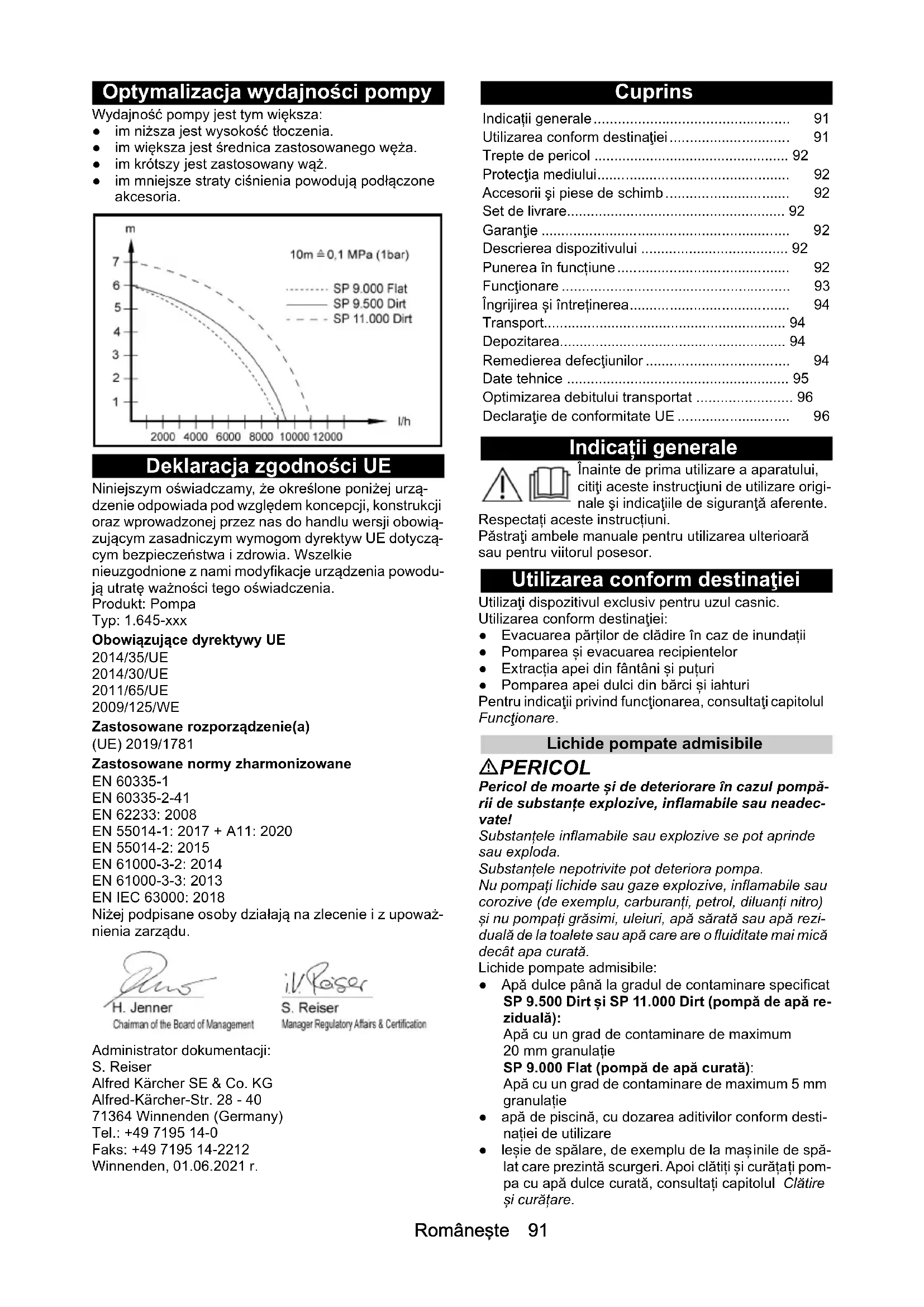 • DirtRomâneşte 91 Optymalizacja wydajności pompy Wydajność pompy jest tym większa: ● im niższa jest wysokość tłoczenia. ● im większa jest średnica zastosowanego węża. ● im krótszy jest zastosowany wąż. ● im mniejsze straty ciśnienia powodują podłączone akcesoria. Deklaracja zgodności UE Niniejszym oświadczamy, że określone poniżej urzą- dzenie odpowiada pod względem koncepcji, konstrukcji oraz wprowadzonej przez nas do handlu wersji obowią- zującym zasadniczym wymogom dyrektyw UE dotyczą- cym bezpieczeństwa i zdrowia. Wszelkie nieuzgodnione z nami modyfikacje urządzenia powodu- ją utratę ważności tego oświadczenia. Produkt: Pompa Typ: 1.645-xxx Obowiązujące dyrektywy UE 2014/35/UE 2014/30/UE 2011/65/UE 2009/125/WE Zastosowane rozporządzenie(a) (UE) 2019/1781 Zastosowane normy zharmonizowane EN 60335-1 EN 60335-2-41 EN 62233: 2008 EN 55014-1: 2017 + A11: 2020 EN 55014-2: 2015 EN 61000-3-2: 2014 EN 61000-3-3: 2013 EN IEC 63000: 2018 Niżej podpisane osoby działają na zlecenie i z upoważ- nienia zarządu. Administrator dokumentacji: S. Reiser Alfred Kärcher SE & Co. KG Alfred-Kärcher-Str. 28 - 40 71364 Winnenden (Germany) Tel.: +49 7195 14-0 Faks: +49 7195 14-2212 Winnenden, 01.06.2021 r. Cuprins Indicații generale Înainte de prima utilizare a aparatului, citiţi aceste instrucţiuni de utilizare origi- nale şi indicaţiile de siguranţă aferente. Respectați aceste instrucțiuni. Păstraţi ambele manuale pentru utilizarea ulterioară sau pentru viitorul posesor. Utilizarea conform destinaţiei Utilizaţi dispozitivul exclusiv pentru uzul casnic. Utilizarea conform destinaţiei: ● Evacuarea părților de clădire în caz de inundații ● Pomparea și evacuarea recipientelor ● Extracția apei din fântâni și puțuri ● Pomparea apei dulci din bărci și iahturi Pentru indicaţii privind funcţionarea, consultaţi capitolul Funcţionare. Lichide pompate admisibile PERICOL Pericol de moarte și de deteriorare în cazul pompă- rii de substanțe explozive, inflamabile sau neadec- vate! Substanțele inflamabile sau explozive se pot aprinde sau exploda. Substanțele nepotrivite pot deteriora pompa. Nu pompați lichide sau gaze explozive, inflamabile sau corozive (de exemplu, carburanți, petrol, diluanți nitro) și nu pompați grăsimi, uleiuri, apă sărată sau apă rezi- duală de la toalete sau apă care are o fluiditate mai mică decât apa curată. Lichide pompate admisibile: ● Apă dulce până la gradul de contaminare specificat SP 9.500 Dirt și SP 11.000 Dirt (pompă de apă re- ziduală): Apă cu un grad de contaminare de maximum 20 mm granulație SP 9.000 Flat (pompă de apă curată): Apă cu un grad de contaminare de maximum 5 mm granulație ● apă de piscină, cu dozarea aditivilor conform desti- nației de utilizare ● leșie de spălare, de exemplu de la maș inile de spă- lat care prezintă scurgeri. Apoi clătiți și curățați pom- pa cu apă dulce curată, consultați capitolul Clătire și curățare. Indicații generale p. 91