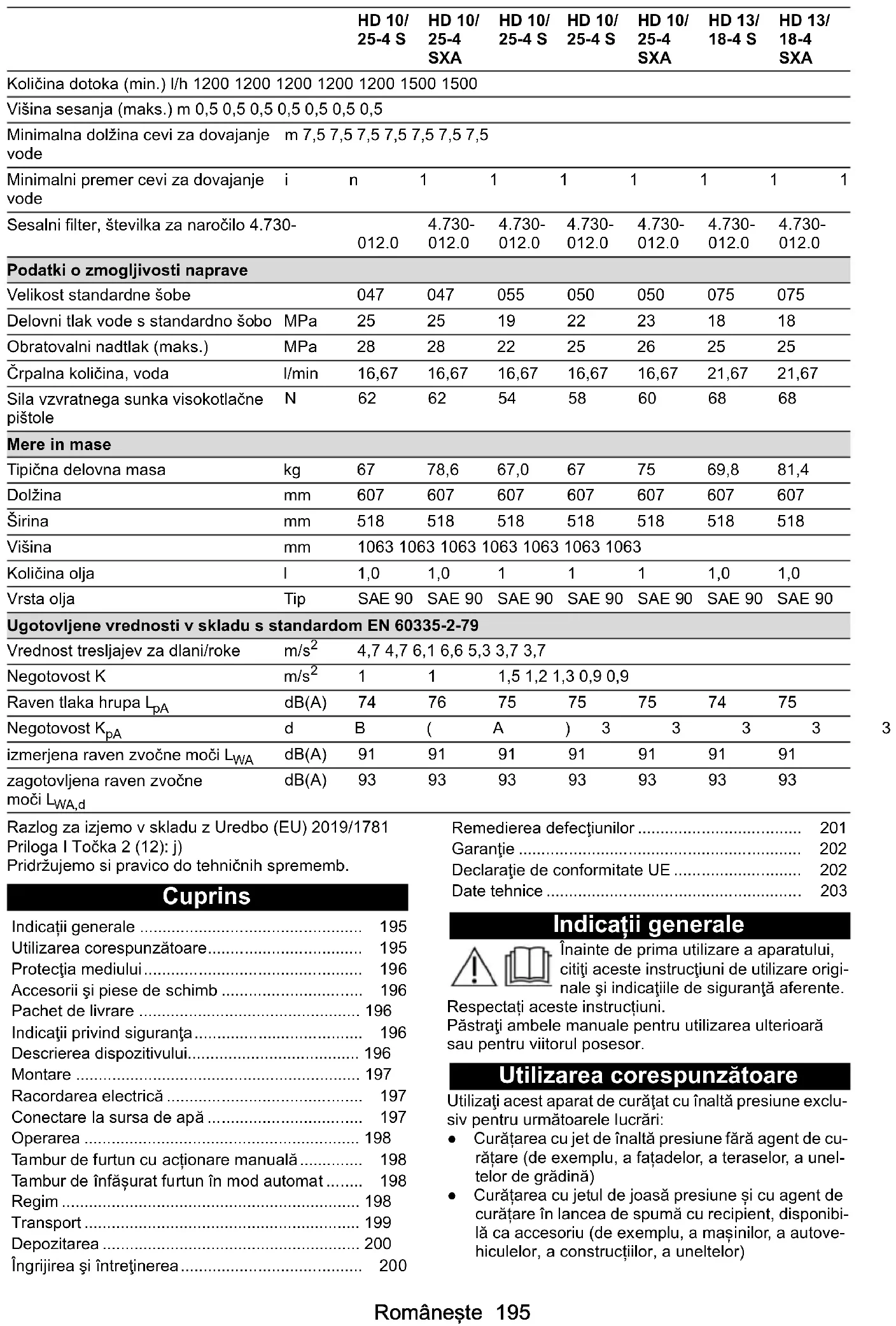Priključek za vodo Tlak na dotoku (maks.) MPa1111111 Temperatura na dotoku (maks.)°C 60606060606060Româneşte 195 Razlog za izjemo v skladu z Uredbo (EU) 2019/1781 Priloga I Točka 2 (12): j) Pridržujemo si pravico do tehničnih sprememb. Cuprins Indicații generale Înainte de prima utilizare a aparatului, citiţi aceste instrucţiuni de utilizare origi- nale şi indicaţiile de siguranţă aferente. Respectați aceste instrucțiuni. Păstraţi ambele manuale pentru utilizarea ulterioară sau pentru viitorul posesor. Utilizarea corespunzătoare Utilizaţi acest aparat de curăţat cu înaltă presiune exclu- siv pentru următoarele lucrări: ● Curățarea cu jet de înaltă presiune fără agent de cu- rățare (de exemplu, a fațadelor, a teraselor, a unel- telor de grădină) ● Curățarea cu jetul de joasă presiune și cu agent de curățare în lancea de spumă cu recipient, disponibi- lă ca accesoriu (de exemplu, a mașinilor, a autove- hiculelor, a construcțiilor, a uneltelor) Količina dotoka (min.) l/h 1200 1200 1200 1200 1200 1500 1500 Višina sesanja (maks.) m 0,5 0,5 0,5 0,5 0,5 0,5 0,5 Minimalna dolžina cevi za dovajanje vode m 7,5 7,5 7,5 7,5 7,5 7,5 7,5 Minimalni premer cevi za dovajanje vode in1111111 Sesalni filter, številka za naročilo 4.730-