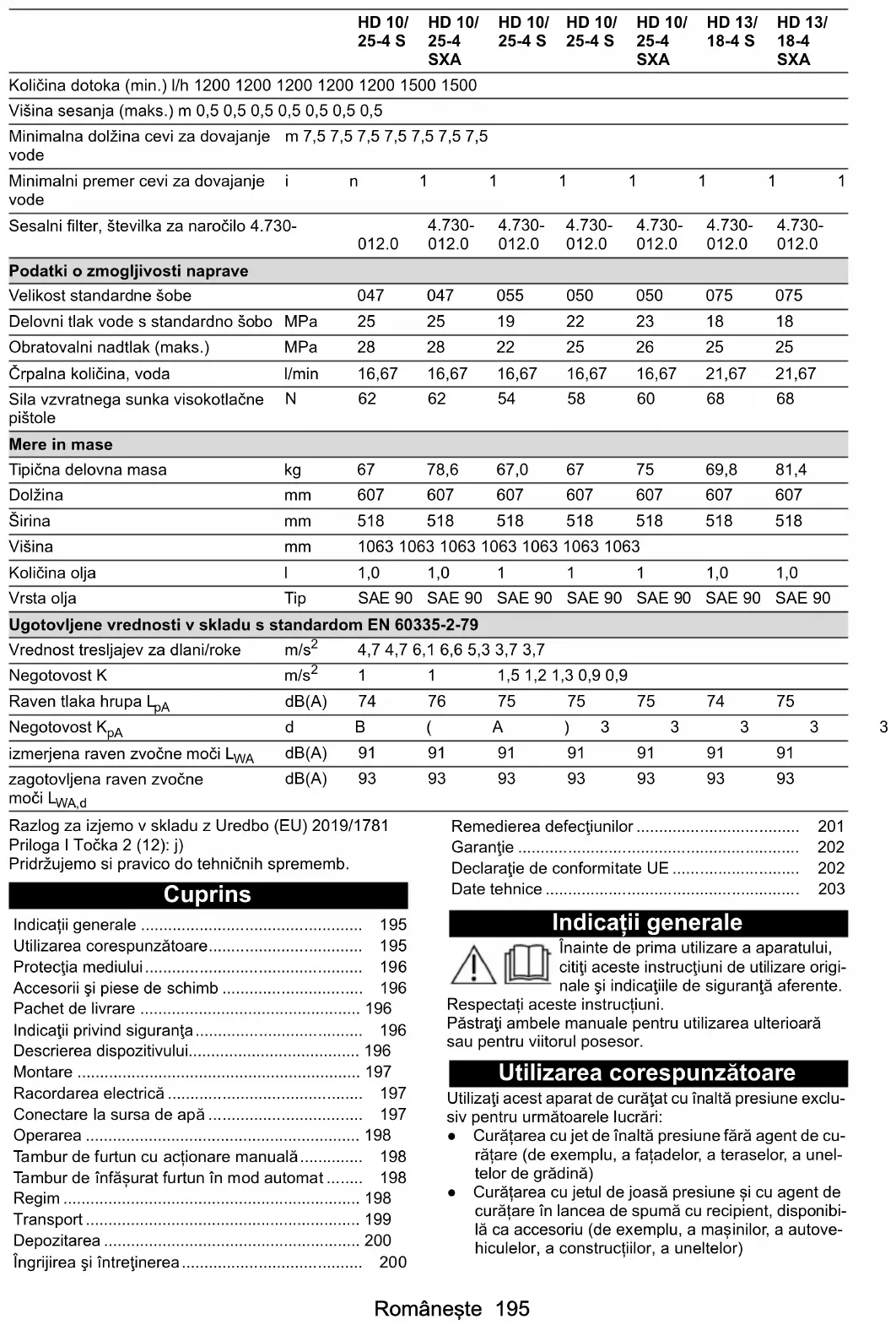 Priključek za vodo Tlak na dotoku (maks.) MPa1111111 Temperatura na dotoku (maks.)°C 60606060606060Româneşte 195 Razlog za izjemo v skladu z Uredbo (EU) 2019/1781 Priloga I Točka 2 (12): j) Pridržujemo si pravico do tehničnih sprememb. Cuprins Indicații generale Înainte de prima utilizare a aparatului, citiţi aceste instrucţiuni de utilizare origi- nale şi indicaţiile de siguranţă aferente. Respectați aceste instrucțiuni. Păstraţi ambele manuale pentru utilizarea ulterioară sau pentru viitorul posesor. Utilizarea corespunzătoare Utilizaţi acest aparat de curăţat cu înaltă presiune exclu- siv pentru următoarele lucrări: ● Curățarea cu jet de înaltă presiune fără agent de cu- rățare (de exemplu, a fațadelor, a teraselor, a unel- telor de grădină) ● Curățarea cu jetul de joasă presiune și cu agent de curățare în lancea de spumă cu recipient, disponibi- lă ca accesoriu (de exemplu, a mașinilor, a autove- hiculelor, a construcțiilor, a uneltelor) Količina dotoka (min.) l/h 1200 1200 1200 1200 1200 1500 1500 Višina sesanja (maks.) m 0,5 0,5 0,5 0,5 0,5 0,5 0,5 Minimalna dolžina cevi za dovajanje vode m 7,5 7,5 7,5 7,5 7,5 7,5 7,5 Minimalni premer cevi za dovajanje vode in1111111 Sesalni filter, številka za naročilo 4.730-