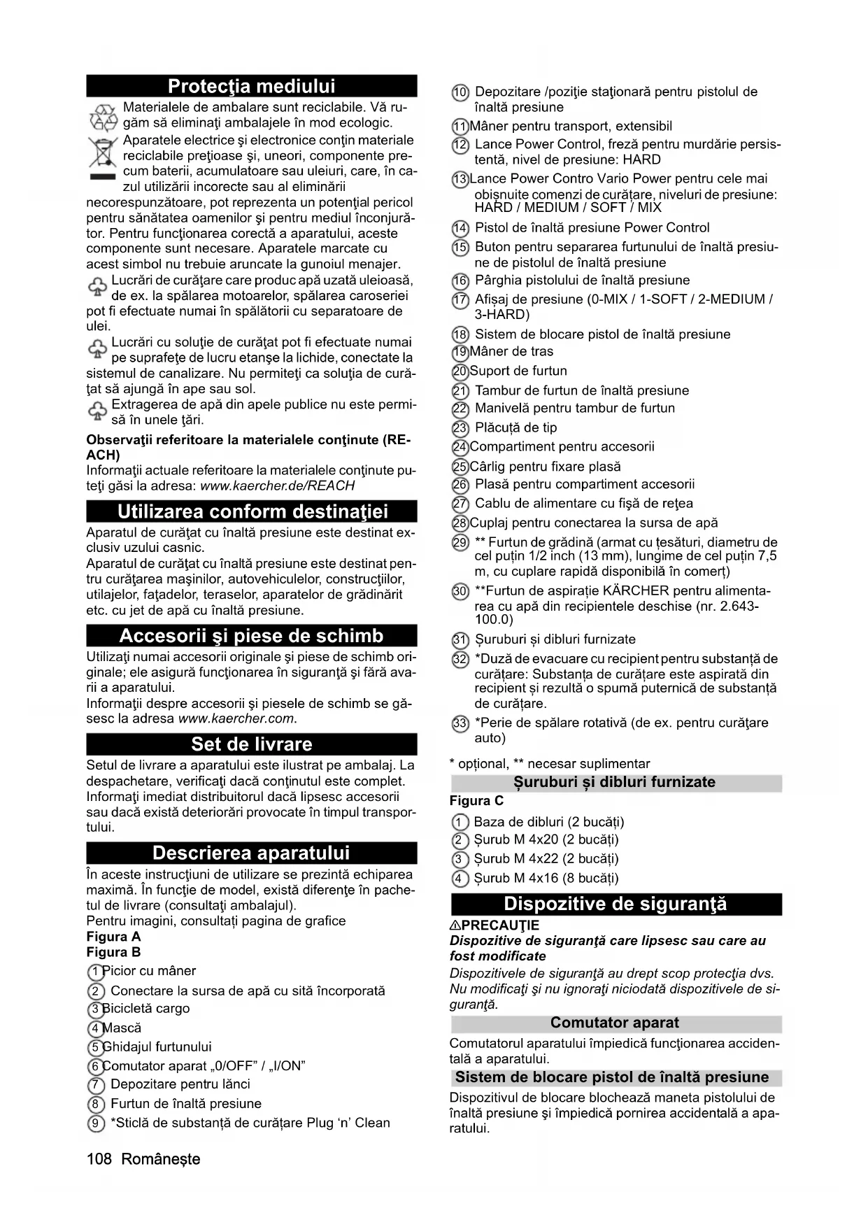 • Declaraţie de conformitate UE 08 Româneşte Protecţia mediului Materialele de ambalare sunt reciclabile. Vă ru- găm să eliminaţi ambalajele în mod ecologic. Aparatele electrice şi electronice conţin materiale reciclabile preţioase şi, uneori, componente pre- cum baterii, acumulatoare sau uleiuri, care, în ca- zul utilizării incorecte sau al eliminării necorespunzătoare, pot reprezenta un potenţial pericol pentru sănătatea oamenilor şi pentru mediul înconjură- tor. Pentru funcţionarea corectă a aparatului, aceste componente sunt necesare. Aparatele marcate cu acest simbol nu trebuie aruncate la gunoiul menajer. Lucrări de curăţare care produc apă uzată uleioasă, de ex. la spălarea motoarelor, spălarea caroseriei pot fi efectuate numai în spălătorii cu separatoare de ulei. Lucrări cu soluţie de curăţat pot fi efectuate numai pe suprafeţe de lucru etanşe la lichide, conectate la sistemul de canalizare. Nu permiteţi ca soluţia de cură- ţat să ajungă în ape sau sol. Extragerea de apă din apele publice nu este permi- să în unele ţări. Observaţii referitoare la materialele conţinute (RE- ACH) Informaţii actuale referitoare la materialele conţinute pu- teţi găsi la adresa: www.kaercher.de/REACH Utilizarea conform destinaţiei Aparatul de curăţat cu înaltă presiune este destinat ex- clusiv uzului casnic. Aparatul de curăţat cu înaltă presiune este destinat pen- tru curăţarea maşinilor, autovehiculelor, construcţiilor, utilajelor, faţadelor, teraselor, aparatelor de grădinărit etc. cu jet de apă cu înaltă presiune. Accesorii şi piese de schimb Utilizaţi numai accesorii originale şi piese de schimb ori- ginale; ele asigură funcţionarea în siguranţă şi fără ava- rii a aparatului. Informaţii despre accesorii şi piesele de schimb se gă- sesc la adresa www.kaercher.com. Set de livrare Setul de livrare a aparatului este ilustrat pe ambalaj. La despachetare, verificaţi dacă conţinutul este complet. Informaţi imediat distribuitorul dacă lipsesc accesorii sau dacă există deteriorări provocate în timpul transpor- tului. Descrierea aparatului În aceste instrucţiuni de utilizare se prezintă echiparea maximă. În funcţie de model, există diferenţe în pache- tul de livrare (consultaţi ambalajul). Pentru imagini, consultați pagina de grafice Figura A Figura B 1 Picior cu mâner 2 Conectare la sursa de apă cu sită încorporată 3 Bicicletă cargo 4 Mască 5 Ghidajul furtunului 6 Comutator aparat „0/OFF” / „I/ON” 7 Depozitare pentru lănci 8 Furtun de înaltă presiune 9 *Sticlă de substanță de curățare Plug ‘n’ Clean 10 Depozitare /poziţie staţionară pentru pistolul de înaltă presiune 11 Mâner pentru transport, extensibil 12 Lance Power Control, freză pentru murdărie persis- tentă, nivel de presiune: HARD 13 Lance Power Contro Vario Power pentru cele mai obișnuite comenzi de curățare, niveluri de presiune: p. 1121