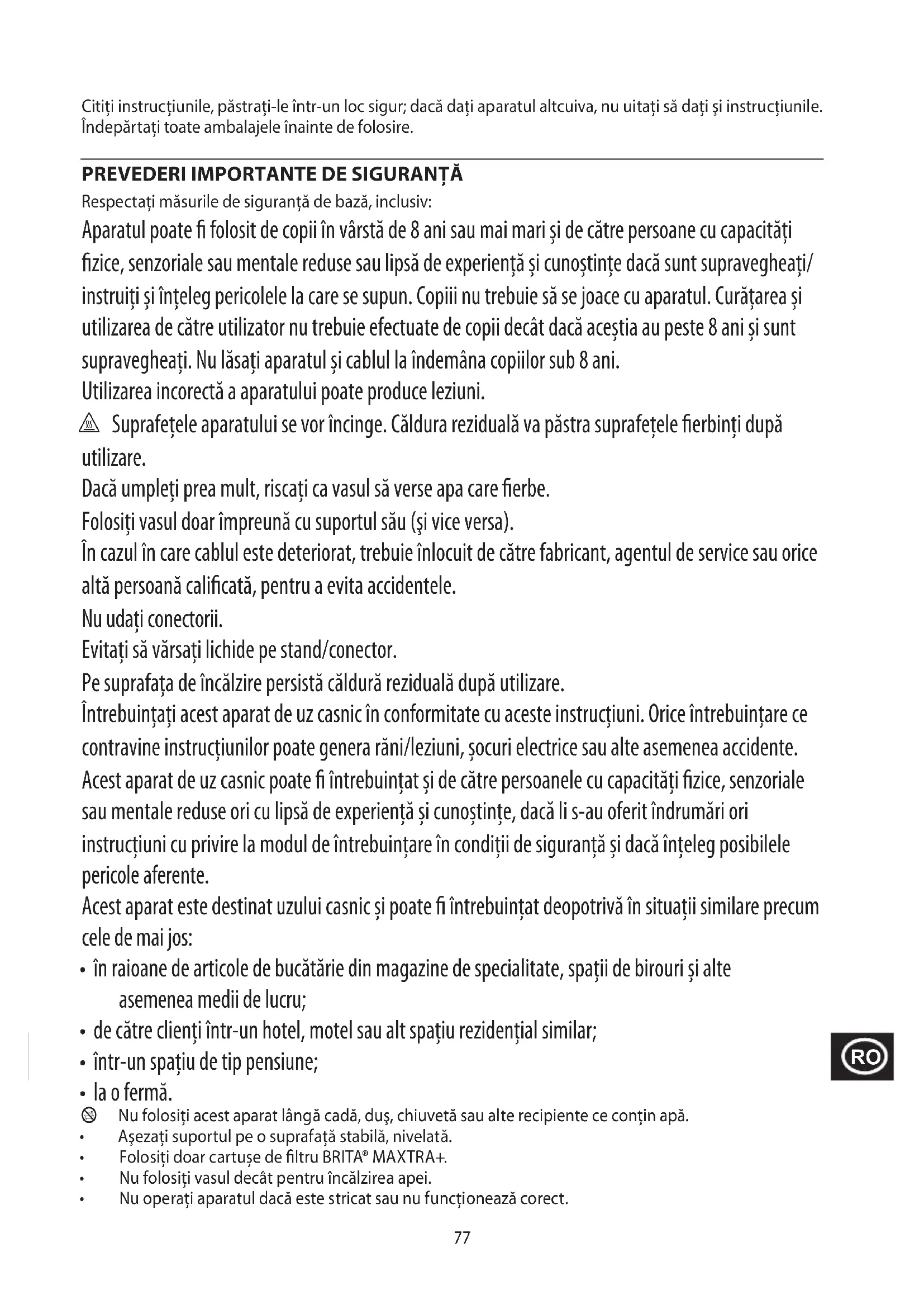 Respectaţi măsurile de siguranţă de bază, inclusiv: Aparatul poate folosit de copii în vârstă de 8 ani sau mai mari și de către persoane cu capacități zice, senzoriale sau mentale reduse sau lipsă de experiență și cunoștințe dacă sunt supravegheați/ instruiți și înțeleg pericolele la care se supun. Copiii nu trebuie să se joace cu aparatul. Curățarea și utilizarea de către utilizator nu trebuie efectuate de copii decât dacă aceștia au peste 8 ani și sunt supravegheați. Nu lăsați aparatul și cablul la îndemâna copiilor sub 8 ani. Utilizarea incorectă a aparatului poate produce leziuni. h Suprafețele aparatului se vor încinge. Căldura reziduală va păstra suprafeţele erbinţi după utilizare. Dacă umpleţi prea mult, riscaţi ca vasul să verse apa care erbe. Folosiţi vasul doar împreună cu suportul său (şi vice versa). În cazul în care cablul este deteriorat, trebuie înlocuit de către fabricant, agentul de service sau orice altă persoană calicată, pentru a evita accidentele. Nu udaţi conectorii. Evitați să vărsați lichide pe stand/conector. Pe suprafața de încălzire persistă căldură reziduală după utilizare. Întrebuințați acest aparat de uz casnic în conformitate cu aceste instrucțiuni. Orice întrebuințare ce contravine instrucțiunilor poate genera răni/leziuni, șocuri electrice sau alte asemenea accidente. Acest aparat de uz casnic poate întrebuințat și de către persoanele cu capacități zice, senzoriale sau mentale reduse ori cu lipsă de experiență și cunoștințe, dacă li s-au oferit îndrumări ori instrucțiuni cu privire la modul de întrebuințare în condiții de siguranță și dacă înțeleg posibilele pericole aferente. Acest aparat este destinat uzului casnic și poate întrebuințat deopotrivă în situații similare precum cele de mai jos: