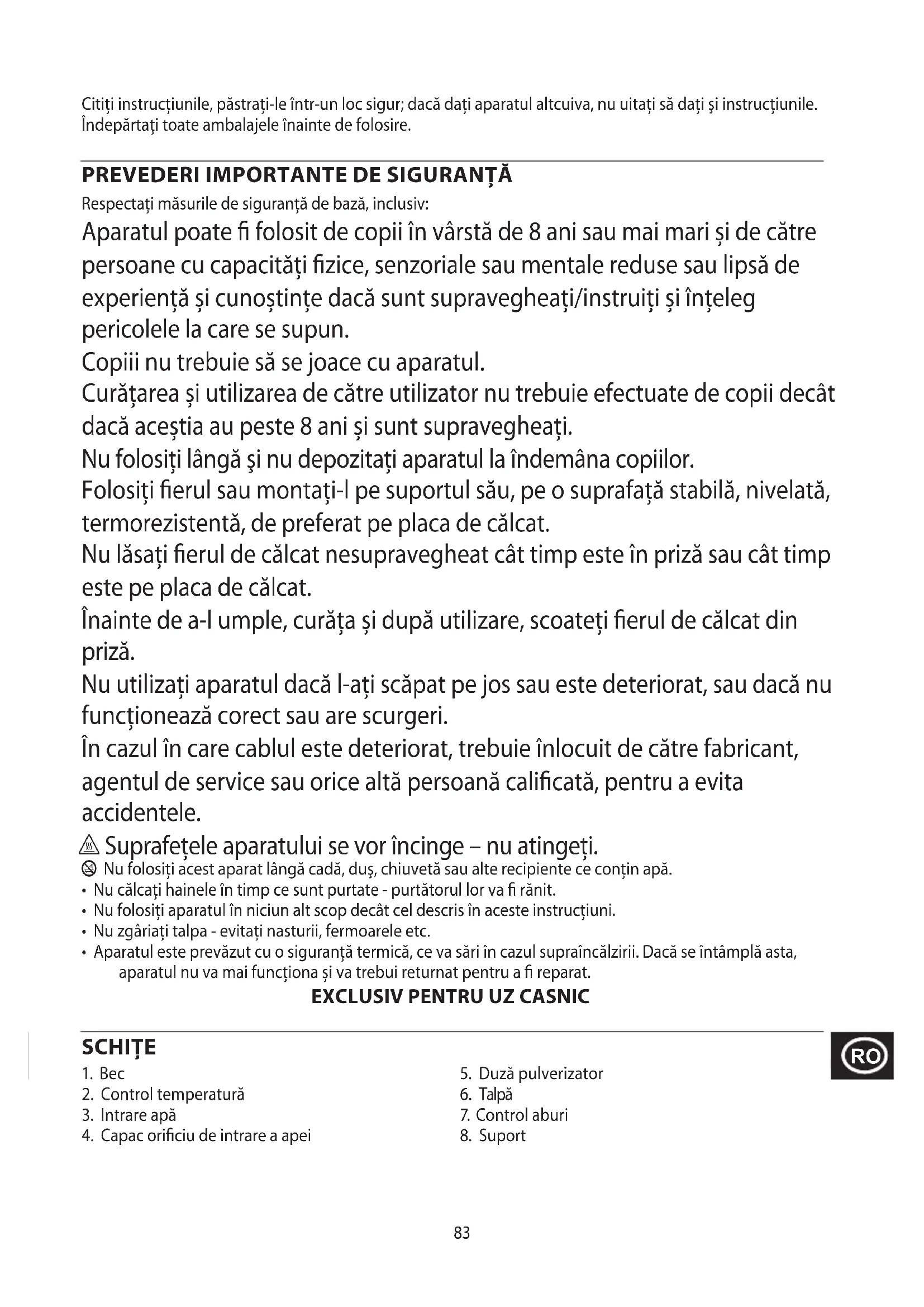 Respectați măsurile de siguranță de bază, inclusiv: Aparatul poate fi folosit de copii în vârstă de 8 ani sau mai mari și de către persoane cu capacități fizice, senzoriale sau mentale reduse sau lipsă de experiență și cunoștințe dacă sunt supravegheați/instruiți și înțeleg pericolele la care se supun. Copiii nu trebuie să se joace cu aparatul. Curățarea și utilizarea de către utilizator nu trebuie efectuate de copii decât dacă aceștia au peste 8 ani și sunt supravegheați. Nu folosiți lângă şi nu depozitați aparatul la îndemâna copiilor. Folosiți fierul sau montați-l pe suportul său, pe o suprafață stabilă, nivelată, termorezistentă, de preferat pe placa de călcat. Nu lăsați fierul de călcat nesupravegheat cât timp este în priză sau cât timp este pe placa de călcat. Înainte de a-l umple, curăța și după utilizare, scoateți fierul de călcat din priză. Nu utilizați aparatul dacă l-ați scăpat pe jos sau este deteriorat, sau dacă nu funcționează corect sau are scurgeri. În cazul în care cablul este deteriorat, trebuie înlocuit de către fabricant, agentul de service sau orice altă persoană calificată, pentru a evita accidentele. h Suprafețele aparatului se vor încinge – nu atingeți. b Nu folosiți acest aparat lângă cadă, duş, chiuvetă sau alte recipiente ce conțin apă.