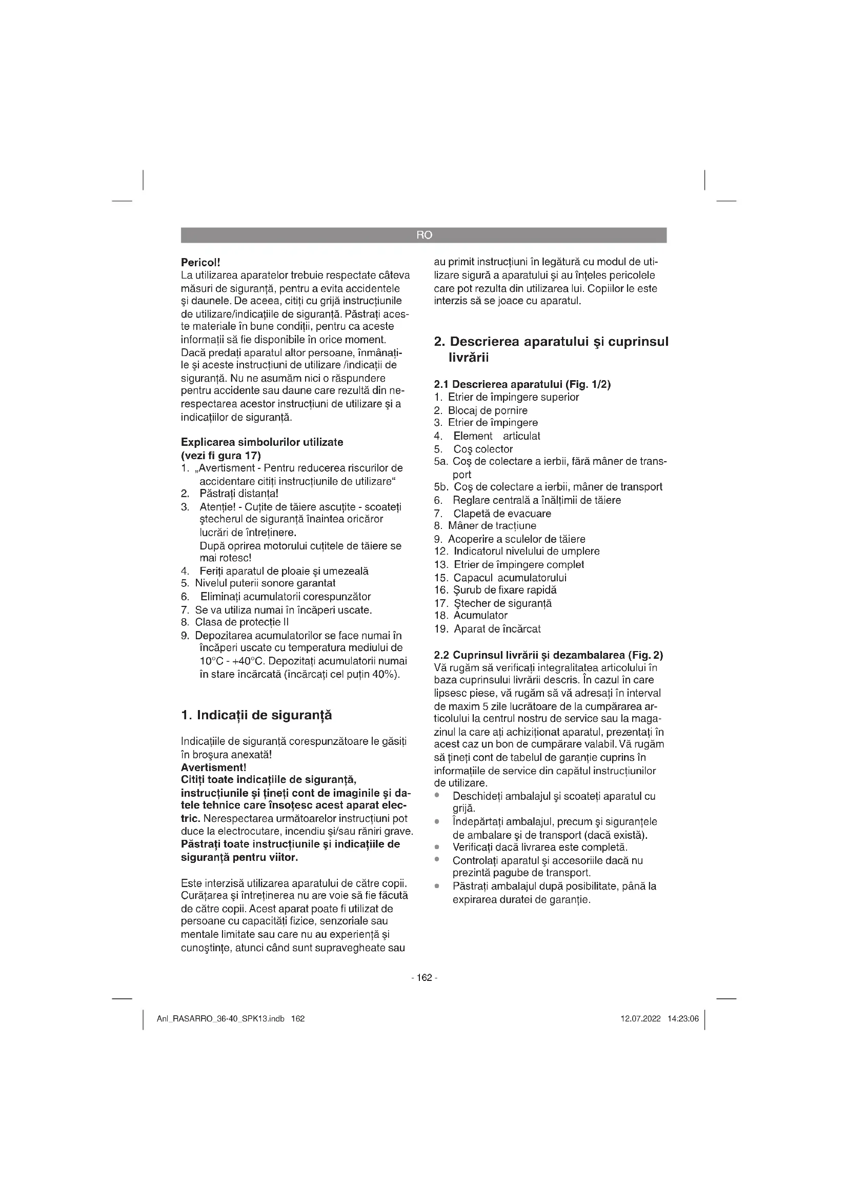 introduceţi-l din nou (a se vedea 5.) f) Desfaceţi îmbinarea bării de ghida- re, verifi caţi contactele dacă sunt murdare şi curăţaţi-le atent cu o perie. Strângeţi din nou îmbinarea bării de ghidare (vezi 5.) Slăbeşte puterea motorului a) Iarbă prea înaltă sau prea umedă b) Carcasa cositoarei înfundată c) Cuţitul este foarte uzat d) Slăbeşte capacitatea acumula- torului a) Corectaţi înălţimea de tăiere b) Curăţaţi carcasa c) Schimbaţi cuţitul d) Verifi caţi capacitatea acumulatoru- lui şi dacă este necesar, încărcaţi acumulatorul (a se vedea 5.) Tăietură neregulată a) Cuţitul este uzat b) Înălţime de tăiere greşită a) Schimbaţi cuţitul sau ascuţiţi-l b) Corectaţi înălţimea de tăiere Indicaţie! Pentru a proteja motorul, acesta este prevăzut cu un întrerupător termic care decuplează la suprasolicitare şi după o scurtă perioadă de răcire cuplează automat din nou! Anl_RASARRO_36-40_SPK13.indb 170Anl_RASARRO_36-40_SPK13.indb 170 12.07.2022 14:23:0812.07.2022 14:23:08RO