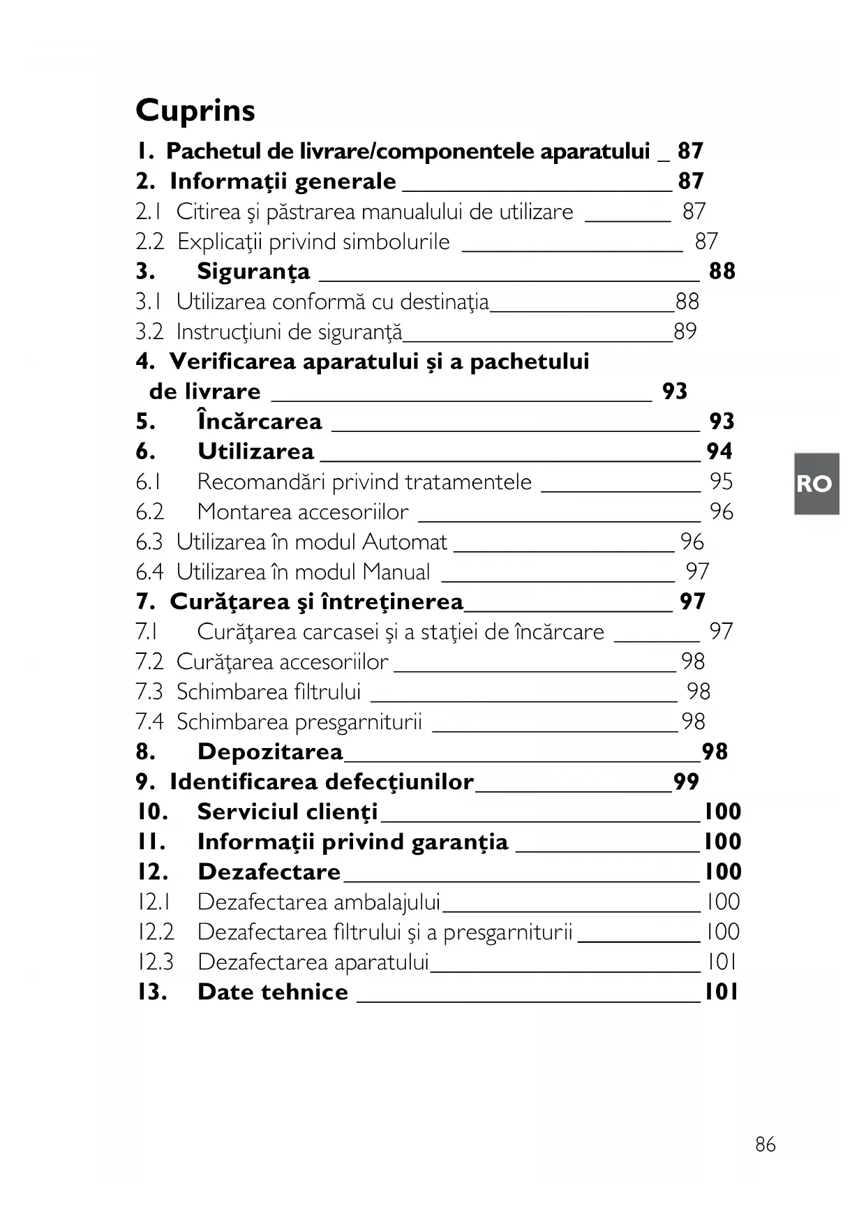 - Aparatul nu este destinat utilizării de către persoanele care nu au împlinit vârsta de16 ani sau de către persoane cu capacități fizice, senzoriale sau mentale reduse, sau de către persoanele care nu dețin cunoștințe sau experiență suficiente, cu excepția cazului în care aceste persoane sunt supravegheate de către o persoană responsabilă pentru siguranța lor sau dacă au fost instruite corespunzător în vederea utilizării în condiții de siguranță a aparatului. Nu lăsați aparatul la îndemâna copiilor. Nu lăsați copiii nesupravegheați să procedeze la curățarea și la mentenanța aparatului.