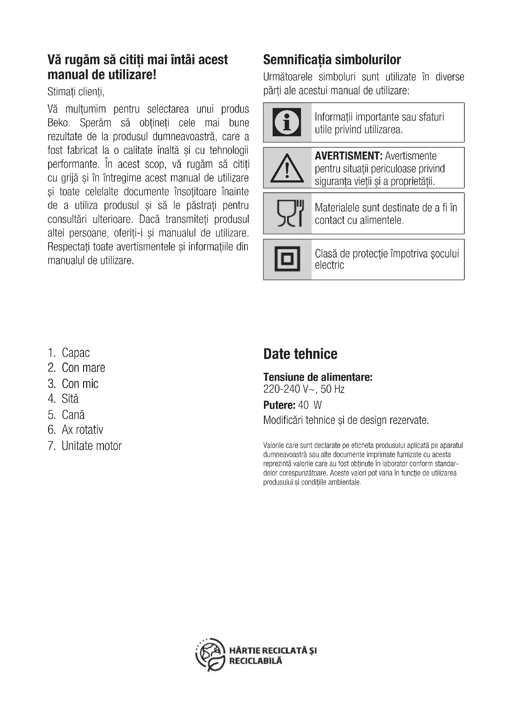 - Tijekom rukovanja i transporta uređaj nosite u originalnom pakiranju. Pakiranje štiti uređaj od fizičkog oštećenja. • Nemojte stavljati teški teret na uređaj ili pakiranje. Može doći do oštećenja uređaja. • Ispuštanje uređaja na tlo može uzrokovati trajno oštećenje i onemogućiti njegov rad.Prilikom puštanja u pogon, opće uporabe i čišćenja obratite pozornost na upute na stranicama 4-5 ovog priručnika.Vă rugăm să citiţi mai întâi acest manual de utilizare! Stimați clienți,Vă mulțumim pentru selectarea unui produs Beko. Sperăm să obţineţi cele mai bune rezultate de la produsul dumneavoastră, care a fost fabricat la o calitate înaltă şi cu tehnologii performante. În acest scop, vă rugăm să citiţi cu grijă şi în întregime acest manual de utilizare şi toate celelalte documente însoţitoare înainte de a utiliza produsul şi să le păstraţi pentru consultări ulterioare. Dacă transmiteţi produsul altei persoane, oferiţi-i şi manualul de utilizare. Respectaţi toate avertismentele şi informaţiile din manualul de utilizare. Semnificaţia simbolurilor Următoarele simboluri sunt utilizate în diverse părţi ale acestui manual de utilizare: Informaţii importante sau sfaturi utile privind utilizarea. AVERTISMENT: Avertismente pentru situații periculoase privind siguranța vieții şi a proprietății.Materialele sunt destinate de a fi în contact cu alimentele.Clasă de protecție împotriva şocului electric