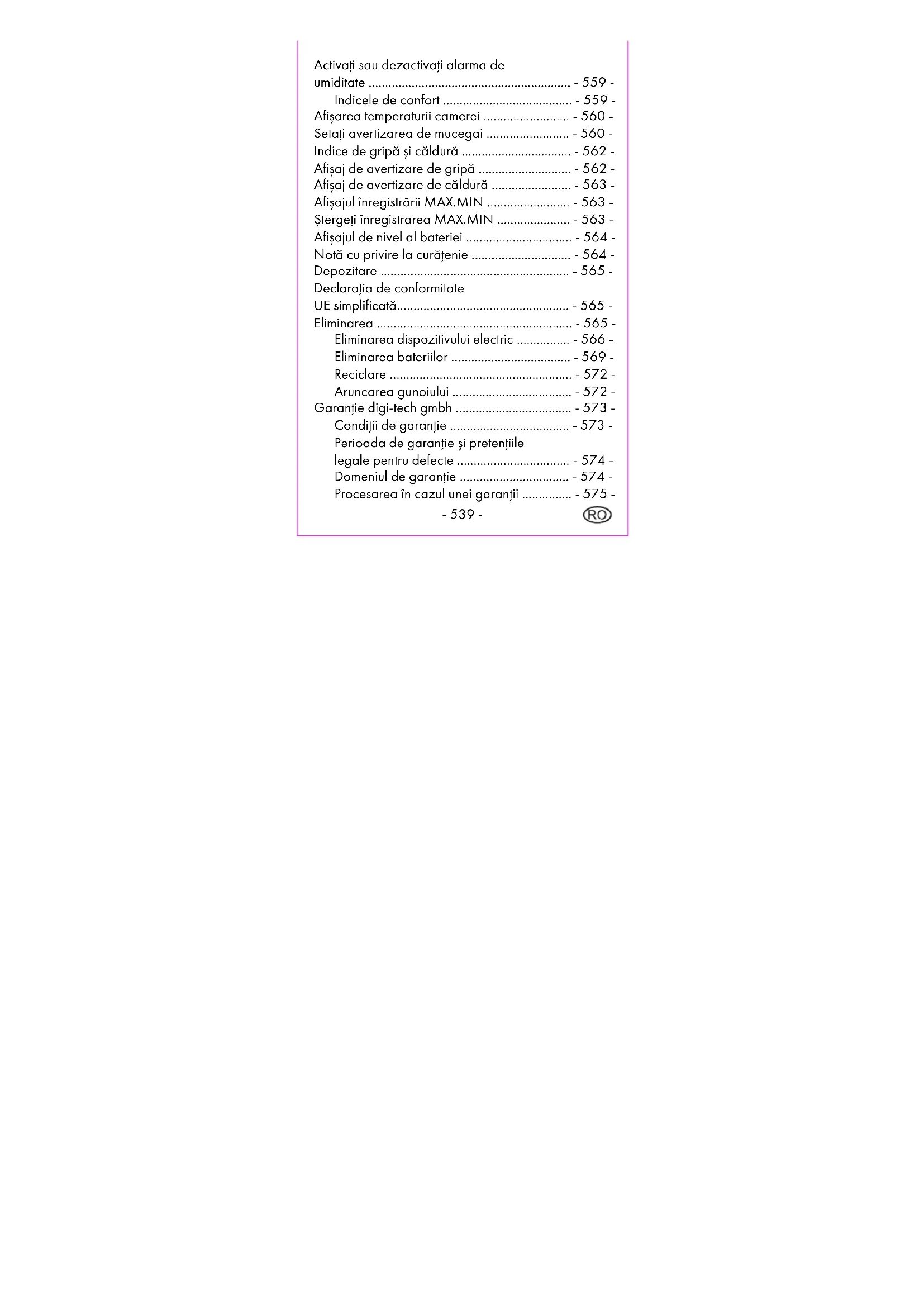 Activaţi sau dezactivaţi alarma de umiditate ............................................................. - 559 - Indicele de confort ....................................... - 559 - Afișarea temperaturii camerei .......................... - 560 - Setaţi avertizarea de mucegai ......................... - 560 - Indice de gripă și căldură ................................. - 562 - Afișaj de avertizare de gripă ............................ - 562 - Afișaj de avertizare de căldură ........................ - 563 - Afișajul înregistrării MAX.MIN ......................... - 563 - Ștergeţi înregistrarea MAX.MIN ...................... - 563 - Afișajul de nivel al bateriei ................................ - 564 - Notă cu privire la curăţenie .............................. - 564 - Depozitare ......................................................... - 565 - Declaraţia de conformitate UE simplificată.................................................... - 565 - Eliminarea ........................................................... - 565 - Eliminarea dispozitivului electric ................ - 566 - Eliminarea bateriilor .................................... - 569 - Reciclare ....................................................... - 572 - Aruncarea gunoiului .................................... - 572 - Garanţie digi-tech gmbh ................................... - 573 - Condiţii de garanţie .................................... - 573 - Perioada de garanţie și pretenţiile legale pentru defecte .................................. - 574 - Domeniul de garanţie ................................. - 574 - Procesarea în cazul unei garanţii ............... - 575 -- 540 -