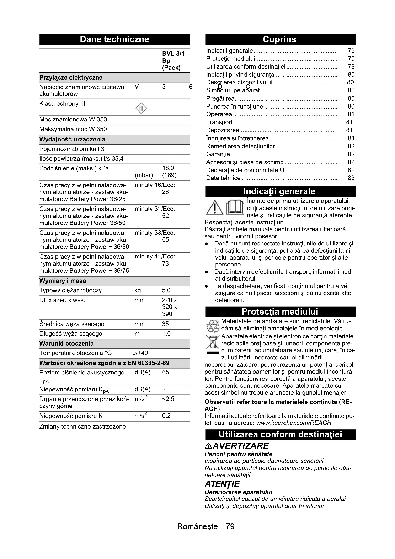 Niżej podpisane osoby działają na zlecenie i z upoważ- nienia zarządu. Administrator dokumentacji: S. Reiser Alfred Kärcher SE & Co. KG Alfred-Kärcher-Str. 28 - 40 71364 Winnenden (Germany) Tel.: +49 7195 14-0 Faks: +49 7195 14-2212 Winnenden, 2020/10/01 Nazwa Numer za- mówienia, część za- mienna Numer arty- kułu, bez opakowania Zestaw akumulatorów Bat- tery Power+ 36/75 2.445-043.0 6.445-059.0 Zestaw akumulatorów Bat- tery Power+ 36/60 2.042-022.0 6.445-085.0 Zestaw akumulatorów Bat- tery Power 36/50 2.445-031.0 6.445-039.0 Zestaw akumulatorów Bat- tery Power 36/25 2.445-030.0 6.445-038.0 Ładowarka do szybkiego ładowania Battery Power+ 36/60 (EU) 2.445-045.0 6.445-063.0 Ładowarka do szybkiego ładowania Battery Power+ 36/60 (GB) 2.445-047.0 6.445-065.0 Ładowarka do szybkiego ładowania Battery Power+ 36/60 (AU) 2.445-051.0 6.445-069.0Româneşte 79 Dane techniczne Zmiany techniczne zastrzeżone. Cuprins Indicaţii generale Înainte de prima utilizare a aparatului, citiţi aceste instrucţiuni de utilizare origi- nale şi indicaţiile de siguranţă aferente. Respectaţi aceste instrucţiuni. Păstraţi ambele manuale pentru utilizarea ulterioară sau pentru viitorul posesor. ● Dacă nu sunt respectate instrucţiunile de utilizare şi indicaţiile de siguranţă, pot apărea defecţiuni la ni- velul aparatului şi pericole pentru operator şi alte persoane. ● Dacă intervin defecţiuni la transport, informaţi imedi- at distribuitorul. ● La despachetare, verificaţi conţinutul pentru a vă asigura că nu lipsesc accesorii şi că nu există alte deteriorări. Protecţia mediului Materialele de ambalare sunt reciclabile. Vă ru- găm să eliminaţi ambalajele în mod ecologic. Aparatele electrice şi electronice conţin materiale reciclabile preţioase şi, uneori, componente pre- cum baterii, acumulatoare sau uleiuri, care, în ca- zul utilizării incorecte sau al eliminării necorespunzătoare, pot reprezenta un potenţial pericol pentru sănătatea oamenilor şi pentru mediul înconjură- tor. Pentru funcţionarea corectă a aparatului, aceste componente sunt necesare. Aparatele marcate cu acest simbol nu trebuie aruncate la gunoiul menajer. Observaţii referitoare la materialele conţinute (RE- ACH) Informaţii actuale referitoare la materialele conţinute pu- teţi găsi la adresa: www.kaercher.com/REACH Utilizarea conform destinaţiei 몇 AVERTIZARE Pericol pentru sănătate Inspirarea de particule dăunătoare sănătăţii Nu utilizaţi aparatul pentru aspirarea de particule dău- nătoare sănătăţii. ATENŢIE Deteriorarea aparatului Scurtcircuitul cauzat de umiditatea ridicată a aerului Utilizaţi şi depozitaţi aparatul doar în interior. BVL 3/1