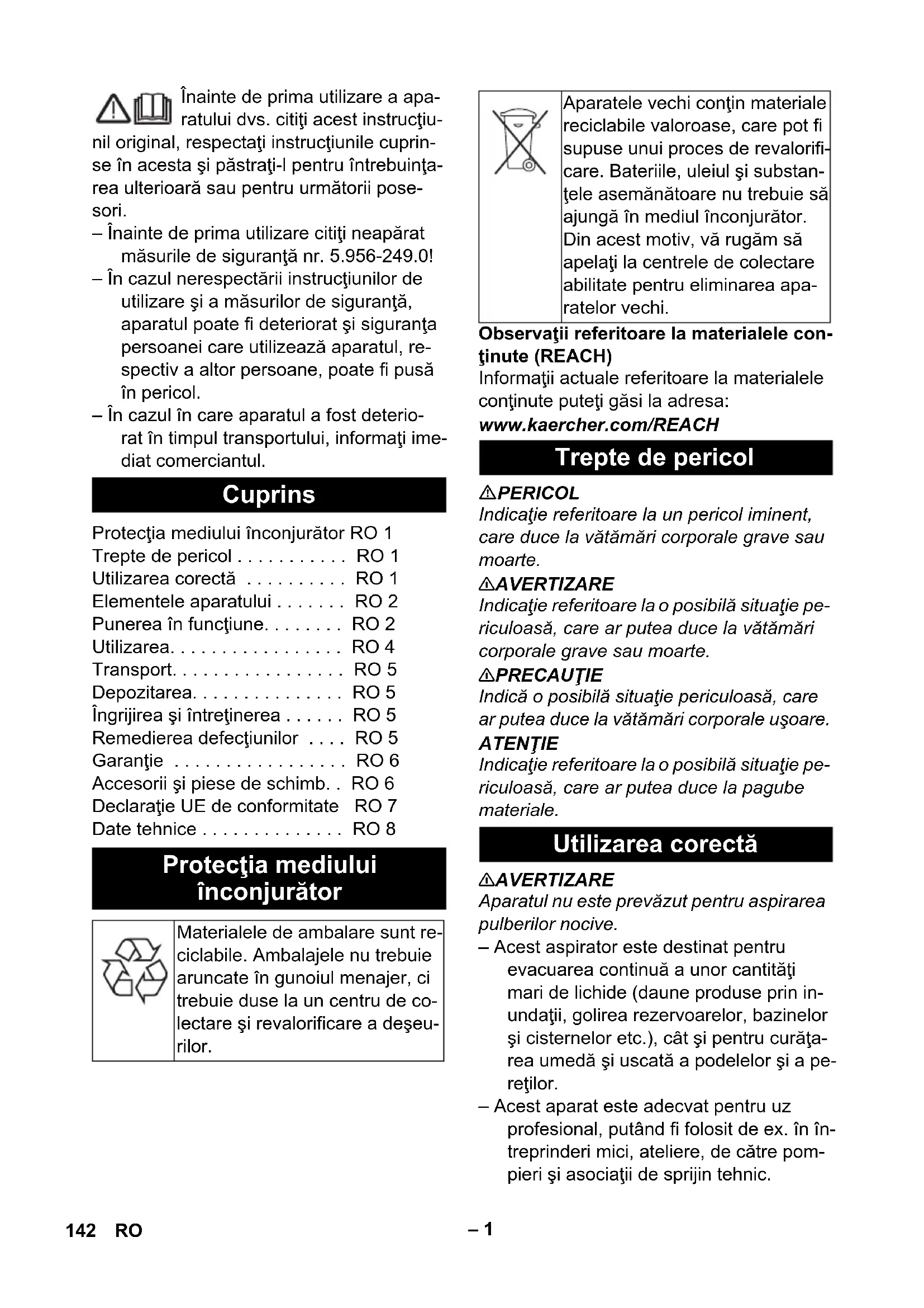 Nr części Długość kabla EU 6.649-875.0 10 m 141PL– 1 Înainte de prima utilizare a apa- ratului dvs. citiţi acest instrucţiu- nil original, respectaţi instrucţiunile cuprin- se în acesta şi păstraţi-l pentru întrebuinţa- rea ulterioară sau pentru următorii pose- sori. – Înainte de prima utilizare citiţi neapărat măsurile de siguranţă nr. 5.956-249.0! – În cazul nerespectării instrucţiunilor de utilizare şi a măsurilor de siguranţă, aparatul poate fi deteriorat şi siguranţa persoanei care utilizează aparatul, re- spectiv a altor persoane, poate fi pusă în pericol. – În cazul în care aparatul a fost deterio- rat în timpul transportului, informaţi ime- diat comerciantul. Observaţii referitoare la materialele con- ţinute (REACH) Informaţii actuale referitoare la materialele conţinute puteţi găsi la adresa: www.kaercher.com/REACH PERICOL Indicaţie referitoare la un pericol iminent, care duce la vătămări corporale grave sau moarte. 몇 AVERTIZARE Indicaţie referitoare la o posibilă situaţie pe- riculoasă, care ar putea duce la vătămări corporale grave sau moarte. 몇 PRECAUŢIE Indică o posibilă situaţie periculoasă, care ar putea duce la vătămări corporale uşoare. ATENŢIE Indicaţie referitoare la o posibilă situaţie pe- riculoasă, care ar putea duce la pagube materiale. 몇 AVERTIZARE Aparatul nu este prevăzut pentru aspirarea pulberilor nocive. – Acest aspirator este destinat pentru evacuarea continuă a unor cantităţi mari de lichide (daune produse prin in- undaţii, golirea rezervoarelor, bazinelor şi cisternelor etc.), cât şi pentru curăţa- rea umedă şi uscată a podelelor şi a pe- reţilor. – Acest aparat este adecvat pentru uz profesional, putând fi folosit de ex. în în- treprinderi mici, ateliere, de către pom- pieri şi asociaţii de sprijin tehnic. Cuprins Protecţia mediului înconjurător RO 1 Trepte de pericol . . . . . . . . . . . RO 1 Utilizarea corectă . . . . . . . . . . RO 1 Elementele aparatului . . . . . . . RO 2 Punerea în funcţiune. . . . . . . . RO 2 Utilizarea. . . . . . . . . . . . . . . . . RO 4 Transport. . . . . . . . . . . . . . . . . RO 5 Depozitarea. . . . . . . . . . . . . . . RO 5 Îngrijirea şi întreţinerea . . . . . . RO 5 Remedierea defecţiunilor . . . . RO 5 Garanţie . . . . . . . . . . . . . . . . . RO 6 Accesorii şi piese de schimb. . RO 6 Declaraţie UE de conformitate RO 7 Date tehnice . . . . . . . . . . . . . . RO 8 Protecţia mediului înconjurător Materialele de ambalare sunt re- ciclabile. Ambalajele nu trebuie aruncate în gunoiul menajer, ci trebuie duse la un centru de co- lectare şi revalorificare a deşeu- rilor. Aparatele vechi conţin materiale reciclabile valoroase, care pot fi supuse unui proces de revalorifi- care. Bateriile, uleiul şi substan- ţele asemănătoare nu trebuie să ajungă în mediul înconjurător. Din acest motiv, vă rugăm să apelaţi la centrele de colectare abilitate pentru eliminarea apa- ratelor vechi. Trepte de pericol Utilizarea corectă 142 RO– 2 1 Plutitorul 2 Cablu de reţea 3 Ştecăr aparat 4 Furtun pentru aspirare 5 Zăvor cap de aspirare 6 Recipient pentru murdărie 7 Suport cablu pompă de evacuare 8 Plăcuţă de închidere 9 Suport role de ghidare 10 Rolă de ghidare 11 Duză pentru sol 12 Manetă pentru reglarea înălţimii duzei de podea 13 Tub de aspirare 14 Ştuţul de aspirare 15 Cap de aspirare 16 Pompă de evacuare 17 Piuliţă olandeză pompă de evacuare 18 Mâner pentru transport 19 Capacul filtrului 20 Bară de manevrare 21 Cot 22 Comutator plutitor pompă de evacuare 23 Prefiltru 24 Ştecher pompă de evacuare 25 Comutator „OPRIRE pompă de evacu- are“ 26 Priză 27 Comutator „PORNIRE pompă de eva- cuare“ 28 Întrerupător principal 29 Filtru de aer uzat 30 Filtru pentru murdărie grosieră/cu pliuri plate 31 Furtun de evacuare 32 Capac de închidere (cuplaj GEKA-C) 33 Cârlig pentru cablu 34 Plăcuţa de tip Aparatul permite 3 regimuri de funcţionare: 1 Aspirare umedă cu pompă de evacuare 2 Aspirare umedă fără pompă de evacua-