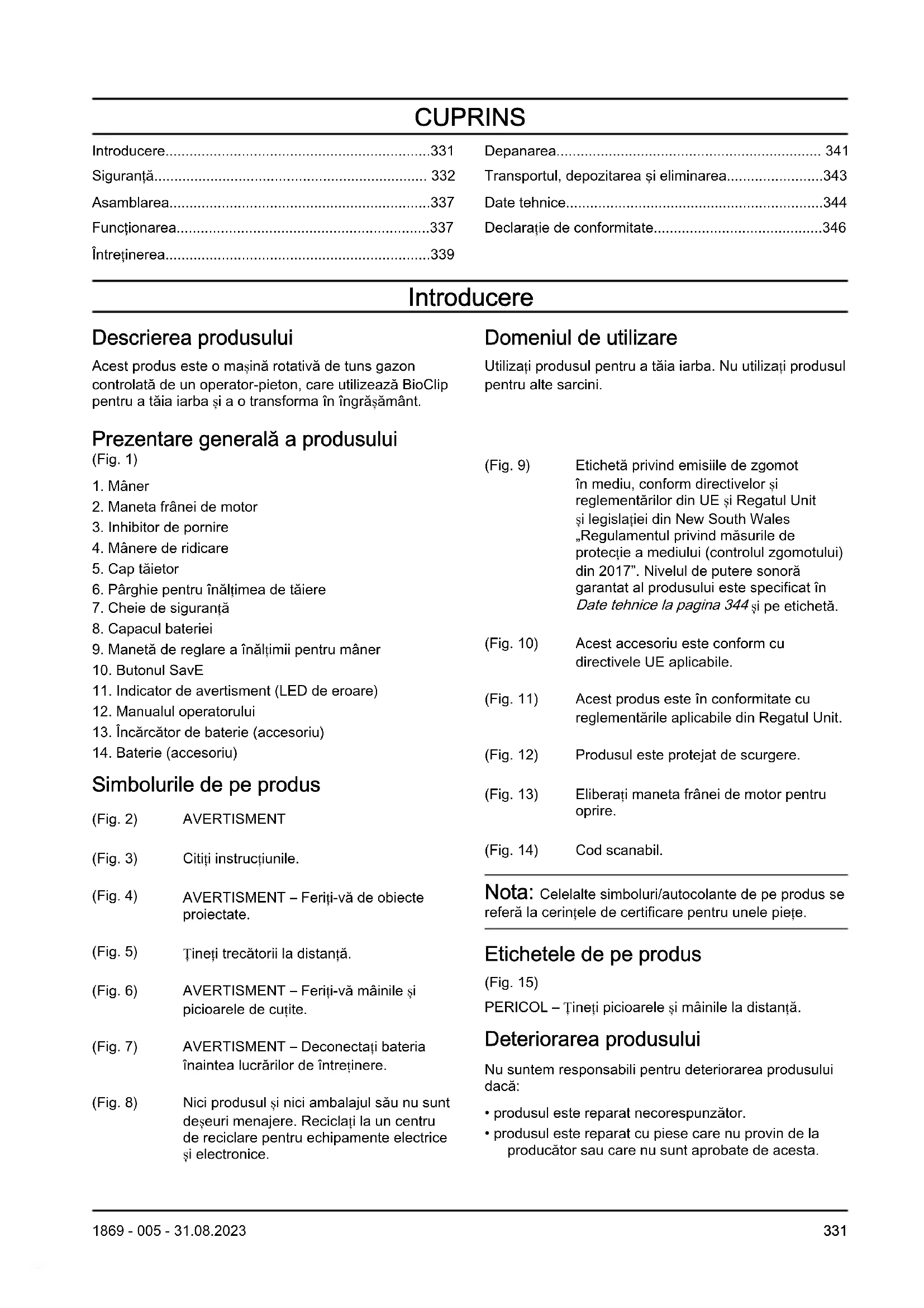 - Declarație de conformitate Introducere Descrierea produsului Acest produs este o mașină rotativă de tuns gazon controlată de un operator-pieton, care utilizează BioClip pentru a tăia iarba și a o transforma în îngrășământ. Domeniul de utilizare Utilizați produsul pentru a tăia iarba. Nu utilizați produsul pentru alte sarcini. Prezentare generală a produsului (Fig. 1) p. 346