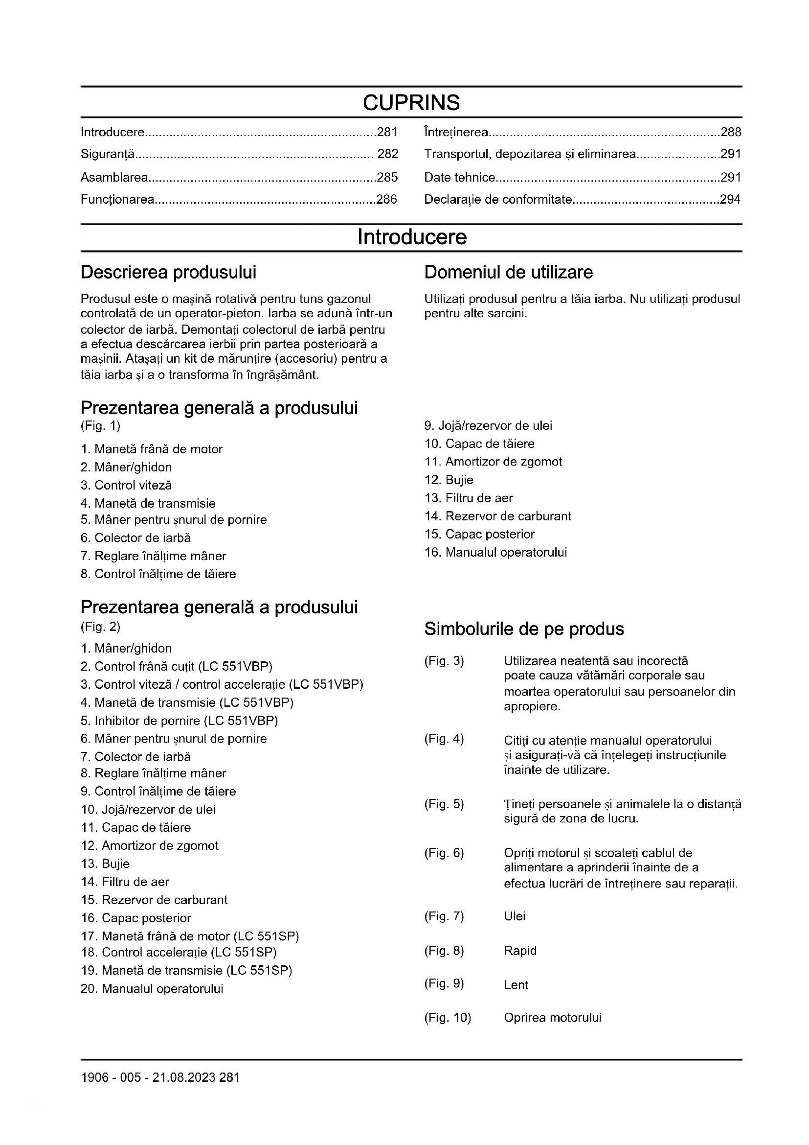 - Declarație de conformitate Introducere Descrierea produsului Produsul este o mașină rotativă pentru tuns gazonul controlată de un operator-pieton. Iarba se adună într-un colector de iarbă. Demontați colectorul de iarbă pentru a efectua descărcarea ierbii prin partea posterioară a mașinii. Atașați un kit de mărunțire (accesoriu) pentru a tăia iarba și a o transforma în îngrășământ. Domeniul de utilizare Utilizați produsul pentru a tăia iarba. Nu utilizați produsul pentru alte sarcini. Prezentarea generală a produsului (Fig. 1) p. 294