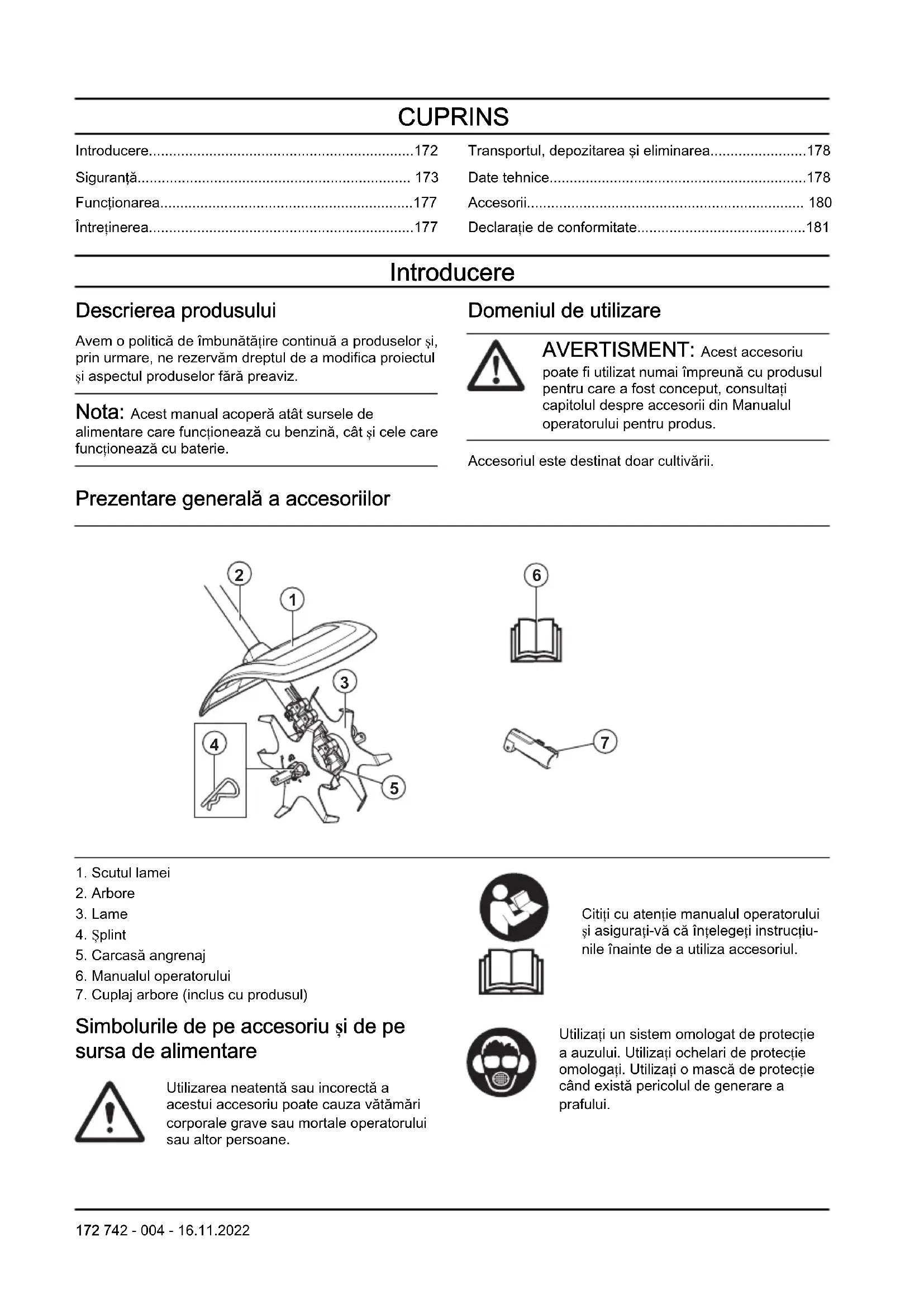 - Declarație de conformitate Introducere Descrierea produsului Avem o politică de îmbunătățire continuă a produselor și, prin urmare, ne rezervăm dreptul de a modifica proiectul și aspectul produselor fără preaviz. Nota: Acest manual acoperă atât sursele de alimentare care funcționează cu benzină, cât și cele care funcționează cu baterie. Domeniul de utilizare AVERTISMENT: Acest accesoriu poate fi utilizat numai împreună cu produsul pentru care a fost conceput, consultați capitolul despre accesorii din Manualul operatorului pentru produs. Accesoriul este destinat doar cultivării. Prezentare generală a accesoriilor p. 181