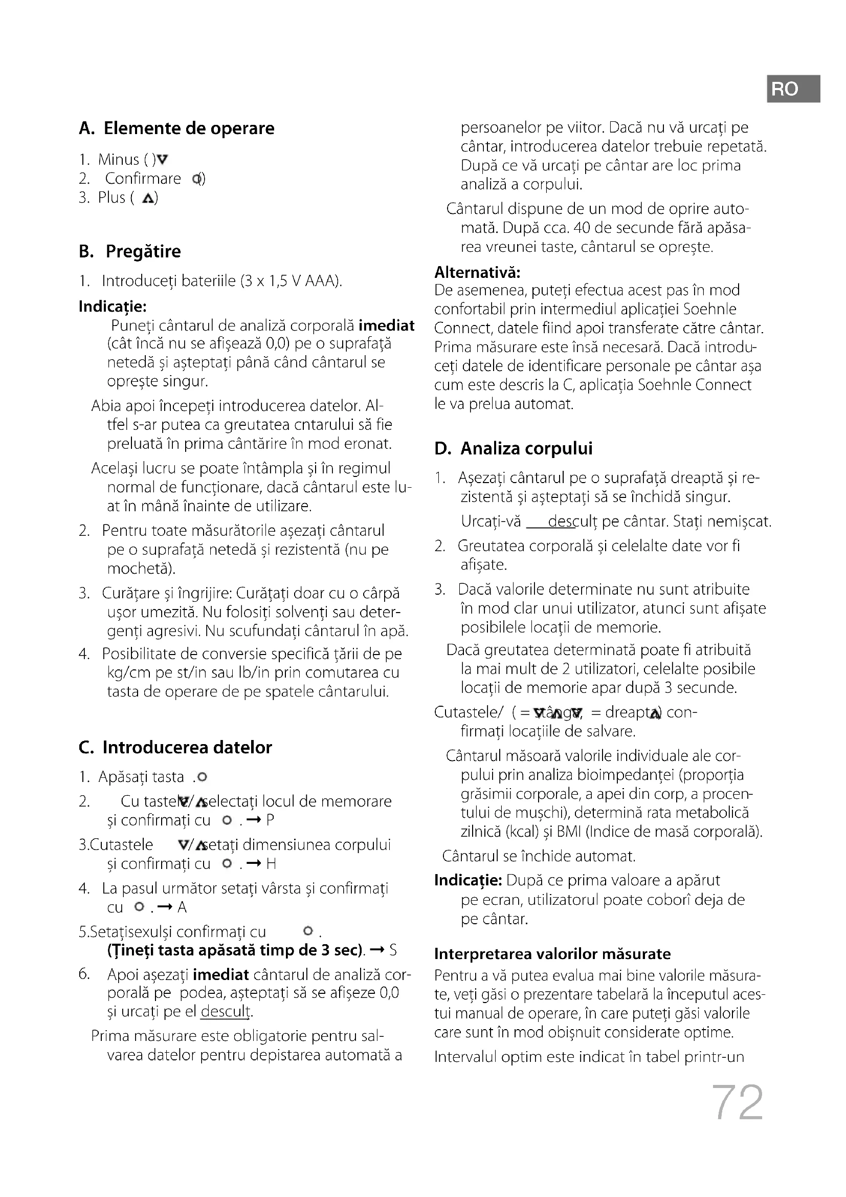 tului de mușchi), determină rata metabolică zilnică (kcal) și BMI (Indice de masă corporală). Cântarul se închide automat. Indicație: După ce prima valoare a apărut pe ecran, utilizatorul poate coborî deja de pe cântar. Interpretarea valorilor măsurate Pentru a vă putea evalua mai bine valorile măsura- te, veți găsi o prezentare tabelară la începutul aces- tui manual de operare, în care puteți găsi valorile care sunt în mod obișnuit considerate optime. Intervalul optim este indicat în tabel printr-un73