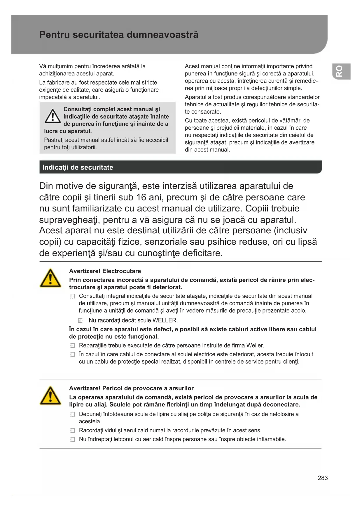 Pentru securitatea dumneavoastră Vămulţumimpentruîncredereaarătatăla achiziţionareaacestuiaparat. La fabricare au fost respectate cele mai stricte exigenţedecalitate,careasigurăofuncţionare impecabilăaaparatului. Consultaţi complet acest manual şi indicaţiile de securitate ataşate înainte de punerea în funcţiune şi înainte de a lucra cu aparatul. Păstraţiacestmanualastfelîncâtsăeaccesibil pentrutoţiutilizatorii. Acestmanualconţineinformaţiiimportanteprivind punereaînfuncţiunesigurăşicorectăaaparatului, operareacuacesta,întreţinereacurentăşiremedie- reaprinmijloacepropriiadefecţiunilorsimple. Aparatulafostproduscorespunzătoarestandardelor tehnicedeactualitateşiregulilortehnicedesecurita- te consacrate. Cutoateacestea,existăpericoluldevătămăride persoaneşiprejudiciimateriale,încazulîncare nurespectaţiindicaţiiledesecuritatedincaietulde siguranţăataşat,precumşiindicaţiiledeavertizare din acest manual. Indicaţii de securitate Dinmotivedesiguranţă,esteinterzisăutilizareaaparatuluide cătrecopiişitineriisub16ani,precumşidecătrepersoanecare nu sunt familiarizate cu acest manual de utilizare. Copiii trebuie supravegheaţi,pentruavăasiguracănusejoacăcuaparatul. Acestaparatnuestedestinatutilizăriidecătrepersoane(inclusiv copii)cucapacităţizice,senzorialesaupsihicereduse,oriculipsă deexperienţăşi/saucucunoştinţedecitare. Avertizare! Electrocutare Prin conectarea incorectă a aparatului de comandă, există pericol de rănire prin elec- trocutare şi aparatul poate deteriorat. Consultaţiintegralindicaţiiledesecuritateataşate,indicaţiiledesecuritatedinacestmanual deutilizare,precumşimanualulunităţiidumneavoastrădecomandăînaintedepunereaîn funcţiuneaunităţiidecomandăşiaveţiînvederemăsuriledeprecauţieprezentateacolo. NuracordaţidecâtsculeWELLER. În cazul în care aparatul este defect, e posibil să existe cabluri active libere sau cablul de protecţie nu este funcţional. ReparaţiiletrebuieexecutatedecătrepersoaneinstruitedermaWeller. Încazulîncarecabluldeconectarealsculeielectriceestedeteriorat,acestatrebuieînlocuit cuuncabludeprotecţiespecialrealizat,disponibilîncentreledeservicepentruclienţi. Avertizare! Pericol de provocare a arsurilor La operarea aparatului de comandă, există pericol de provocare a arsurilor la scula de lipire cu aliaj. Sculele pot rămâne erbinţi un timp îndelungat după deconectare. Depuneţiîntotdeaunasculadelipirecualiajpepoliţadesiguranţăîncazdenefolosirea acesteia. Racordaţividulşiaerulcaldnumailaracordurileprevăzuteînacestsens. Nuîndreptaţiletconulcuaercaldînsprepersoanesauînspreobiecteinamabile. RO284