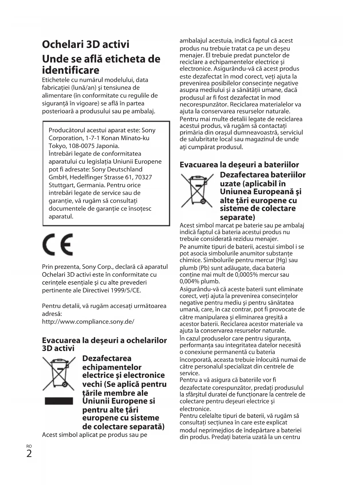 Ochelari 3D activi Unde se află eticheta de identificare Etichetele cu numărul modelului, data fabricaţiei (lună/an) şi tensiunea de alimentare (în conformitate cu regulile de siguranţă în vigoare) se află în partea posterioară a produsului sau pe ambalaj. Producătorul acestui aparat este: Sony Corporation, 1-7-1 Konan Minato-ku Tokyo, 108-0075 Japonia. Întrebări legate de conformitatea aparatului cu legislația Uniunii Europene pot fi adresate: Sony Deutschland GmbH, Hedelfinger Strasse 61, 70327 Stuttgart, Germania. Pentru orice intrebări legate de service sau de garanţie, vă rugăm să consultaţi documentele de garanţie ce însoţesc aparatul. Prin prezenta, Sony Corp., declară că aparatul Ochelari 3D activi este în conformitate cu cerinţele esenţiale şi cu alte prevederi pertinente ale Directivei 1999/5/CE. Pentru detalii, vă rugăm accesaţi următoarea adresă: http://www.compliance.sony.de/ Evacuarea la deşeuri a ochelarilor 3D activi Dezafectarea echipamentelor electrice şi electronice vechi (Se aplică pentru ţările membre ale Uniunii Europene si pentru alte ţări europene cu sisteme de colectare separată) Acest simbol aplicat pe produs sau pe ambalajul acestuia, indică faptul că acest produs nu trebuie tratat ca pe un deşeu menajer. El trebuie predat punctelor de reciclare a echipamentelor electrice şi electronice. Asigurându-vă că acest produs este dezafectat în mod corect, veţi ajuta la prevenirea posibilelor consecinţe negative asupra mediului şi a sănătăţii umane, dacă produsul ar fi fost dezafectat în mod necorespunzător. Reciclarea materialelor va ajuta la conservarea resurselor naturale. Pentru mai multe detalii legate de reciclarea acestui produs, vă rugăm să contactaţi primăria din oraşul dumneavoastră, serviciul de salubritate local sau magazinul de unde aţi cumpărat produsul. Evacuarea la deşeuri a bateriilor Dezafectarea bateriilor uzate (aplicabil în Uniunea Europeană şi alte ţări europene cu sisteme de colectare separate) Acest simbol marcat pe baterie sau pe ambalaj indică faptul că bateria acestui produs nu trebuie considerată reziduu menajer. Pe anumite tipuri de baterii, acestui simbol i se pot asocia simbolurile anumitor substanţe chimice. Simbolurile pentru mercur (Hg) sau plumb (Pb) sunt adăugate, daca bateria conţine mai mult de 0,0005% mercur sau 0,004% plumb. Asigurându-vă că aceste baterii sunt eliminate corect, veţi ajuta la prevenirea consecinţelor negative pentru mediu şi pentru sănătatea umană, care, în caz contrar, pot fi provocate de către manipularea şi eliminarea greşită a acestor baterii. Reciclarea acestor materiale va ajuta la conservarea resurselor naturale. În cazul produselor care pentru siguranţa, performanţa sau integritatea datelor necesită o conexiune permanentă cu bateria încorporată, aceasta trebuie înlocuită numai de către personalul specializat din centrele de service. Pentru a vă asigura că bateriile vor fi dezafectate corespunzător, predaţi produsulul la sfârşitul duratei de funcţionare la centrele de colectare pentru deşeuri electrice şi electronice. Pentru celelalte tipuri de baterii, vă rugăm să consultaţi secţiunea în care este explicat modul neprimejdios de îndepărtare a bateriei din produs. Predaţi bateria uzată la un centru3