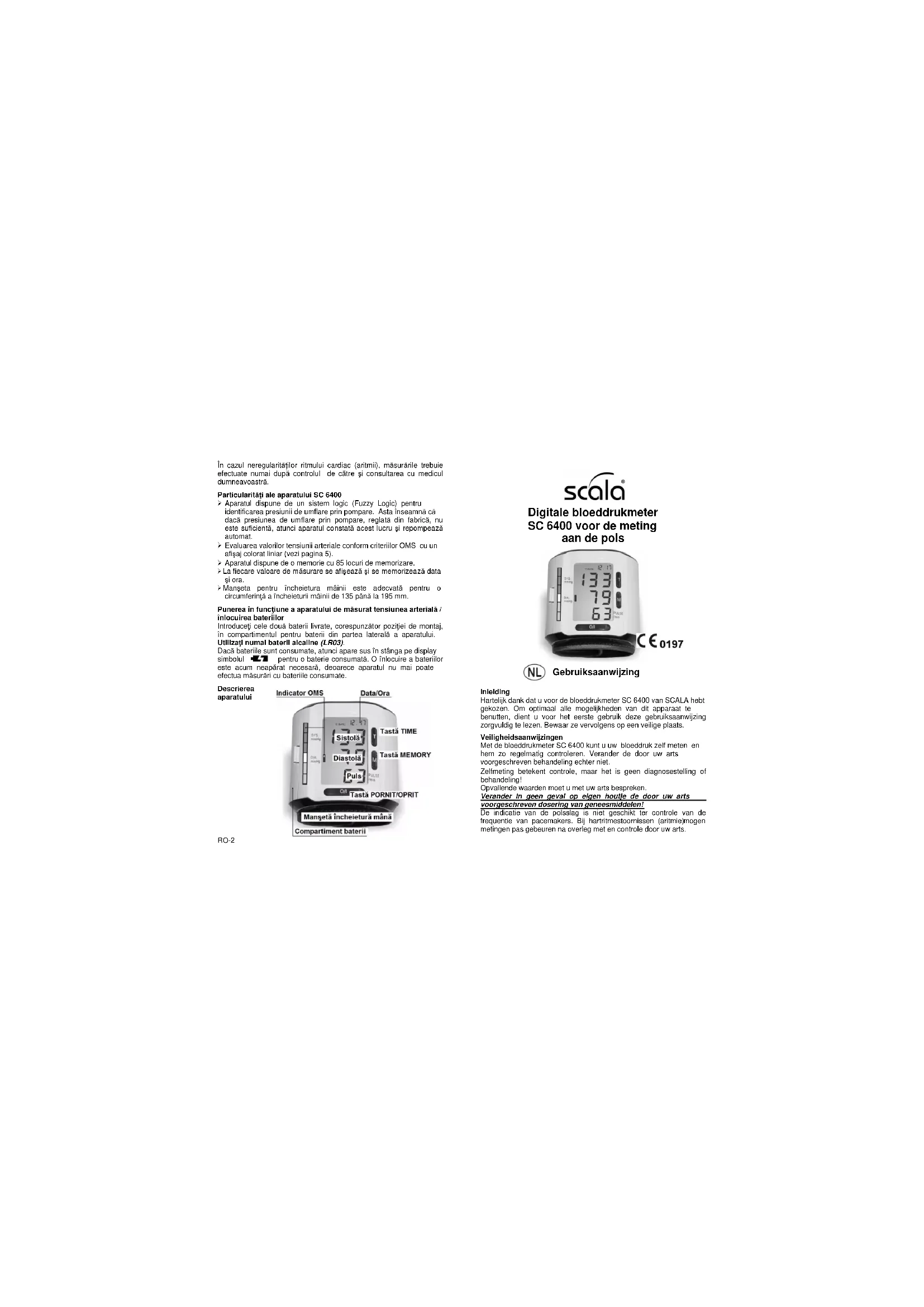 Instrucţiuni de utilizare Introducere Vă mulţumim că v-aţi decis pentru aparatul de măsurat tensiunea arterială SC 6400. Pentru a putea folosi toate posibilităţile acestui aparat vă rugăm să citiţi cu atenţie înainte de prima utilizare aceste instrucţiuni de utilizare şi să le păstraţi apoi bine. Indicaţii de siguranţă Cu aparatul de măsurat tensiunea arterială SC 6400 puteţi măsura singur tensiunea arterială a dumneavoastră şi o puteţi controla astfel periodic, dar vă rugăm să nu schimbaţi tratamentul prescris de medicul dumneavoastră. Măsurarea proprie înseamnă control, dar nu şi o stabilire a diagnosticului sau un tratament! Valorile neobişnuite ale măsurării trebuie discutate cu medicul dumneavoastră. Nu modificaţi în nici un caz dozarea de medicamente prescrisă de medicul dumneavoastră Indicaţia pulsului nu este adecvată pentru controlul frecvenţii stimulatorului cardiac.În cazul neregularităţilor ritmului cardiac (aritmii), măsurările trebuie efectuate numai după controlul de către şi consultarea cu medicul dumneavoastră. Particularităţi ale aparatului SC 6400 Aparatul dispune de un sistem logic (Fuzzy Logic) pentru identificarea presiunii de umflare prin pompare. Asta înseamnă că dacă presiunea de umflare prin pompare, reglată din fabrică, nu este suficientă, atunci aparatul constată acest lucru şi repompează automat. Evaluarea valorilor tensiunii arteriale conform criteriilor OMS cu un afişaj colorat liniar (vezi pagina 5). Aparatul dispune de o memorie cu 85 locuri de memorizare. La fiecare valoare de măsurare se afişează şi se memorizează data şi ora. Manşeta pentru încheietura mâinii este adecvată pentru o circumferinţă a încheieturii mâinii de 135 până la 195 mm. Punerea în funcţiune a aparatului de măsurat tensiunea arterială / înlocuirea bateriilor Introduceţi cele două baterii livrate, corespunzător poziţiei de montaj, în compartimentul pentru baterii din partea laterală a aparatului. Utilizaţi numai baterii alcaline (LR03). Dacă bateriile sunt consumate, atunci apare sus în stânga pe display simbolul pentru o baterie consumată. O înlocuire a bateriilor este acum neapărat necesară, deoarece aparatul nu mai poate efectua măsurări cu bateriile consumate. Descrierea aparatului