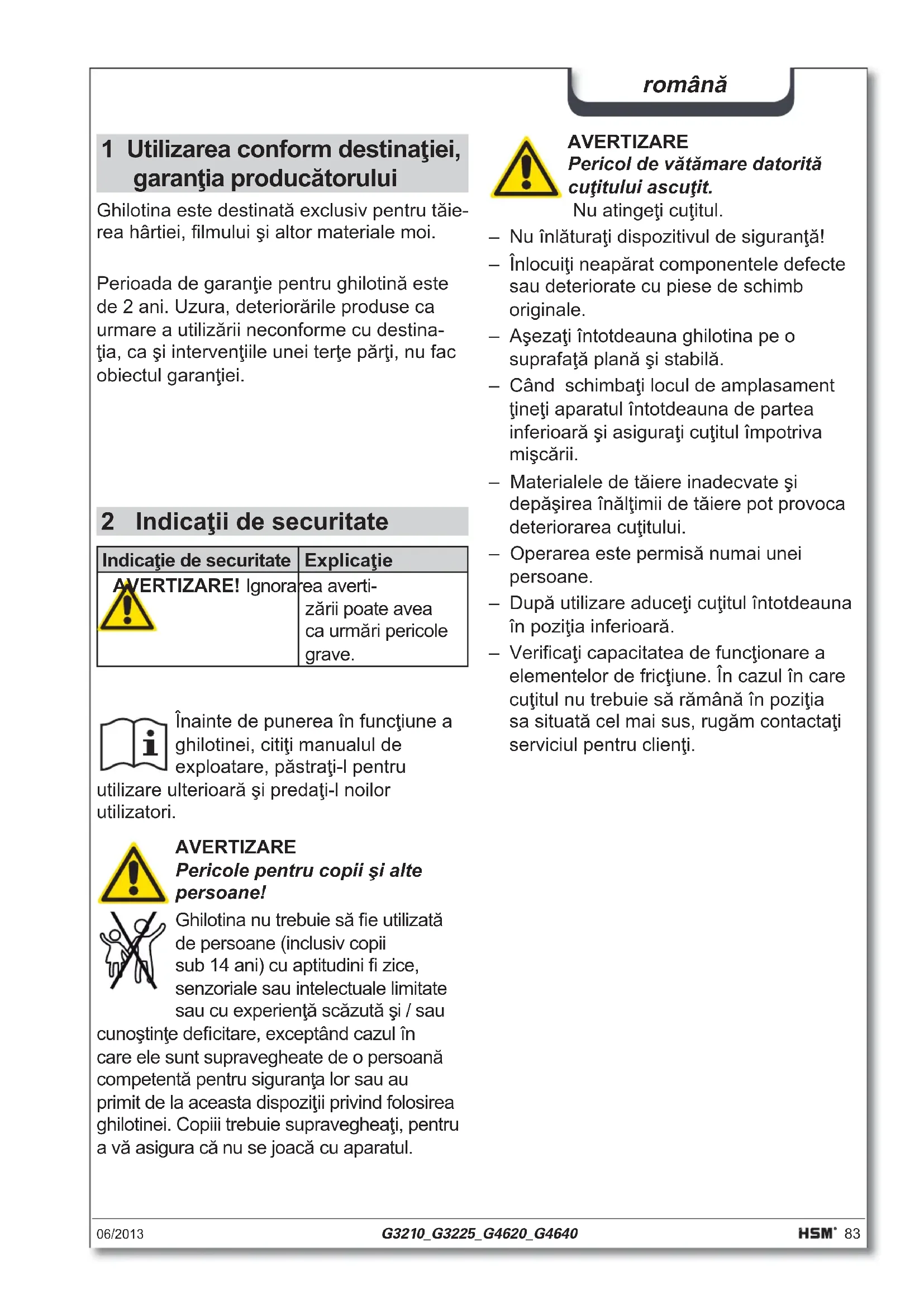 Max. vágásmagasság (mm) 1,0 2,5 2,0 4,0 Max. formátum A4 A4 A3 A3 Vágáshossz (mm) 325 325 460 460 Szorítás Kézi Automatikus Automatikus Automatikus Munkaasztal (mm) 325 x 155 325 x 230 460 x 230 460 x 320 Méretek (mm) 605 x 280 x 75 606 x 308 x 122 737 x 362 x 122 750 x 406 x 133 Tömeg (kg) 2,12 3,72 4,66 7,30 Megjegyzés: A karos vágógép tárolási helyigényének csökkentése és a kés szállításnál történő rögzítése érdekében a védőlemez átbillenthető. Ez azonban csak akkor lehetséges, ha a kés alsó helyzetben van.82 G3210_G3225_G4620_G4640 06/2013 magyar06/2013 G3210_G3225_G4620_G4640 83 română 1 Utilizarea conform destinaţiei, garanţia producătorului Ghilotina este destinată exclusiv pentru tăie- rea hârtiei, fi lmului şi altor materiale moi. Perioada de garanţie pentru ghilotină este de 2 ani. Uzura, deteriorările produse ca urmare a utilizării neconforme cu destina- ţia, ca şi intervenţiile unei terţe părţi, nu fac obiectul garanţiei. 2 Indicaţii de securitate Indicaţie de securitate Explicaţie AVERTIZARE! Ignorarea averti- zării poate avea ca urmări pericole grave. Înainte de punerea în funcţiune a ghilotinei, citiţi manualul de exploatare, păstraţi-l pentru utilizare ulterioară şi predaţi-l noilor utilizatori. AVERTIZARE Pericole pentru copii şi alte persoane! Ghilotina nu trebuie să fi e utilizată de persoane (inclusiv copii sub 14 ani) cu aptitudini fi zice, senzoriale sau intelectuale limitate sau cu experienţă scăzută şi / sau cunoştinţe defi citare, exceptând cazul în care ele sunt supravegheate de o persoană competentă pentru siguranţa lor sau au primit de la aceasta dispoziţii privind folosirea ghilotinei. Copiii trebuie supravegheaţi, pentru a vă asigura că nu se joacă cu aparatul. AVERTIZARE Pericol de vătămare datorită cuţitului ascuţit. Nu atingeţi cuţitul. – Nu înlăturaţi dispozitivul de siguranţă! – Înlocuiţi neapărat componentele defecte sau deteriorate cu piese de schimb originale. – Aşezaţi întotdeauna ghilotina pe o suprafaţă plană şi stabilă. – Când schimbaţi locul de amplasament ţineţi aparatul întotdeauna de partea inferioară şi asiguraţi cuţitul împotriva mişcării. – Materialele de tăiere inadecvate şi depăşirea înălţimii de tăiere pot provoca deteriorarea cuţitului. – Operarea este permisă numai unei persoane. – După utilizare aduceţi cuţitul întotdeauna în poziţia inferioară. – Veri fi caţi capacitatea de funcţionare a elementelor de fricţiune. În cazul în care cuţitul nu trebuie să rămână în poziţia sa situată cel mai sus, rugăm contactaţi serviciul pentru clienţi.84 G3210_G3225_G4620_G4640 06/2013 română