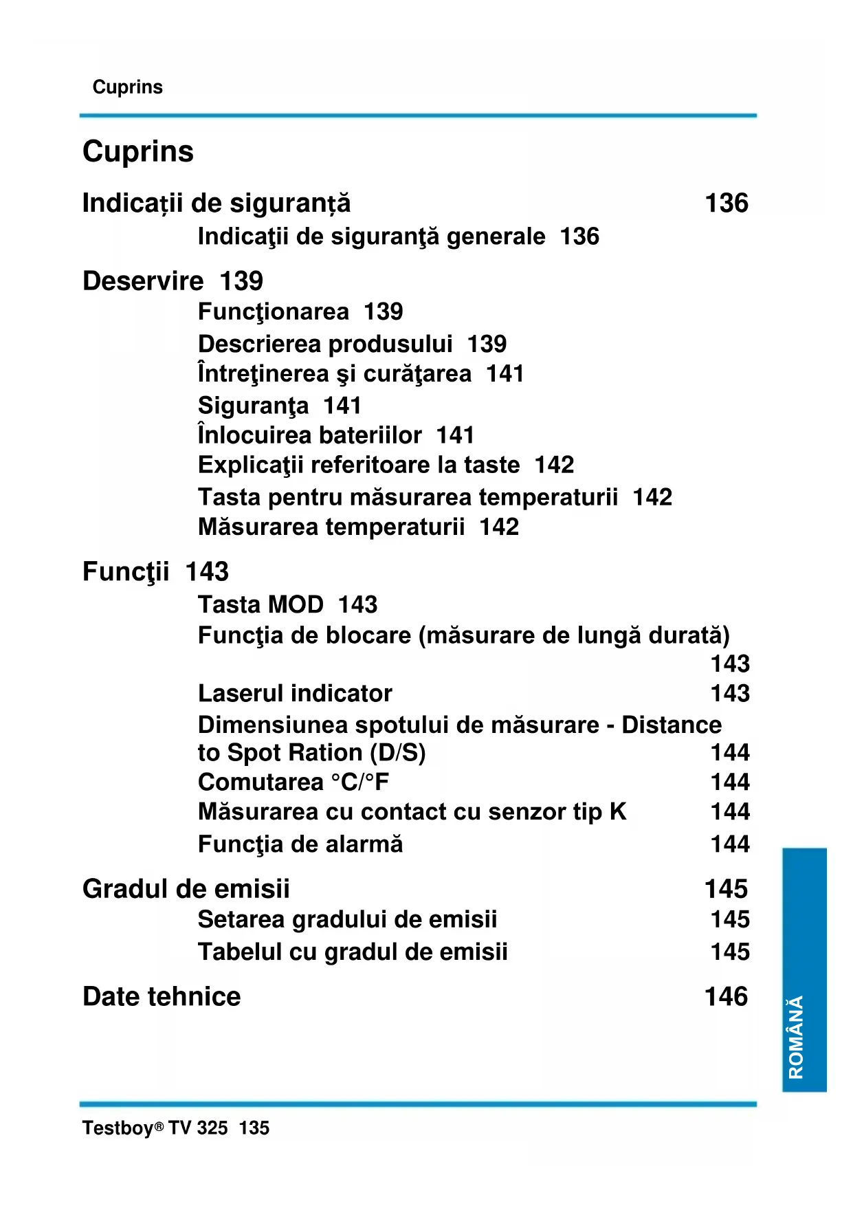 Laserul indicator 143 Dimensiunea spotului de măsurare - Distance to Spot Ration (D/S) 144 Comutarea °C/°F 144 Măsurarea cu contact cu senzor tip K 144 Funcţia de alarmă 144 Gradul de emisii 145 Setarea gradului de emisii 145 Tabelul cu gradul de emisii 145 Date tehnice 146Indicații de siguranță 136 Testboy